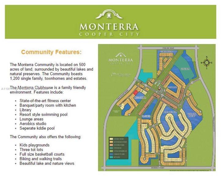 MOTIVATED SELLER! ENTERTAINING OFFERS! THOUGHTFULLY DESIGNED 4-BED, 3-BATH RESIDENCE WITHIN THE EXCLUSIVE GATED COMMUNITY OF MONTERRA IN COOPER CITY. WITH OVER 2,300 SQ. FT. OF LIVING SPACE, THE HOME FEATURES AN OPEN FLOOR PLAN WITH VOLUME CEILINGS, A WELL-APPOINTED KITCHEN THAT FLOWS INTO A COMFORTABLE FAMILY ROOM, WHILE THE SPACIOUS PRIMARY SUITE OFFERS GENEROUS WALK-IN CLOSETS AND A LUXURIOUS BATH COMPLETE WITH A ROMAN TUB, DUAL SINKS, AND A SEPARATE SHOWER. THE PRIVATE OUTDOOR SPACE IS IDEAL FOR ENTERTAINING, FEATURING A POOL AND INVITING GAZEBO. RESORT-STYLE AMENITIES INCLUDE CLUBHOUSE, FITNESS CENTER, BASKETBALL & TENNIS COURTS, TOT LOT, DOG PARK, AND WALKING TRAILS. A+ RATED SCHOOLS AND CONVENIENT ACCESS TO SHOPPING, DINING, HOUSE OF WORSHIP, AND MAJOR HIGHWAYS.