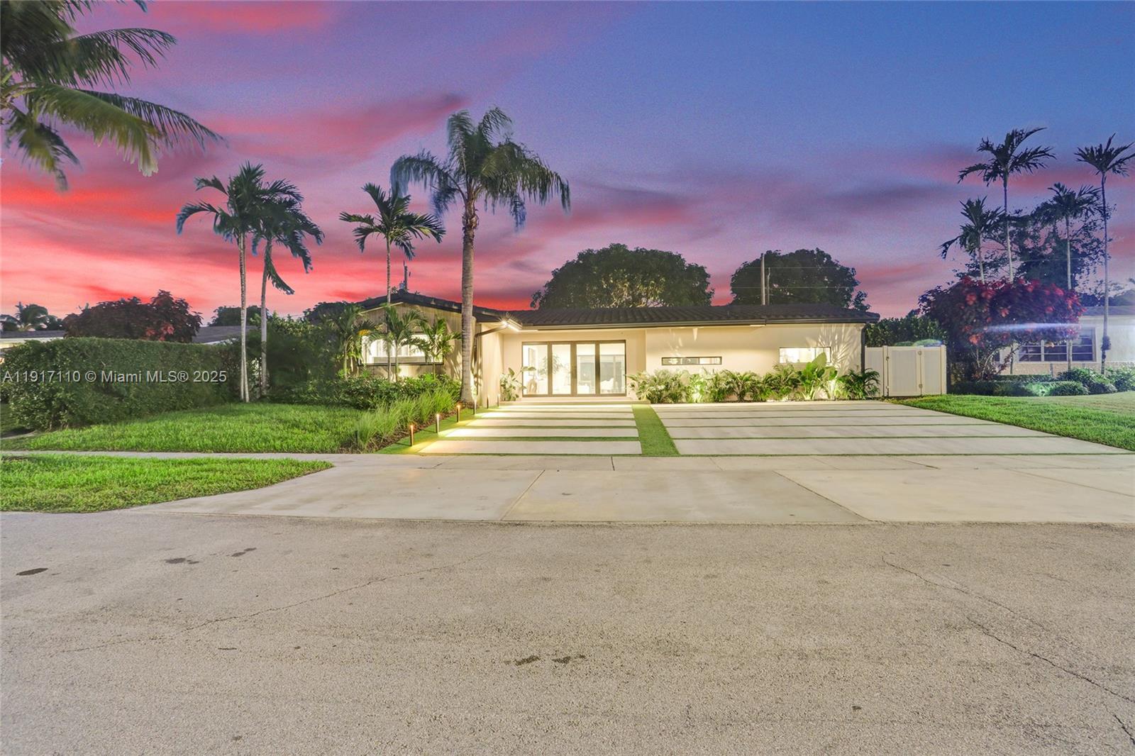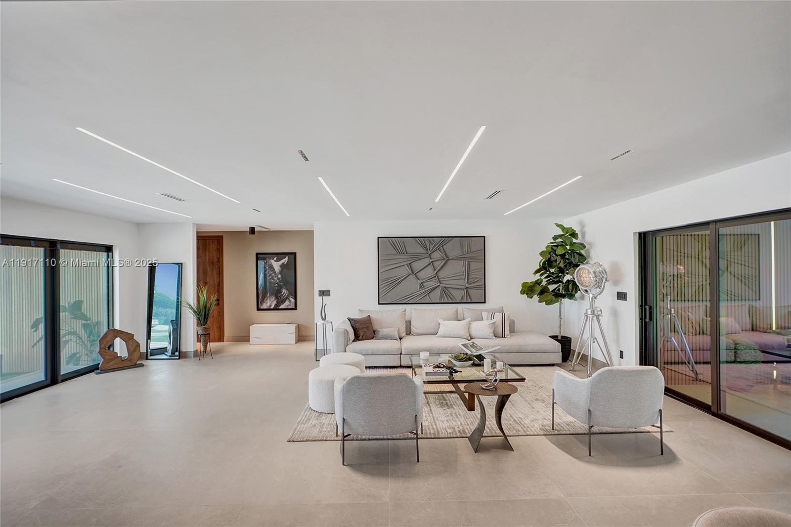 Stunning, fully remodeled modern home featuring clean architectural lines, warm natural tones, and top-quality finishes throughout. The open-concept layout highlights a sleek Italian-style kitchen with custom wood cabinetry, quartz countertops, and top-of-the-line appliances, including stainless steel appliances. This elegant residence features impact-resistant windows and doors, Italian-built-in closets, large porcelain floors, high ceilings, and designer LED lighting. The spacious living and dining areas are surrounded by glass sliders that fill the home with natural light and create a perfect indoor-outdoor flow. The outdoor space is designed for entertaining, featuring a built-in BBQ, artificial grass, and beautifully landscaped gardens. Every detail combines luxury and functionality