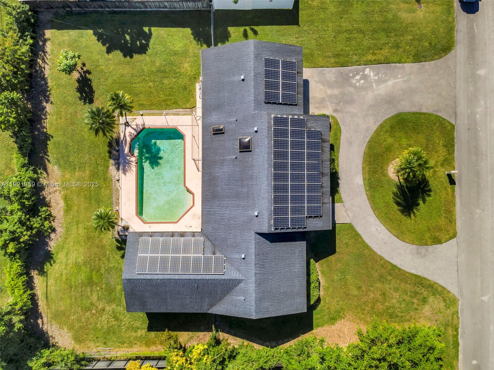 3-bedroom, 3-bath pool home offering exceptional upgrades, energy efficiency, and expanded living space. Enjoy peace of mind with full impact windows and doors, a 2018 roof, two newer A/C units (2022 & 2019), and three water heaters (one tank, two tankless). The home features tile flooring throughout, skylights that bring in natural light, and a water treatment filtration system. Two bedrooms have been thoughtfully combined to create a larger suite with an added bathroom, and approximately 30 sq. ft. has been added to the master bedroom for extra comfort. The property includes a Tesla wall and solar panels. The spacious circular driveway accommodates 6+ cars, complementing the 2-car garage where the washer and dryer are located. Outside, enjoy a private pool and ample space for entertaining.