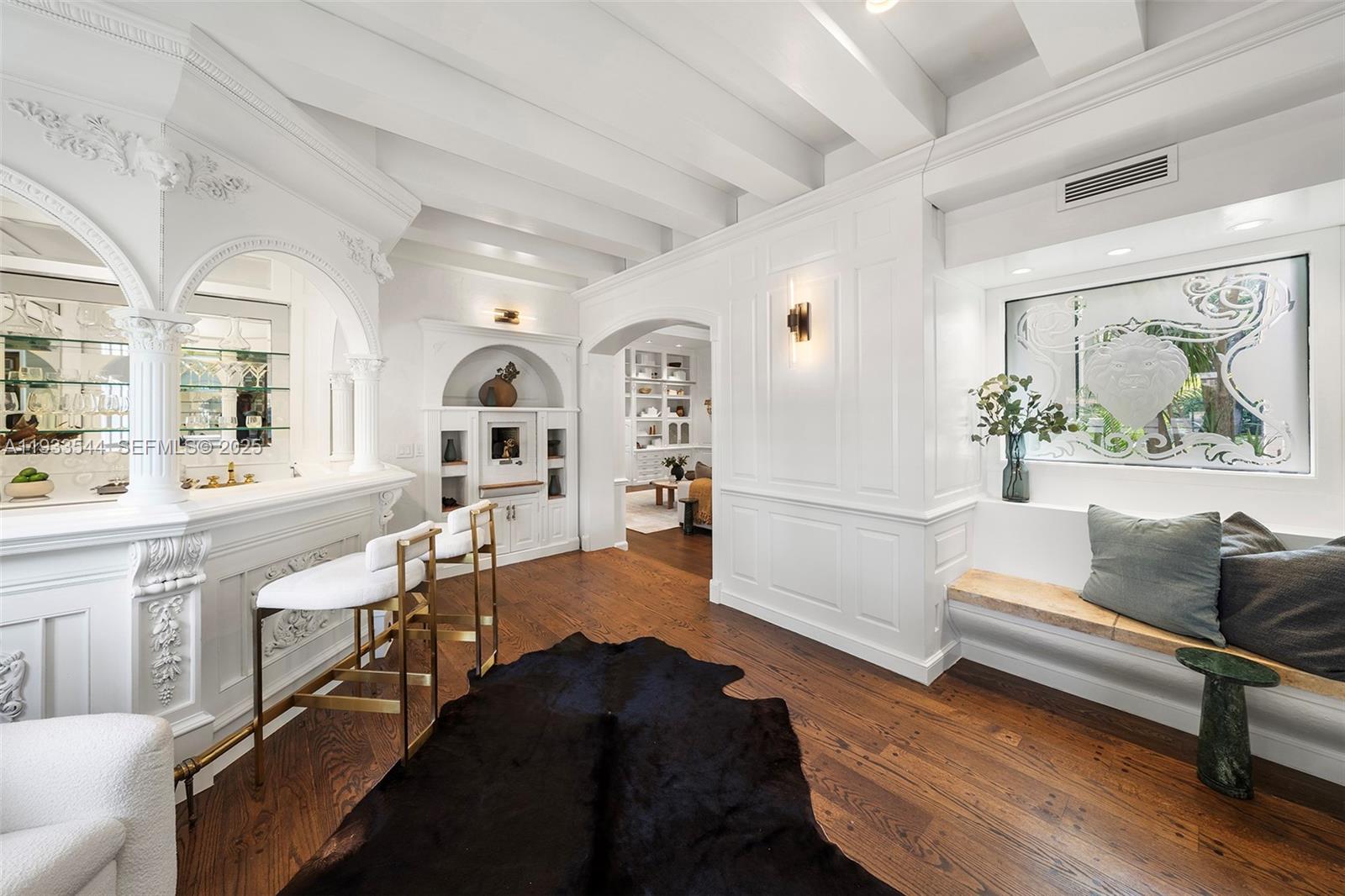 Rare mediterranean estate exuding sophistication and beach vibes in the heart of Miami Beach. Designed by acclaimed architect Carlos B. Schoeppl, this recently updated home is marked with striking original details, living room with cathedral beamed ceilings, fireplace, entertainment room with oak bar, library with soaring ceilings and masterful craftsmanship. The 31,320-SF double-platted corner lot stretching from Flamingo to Pinetree Drive, is secluded with tropical privacy landscape and complete with an immense backyard with lap pool, playground, and space for more amenities. Located minutes to the beach, Bayshore Park, Golf Course, South Beach. Own one of the largest dry lots in MB!