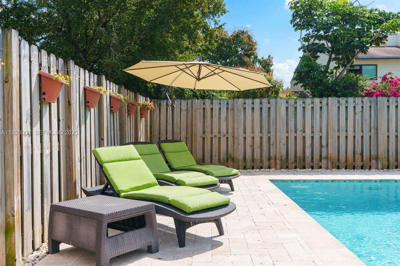 Rare opportunity! This Upgraded gem checks every box- tucked away at the end of a peaceful cul-de-sac in Palm-Aire Village, just steps from a private, fully fenced community park. Enjoy the South Florida lifestyle on the expansive patio with elegant marble pavers, a pristine pool and shade from mature trees. Features include a 2021 roof, 2016 A/C, electric roll down screened patio, and accordion hurricane shutters throughout. Super low HOA- No Approval needed. Quick access to Turnpike, a bike ride to the Inter Miami stadium, and Just minutes to the beach.