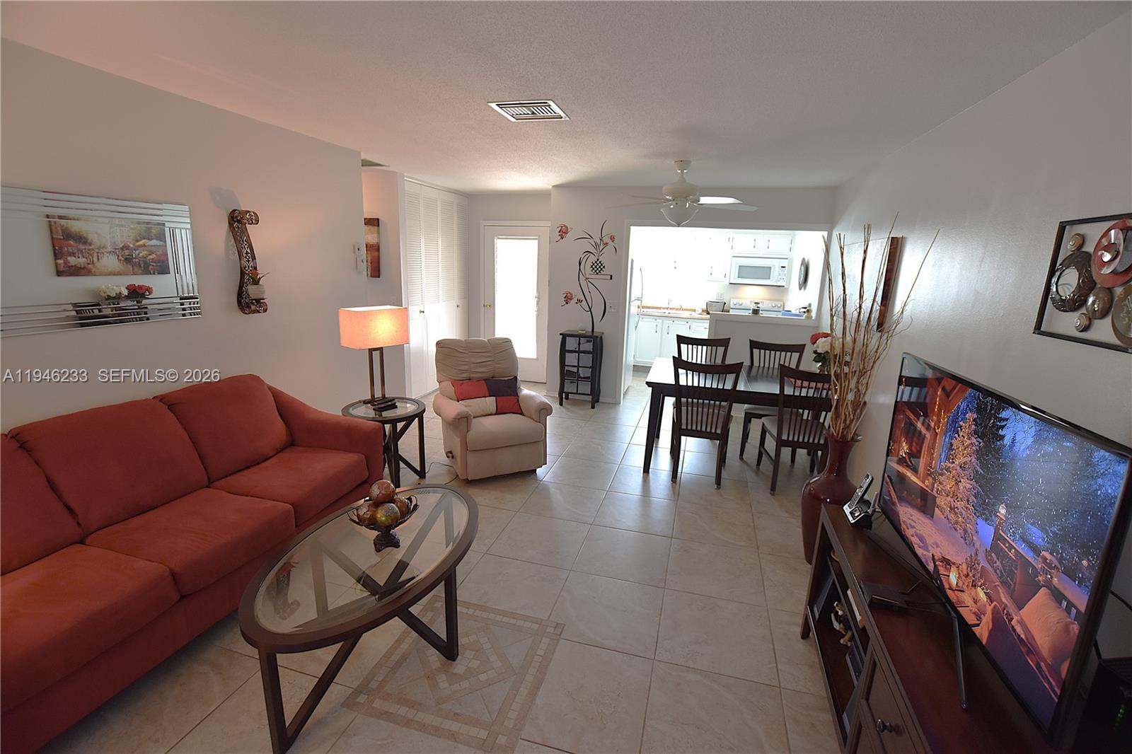 This 1/1.5 is sure to impress. Enjoy uniform ceramic tile flooring throughout, two updated bathrooms, new kitchen countertop with dishwasher and disposal. The kitchen wall has been opened up and more cabinets added. The roof is less than two years old; both the AC and water heater are newer. Move-in ready and tastefully furnished, with low HOA dues covering water, basic cable, and internet. Impact glass windows and a patio with a roll-down shutter system add extra peace of mind. Screened in patio and an additional patio behind with a perfect spot for grilling and simply hanging out.
