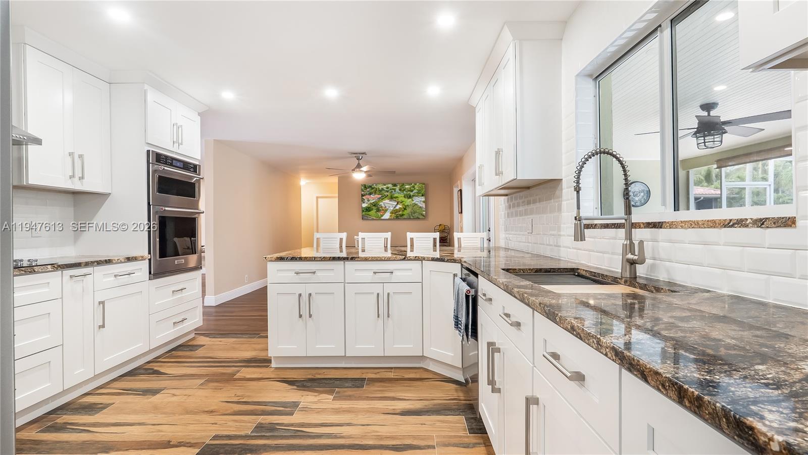 Welcome to this stunning 3-bedroom, 2-bath lakefront pool home on over an acre in the exclusive Davie Farmettes community. Designed for comfort and style, the property offers exceptional privacy and serene lake views. The open-concept layout is filled with natural light and enhanced by hurricane impact windows and doors. Recessed lighting, tile and luxury vinyl flooring, and plantation shutters create a bright, welcoming interior. The renovated kitchen features white cabinetry, granite countertops, stainless steel appliances, custom built-ins, a pantry, and a breakfast bar opening to the main living and dining areas. The primary suite is a private retreat with walk-in closet and en-suite bath. Spacious secondary bedrooms and a additional room offers flexibility for a home office or guests. Outdoor living is ideal for entertaining and relaxation, with an expansive screened patio overlooking the lake, a saltwater pool, new travertine tile and coping, lush tropical landscaping, hot tub and fire pit. The oversized lot offers excellent potential for expansion or customization. Additional highlights include NO HOA, a 2-car garage, extended driveway with RV or boat parking, metal roof, new PVC plumbing, a 2023 Rheem A/C, and custom storage shed. Conveniently located near shopping, dining, and major roadways, this is a rare opportunity to own a refined lakefront estate in Davie.