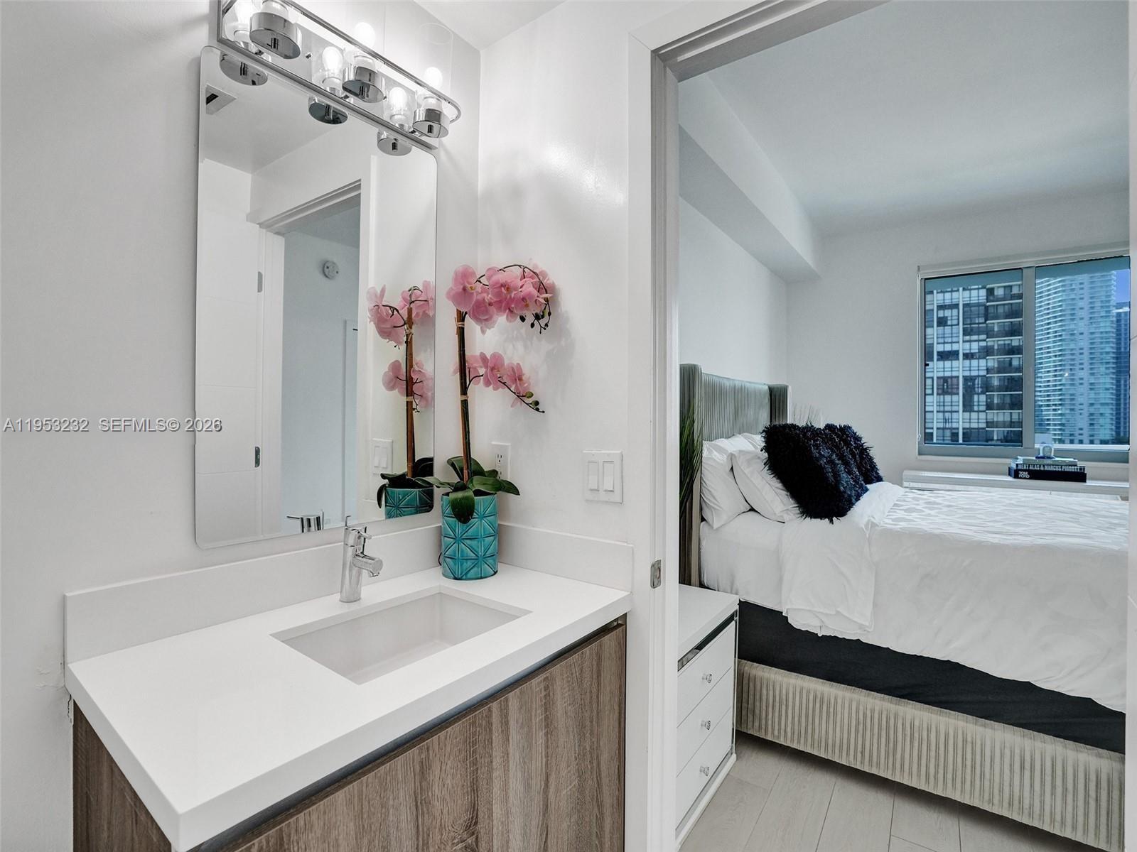 Immaculate and impeccably maintained 2-bedroom, 2-bath residence showcasing breathtaking bay and sunrise views. This fully renovated home features a sleek, modern kitchen with new stainless steel appliances, refined porcelain tile throughout, and a fresh designer paint finish. Thoughtfully curated for comfort and style, the residence offers seamless indoor living with a serene waterfront backdrop. Enjoy a full suite of resort-style amenities, including a pool, state-of-the-art fitness center, and business center. Ideally located just moments from premier dining, shopping, and entertainment. Includes one reserved parking space, 24/7 valet service as an added luxury, and a private storage unit. A truly turnkey offering in a prime location.