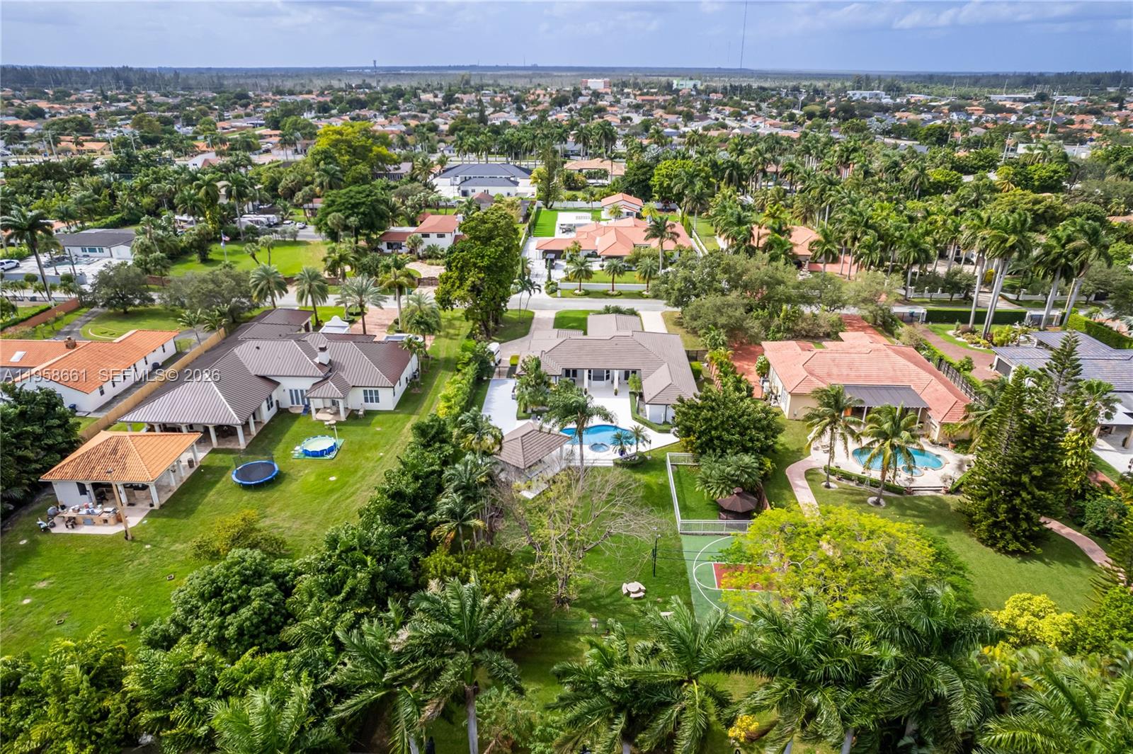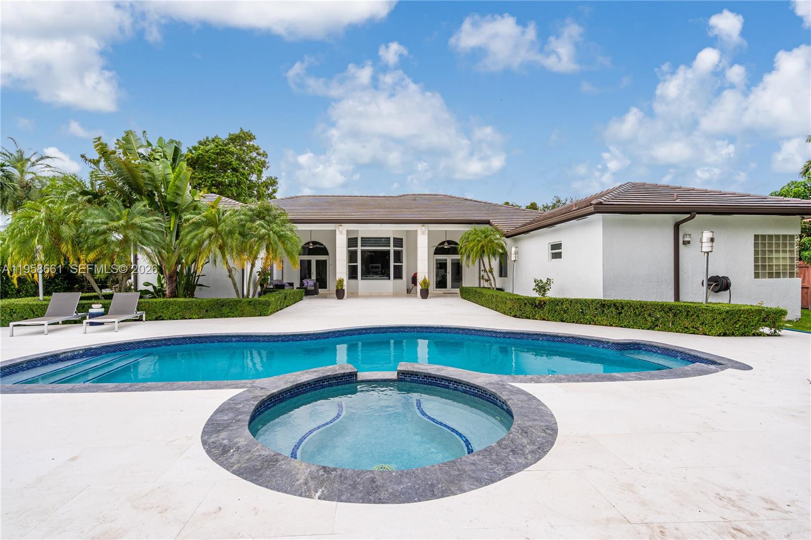 Welcome to your extraordinary dream residence! This luxurious, fully remodeled home offers 5 bedrooms, 4 bathrooms, and sits on an expansive 33,550 sq. ft. lot. Step outside and be captivated by the terrace with stunning views of your updated pool and jacuzzi, basketball court, and a gazebo complete with a full outdoor kitchen and sink, perfect for entertaining. Plus, enjoy the convenience of a full cabana bathroom, ideal for guests, outdoor living, and pool days. The exterior has been completely refreshed with impact-resistant windows and a freshly tiled terrace. Inside, you’ll love the tile flooring throughout, stylish wood cabinetry, quartz waterfall countertops, and custom-made closets. All bathrooms have been beautifully updated to the highest standards. The home also features a private bedroom wing behind a privacy door, offering a hallway with 4 bedrooms and 2 bathrooms. The fifth bedroom offers easy conversion to a second primary suite, with a full bathroom just outside the room off a private hallway. The primary suite is a true retreat, featuring dual walk-in closets and a spacious, beautifully renovated shower.