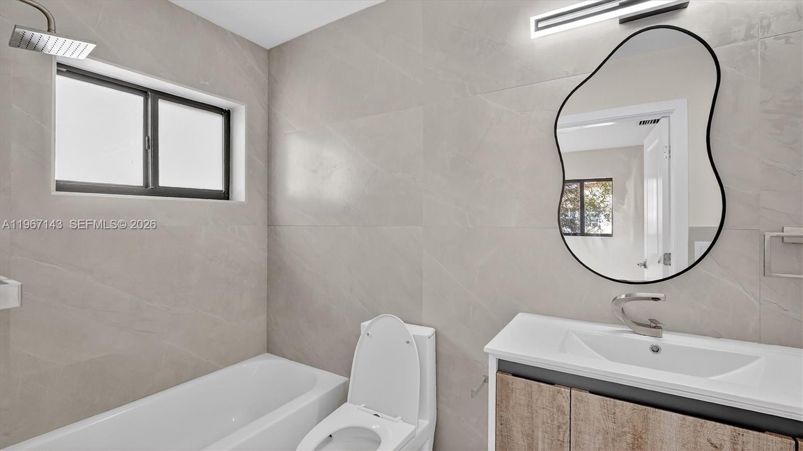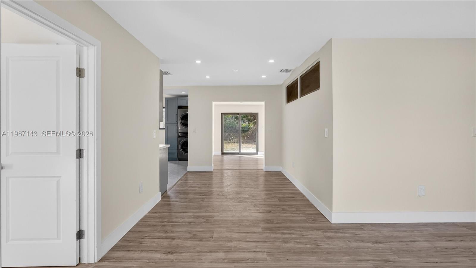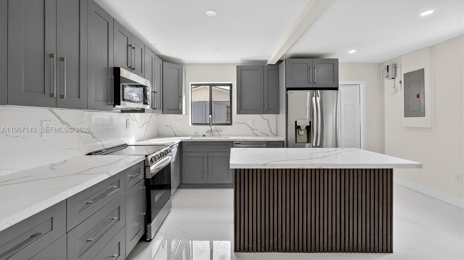 Welcome to 3740 NW 188th St, Miami—an updated, light-filled home with clean modern finishes and a layout made for everyday living and entertaining. Step inside to an airy open concept highlighted by smooth ceilings, recessed lighting, fresh neutral paint, and wide-plank wood-look flooring that flows through the main living areas. Black-framed windows and sliding glass doors bring in great natural light and connect you to the backyard. The showstopper kitchen features sleek gray shaker cabinetry, stainless steel appliances, a large pantry wall, and striking quartz countertops with a matching full-height backsplash. The oversized waterfall island with modern fluted detailing anchors the space—perfect for prep, casual meals, or hosting. A convenient built-in laundry area keeps everything streamlined. Both baths are designed with a spa vibe: large-format tile, contemporary vanities, stylish mirrors/lighting, and a walk-in wet-room style shower with rainfall head plus handheld sprayer. Outside, enjoy an expansive concrete patio/parking area and a detached storage building—ideal for tools, bikes, or a home workshop. Conveniently located in Northwest Miami-Dade near shopping, dining, and major commuter routes. Move-in ready and easy to love—schedule your showing