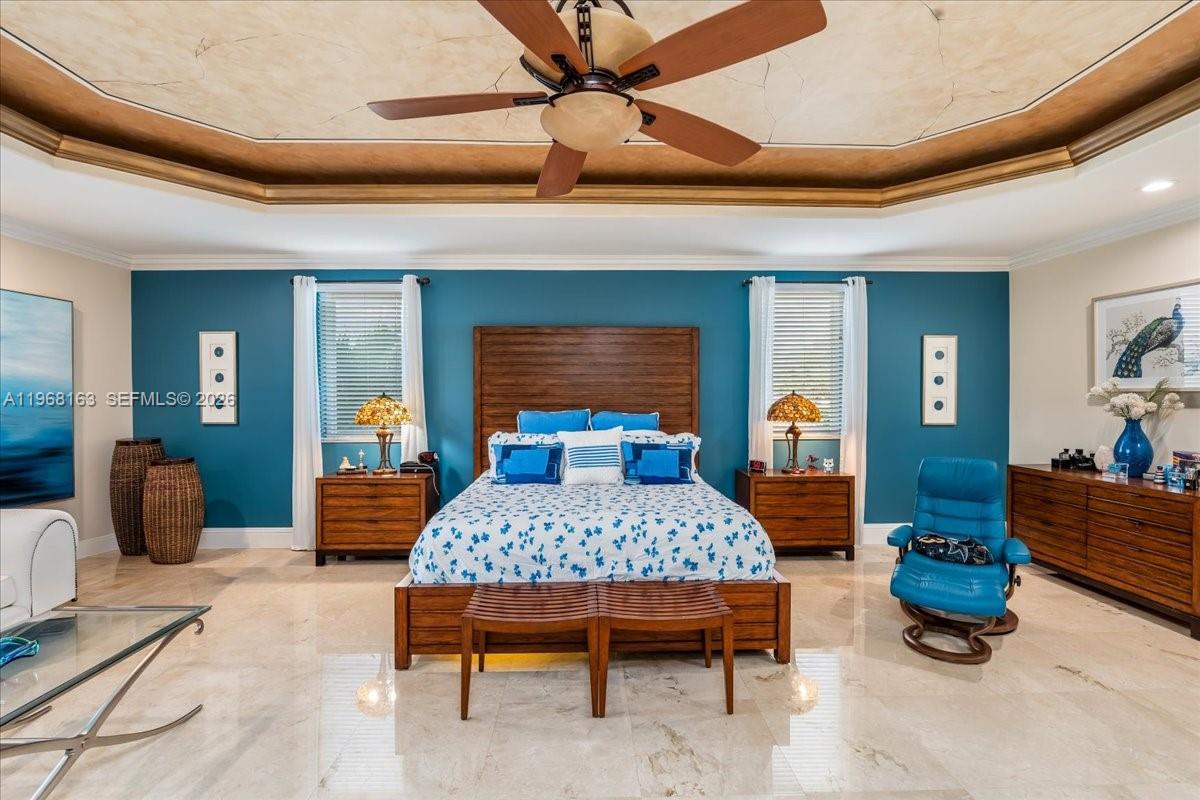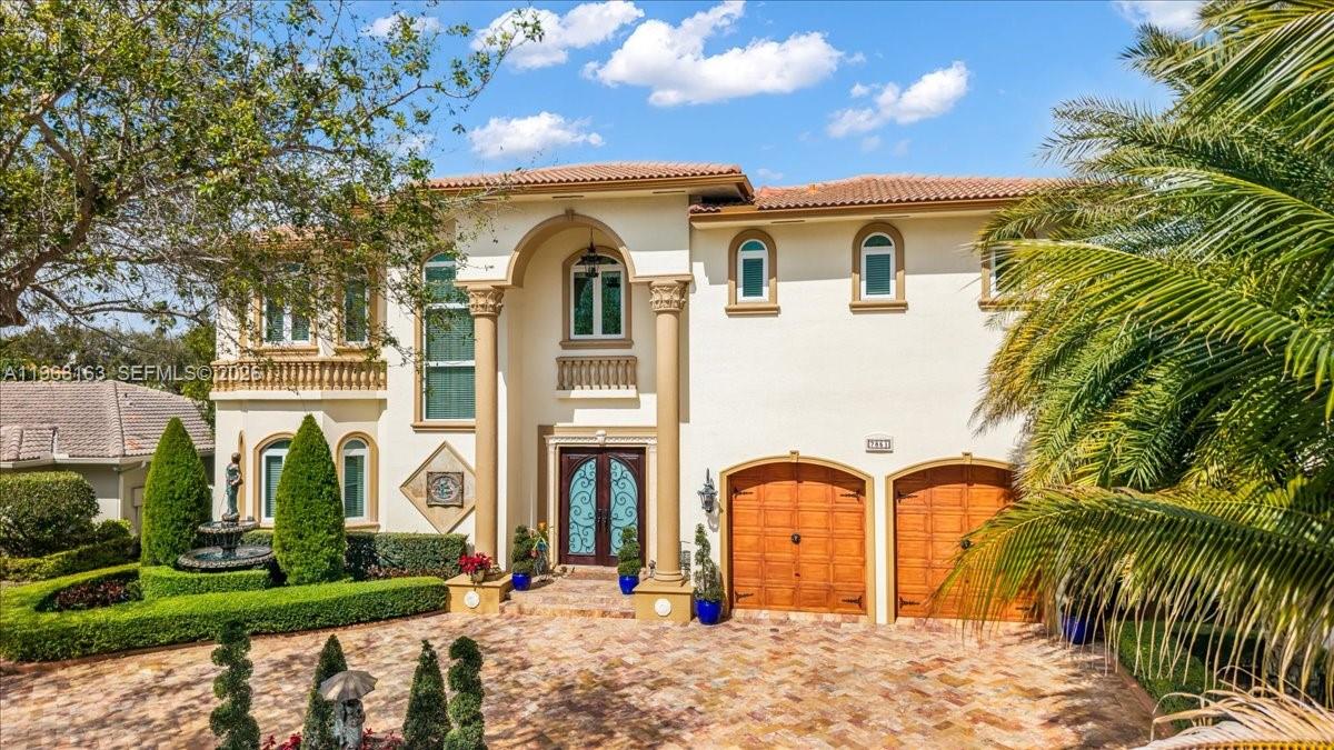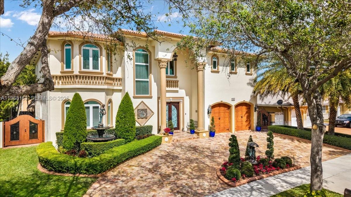 Luxurious estate located within the gated and highly sought-after community of Royal Oaks. This Mediterranean-inspired home offers approximately 4,256 square feet of thoughtfully designed living space, featuring six bedrooms and five bathrooms. Built entirely of concrete, including the second floor, the residence provides exceptional durability and long-term value. A marble entry with a custom medallion leads into spacious interiors with high ceilings, classic architectural details, and marble flooring throughout, creating a bright and elegant atmosphere. The functional layout includes three guest bedrooms with private en-suite baths and an expansive primary suite of over 900 square feet, complete with a spa-style bathroom and Jacuzzi soaking tub. High-impact windows and doors enhance security and energy efficiency. A second-floor kitchenette with washer and dryer is ideal for extended family or guests, and an oversized two-car garage with marble flooring completes the home’s interior. The backyard oasis is equally impressive, featuring a marble deck, large covered terrace, refreshing pool area, outdoor kitchen, and a tiki hut—perfect for entertaining or relaxing in privacy.