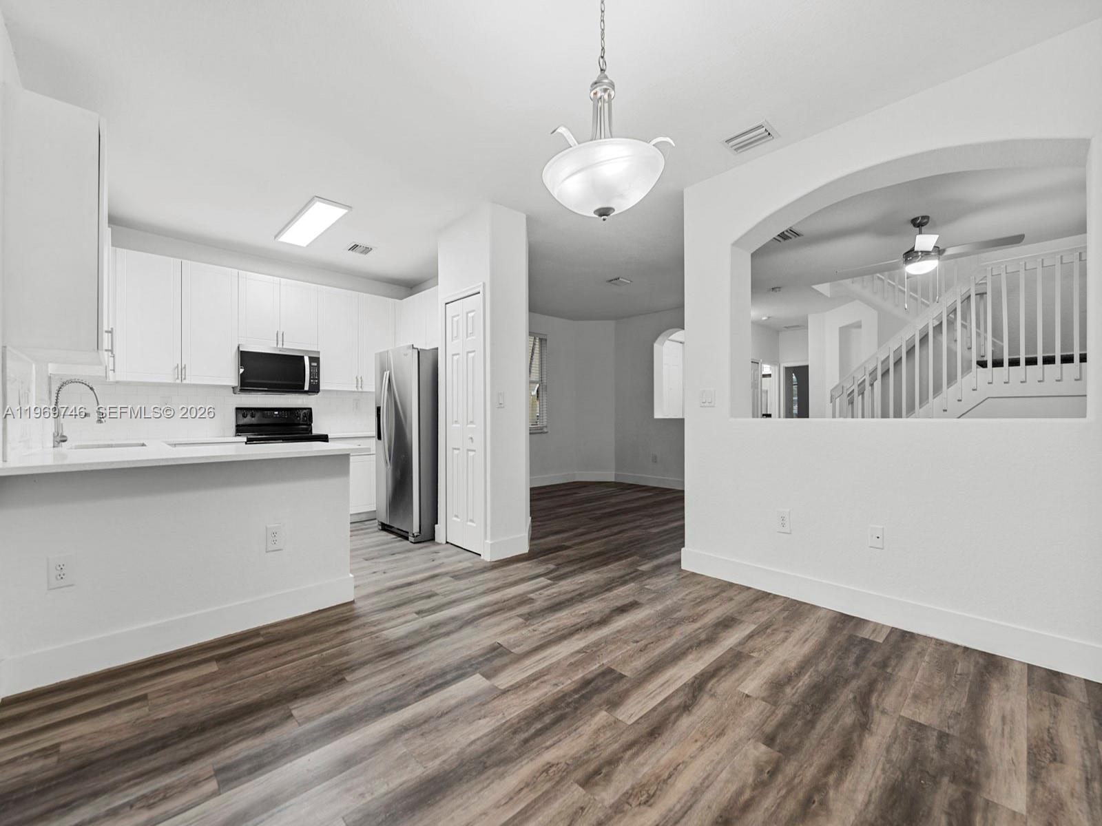 Welcome to your beautifully updated new home! This stunning 4-bedroom, 3-bathroom corner-unit townhouse offers the perfect blend of modern comfort and Mediterranean charm. From the moment you pull into the brick-paver driveway with its attached garage, you'll be captivated by the lush palm trees and striking architectural details. Step inside to discover a bright, airy, and open-concept floor plan flooded with natural light. The interior boasts crisp white walls, elegant arched cutouts, and updated flooring that flows seamlessly throughout the main living areas. The heart of the home is the pristine, fully upgraded kitchen, featuring sleek white shaker cabinetry, stainless steel appliances, a subway tile backsplash, and a convenient breakfast bar. The spacious living and dining areas open up through large sliding glass doors to a private, fenced backyard space—perfect for enjoying your morning coffee or entertaining guests. New HVAC with fresh, modern finishes and the added privacy of a corner lot, this move-in-ready gem won’t last long! Low HOA fees include cable and internet, no approvals required.