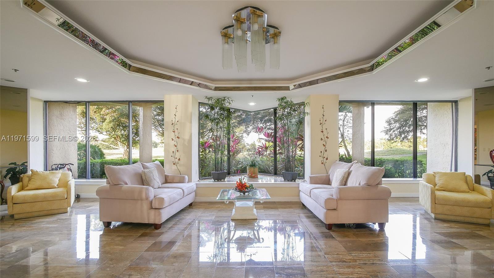 Discover the largest floor plan in the building with this magnificent 1,972-square-foot corner condo. Located on the third floor of a premier 55+ community, this residence feels like a private home thanks to soaring 10-foot ceilings and extra windows that flood the space with natural light. The open-concept interior features stunning vinyl flooring throughout, leading to a gourmet kitchen complete with sleek quartz countertops and stainless steel appliances. A dedicated washer and dryer are located within the unit for total convenience. The standout feature is the expansive wraparound patio, offering a perfect vantage point for spectacular golf course views and breathtaking sunsets. For year-round peace of mind, the entire patio is protected by hurricane shutters. This unit also includes two dedicated parking spots plus ample guest parking. High-speed fiber-optic internet and an expanded cable package are included in the monthly dues, as are water, sewer, and pest control. The community is currently undergoing exciting renovations and installing a new security entry system, promising significant future value for the owner. Residents enjoy a world-class cultural center with heated pools, a spa, gym, bowling, pickleball, and a library. Residency requires a credit score of 700+ and a minimum annual income of $85,000. ==See Broker's remarks==