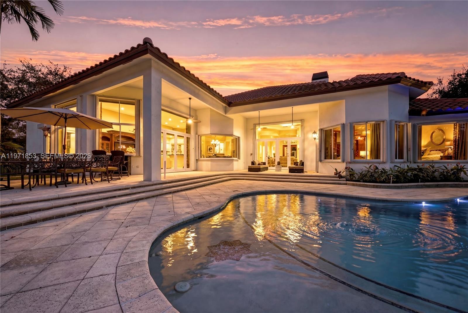 Experience refined living in Westons most prestigious guard gated community, Windmill Ranch Estates. From the moment you arrive, a grand fountain entrance sets the tone for the elegance that awaits you inside.A stately Porte Cochere provides both architectural distinction and convenient covered access, creating a dramatic first impression. Step through the large entrance doors to discover expansive living spaces designed for both luxurious entertaining and comfortable everyday living. Each of the 5 spacious bedrooms offer privacy and comfort, with beautiful appointed en suite bathrooms. There is also an additional library/ office with cherry wood floors and high ceilings.The primary suite serves as a private retreat, designed for relaxation and tranquility. The home features 2 fireplaces, adding warmth and ambience to formal and informal gathering areas alike.Soaring ceilings, abundant natural light, and refined finishes elevate every room. At the heart of the home is the gourmet kitchen which is a chefs dream appointed with high end appliances, custom cabinetry, generous counter space, and an ideal layout for hosting dinners and celebrations. outdoors your private oasis awaits. Enjoy year round Florida living with a resort style pool and spa, surrounded by lush landscaping and ample patio space for entertaining or unwinding in complete serenity. Once you experience your first sunset , you will be hooked.