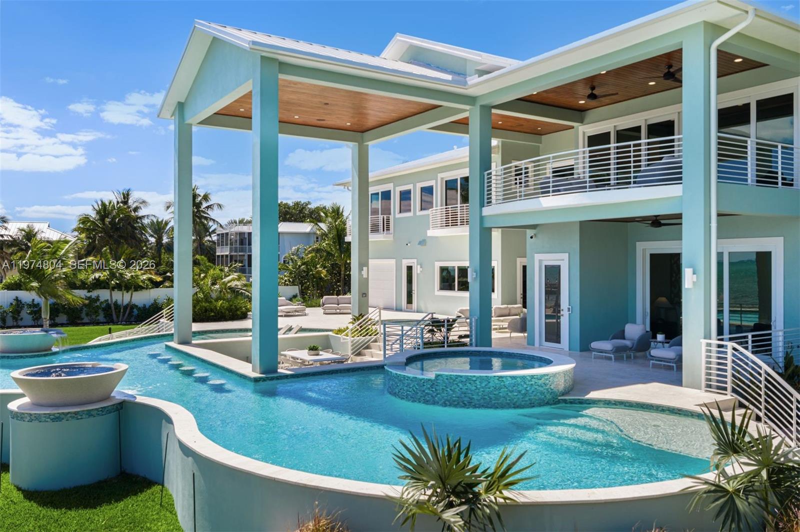 Newly completed in 2025, this exceptional oceanfront estate is located in the heart of The Florida Keys on the premier ocean side of Islamorada. A gated entry welcomes you through lush tropical landscaping and a diverse fruit-tree grove, setting a private and refined arrival. Set on over 2 usable acres with 210 feet of private sandy beachfront and a protected cove, the residence spans 7,590 square feet of interior living space & 1,736 square feet of exterior living, with an expansive 230-foot dock. Designed for seamless indoor-outdoor living, the home features a dramatic great room with 23-foot ceilings, panoramic Atlantic exposure, and expansive covered terraces with summer kitchen and outdoor dining areas. A 65-foot heated lagoon-style pool with swim-up bar and fire-pit lounge creates a resort-caliber setting. The chef’s kitchen is appointed with Sub-Zero, Wolf, and Thermador appliances. Additional highlights include dual primary suites, private orchid garden, lounge & recreation room, elevator, Sonos surround sound, impact windows and doors, metal roof, double-height garage, and dedicated water-sports storage. The essence of beachfront living in Islamorada, combining impressive scale and ultimate privacy. ***A contiguous 0.7-acre lot with development rights for an ancillary building with upstairs storage is available separately.