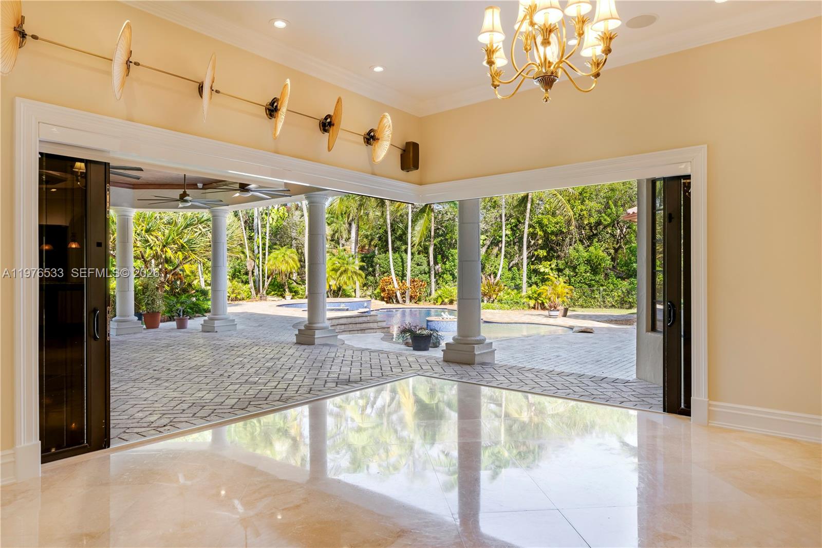 Perfectly located in the heart of Pinecrest along one of its most desirable corridors, this gated estate is tucked away on a lush acre-plus lot, offering privacy and convenience just minutes from top schools, parks, and the best of Miami living. Designed for comfort, entertaining, and effortless luxury, the residence features 7 bedrooms plus a private office, including a sumptuous primary suite on the ground floor overlooking the pool with soaring ceilings, designer lighting, and two oversized walk-in closets. The marble primary bath offers a soaking tub, an oversized shower ready for a steam system, and refined finishes. At the center of the home, the chef’s kitchen is equipped with Thermador refrigeration, gas range, double ovens, hidden pantry, and breakfast nook. The kitchen flows into a spacious great room with fully retractable doors, seamlessly blending indoor and outdoor living. Entertainment spaces include a game room with full bar and cabana bath, temperature-controlled wine cellar, and multiple laundry areas.The home is fully wired for centralized audio/video control with LED lighting and Hunter Douglas blinds throughout, while a striking cylindrical elevator connects the levels. Car collectors will appreciate the three-car garage with lifts accommodating up to six vehicles. Outdoors, enjoy a heated saltwater pool finished in dark blue glass, propane fireplace, twilight landscape lighting, and expansive grounds. The property offers generous setbacks for privacy.