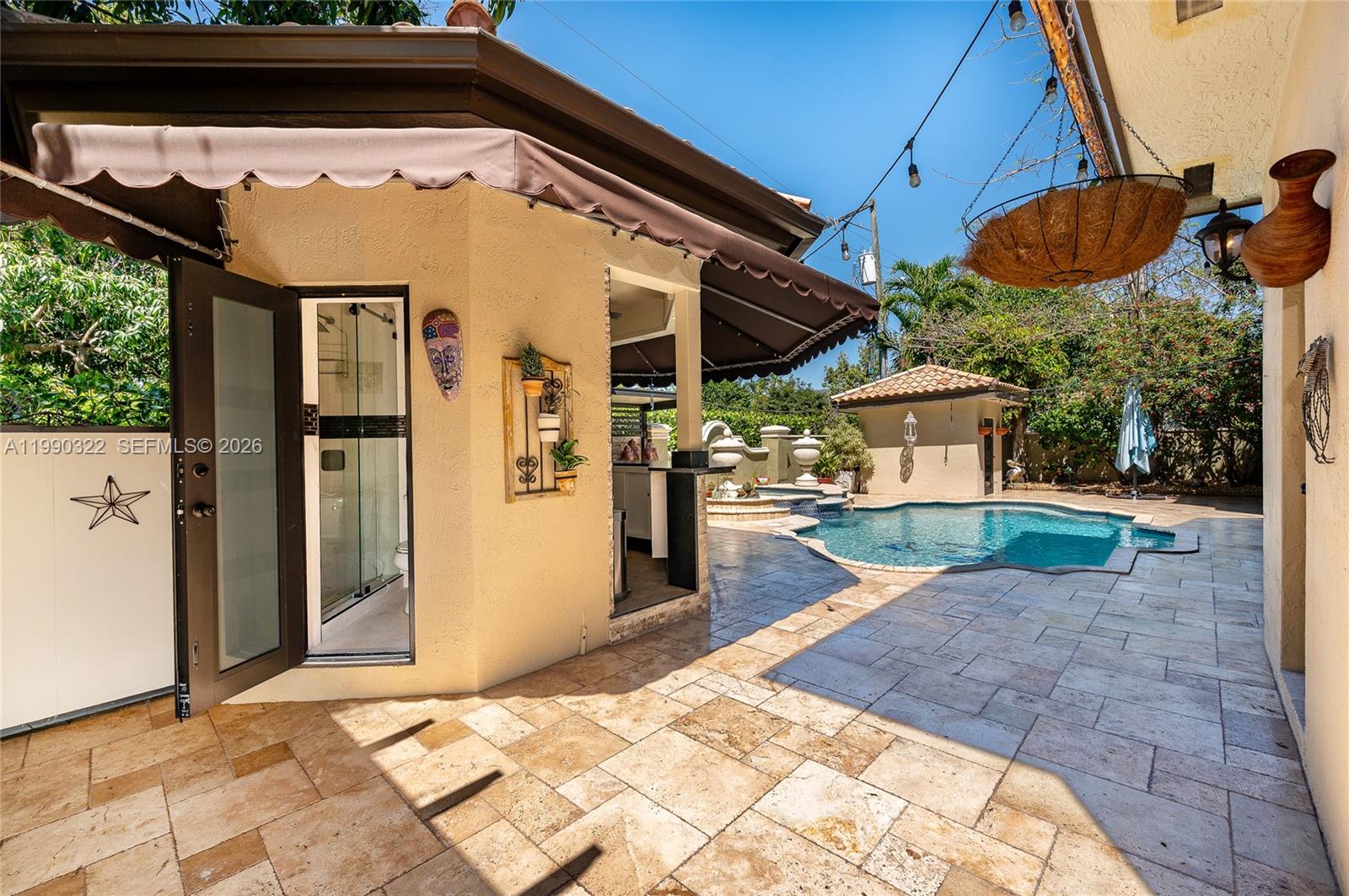 Step into this stunning residence on a corner lot. Truly an architectural statement inside & out. This two-story home features 5 bedrooms ,4 bathrooms, 2 car garage & a pool. Thoughtfully designed for comfort & versatility. 2 bdrm upstairs & 3 bdrm conveniently located downstairs, an ideal layout for families & guests. Step inside to soaring cathedral ceilings & elegant marble flooring that set the tone for a light filled sophisticated interior. This exceptional residence features an expansive family room alongside an elegant formal living room, offering the perfect balance of comfort & refined entertainment. A striking steel staircase serves as a stunning architectural centerpiece elevating the home’s design. The chef’s inspired kitchen is equipped with a spacious island, granite countertops & wood cabinetry. Hurricane impact windows & doors provide peace of mind, while dual AC units ensure year round comfort. The primary suite features two walk-in closets, a spa like bathroom with a soaking tub & a separate shower. Outdoors, enjoy your private oasis with a saltwater pool, a pergola, cabana bathroom & a fully equipped built-in bar & BBQ area perfect for hosting & relaxing while the lush landscaping enhances the home’s curb appeal. A whole house generator provides convenience & security during storm season. This home truly offers the perfect blend of luxury, functionality & outdoor living. All of these features are combined in a much sought-out neighborhood in Miami Springs.
