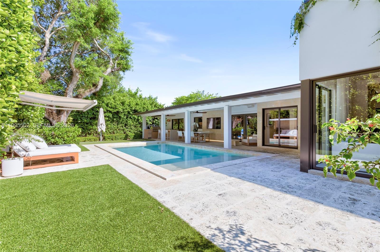 Ideally located in the heart of South Miami, just minutes from the University of Miami and Coral Gables, this fabulous, turnkey residence offers a bright, open layout and seamless indoor-outdoor living. Designed with a refined, contemporary aesthetic, the home features an Italkraft kitchen with Sub-Zero and Wolf appliances. Light oak hardwood floors paired with Italian porcelain add warmth and sophistication throughout. The recently built primary suite offers a spa-inspired bath with Graff fixtures and a smart toilet. Outdoor spaces are equally impressive, featuring a heated saltwater pool finished in Dominican coral rock, along with a summer kitchen complete with a Coyote gas grill and Perlick ice maker. The converted garage has been transformed into a striking lounge/media room with custom millwork, ideal for entertaining or showcasing a prized collection. Additional highlights include Phillip Jeffries and Élitis wallpaper, Italian closets, motorized shades and wood shutters, impact windows and doors, 2017 roof, motorized front gates, in-ceiling speakers throughout, low voltage landscape lighting, and a double carport with full electric enclosure. Enjoy close proximity to top schools as well as Sunset Place, Shops at Merrick Park, and a variety of dining and entertainment options, with easy access to major roadways.