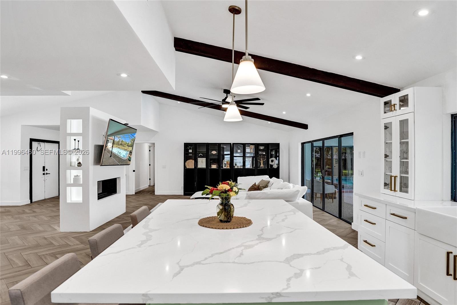 Fully Renovated | Largest Lot on the Block | Over 1 Acre | Designer Finishes This 4-bedroom, 2-bathroom home spans approximately 2,330 SF and has been completely renovated with a clean, modern design. Situated on over 1 acre—the largest lot on the block, this property offers a rare combination of interior upgrades and expansive outdoor space. The home features a bright, open layout with vaulted ceilings, exposed wood beams, and abundant natural light. The designer kitchen includes quartz countertops, custom cabinetry, a large center island, and premium finishes, flowing seamlessly into the main living and dining areas. Additional highlights include herringbone-style flooring throughout, a built-in wine display, and fully renovated bathrooms with high-end materials and contemporary design. Enjoy true indoor-outdoor living with multiple access points to the screened pool area and an oversized backyard with endless potential—ideal for entertaining, expansion, or creating a private retreat. Located in a desirable Boca Raton community near top-rated schools, shopping, and dining.