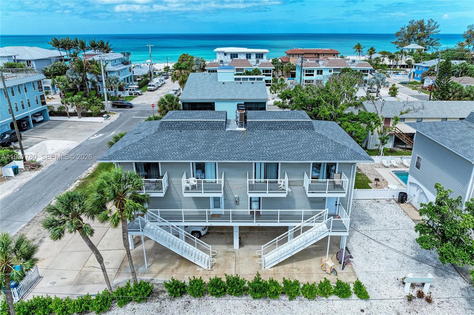 Turn-key furnished 2BD/2BA condo located directly across the street from the white sandy beaches of Anna Maria Island in Holmes Beach. This 900 sq ft unit offers a desirable two-level layout with living areas on the main level and bedrooms upstairs, each with its own private balcony. Open kitchen with island flows into a bright living space. Ceramic tile flooring throughout main areas. Community features a recently remodeled pool and fenced green area. Ideally located near restaurants, grocery stores, pharmacy, and shopping. Short-term rentals allowed, making this an excellent income-producing opportunity or perfect island getaway. Enjoy the charm of Anna Maria Island, known for its beautiful sunsets and relaxed coastal atmosphere, offering a wonderful setting to unwind and spend quality time by the beach.