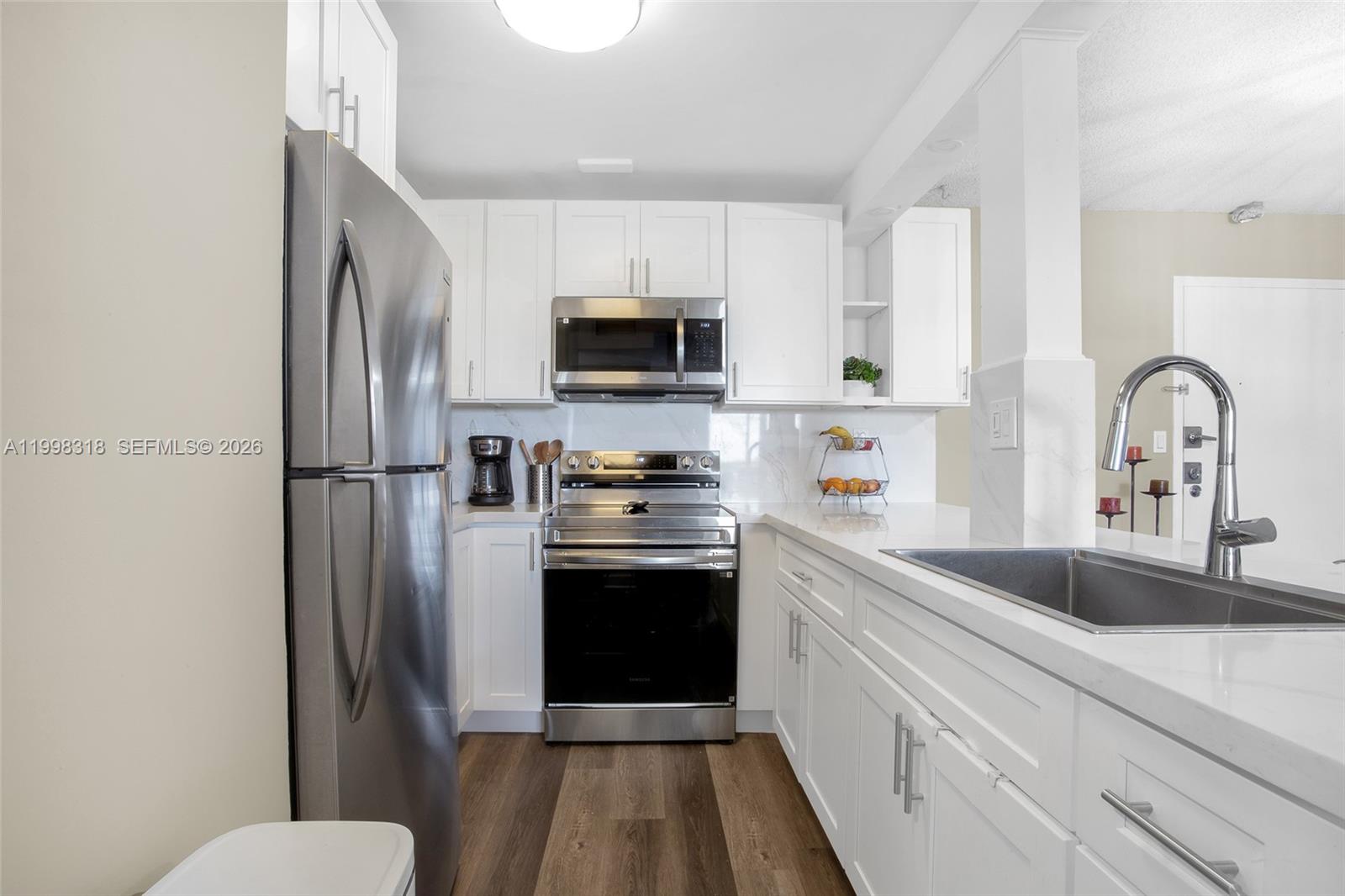 Beautiful 2-bedroom, 2-bathroom residence featuring a thoughtfully updated interior and serene lake views. The renovated kitchen offers modern finishes and brand-new appliances (2025), creating a functional and inviting space. The property includes several key upgrades for added value and peace of mind, including a new electrical panel (2023), air conditioning system (2024), updated A/C ducts (2025), impact windows (2025), and water heater (2024). Enjoy a bright and comfortable layout in a centrally located building, with convenient access to shopping centers, grocery stores, and major roadways. This residence offers a great combination of recent improvements, location, and views, making it an excellent opportunity for both end-users and investors.