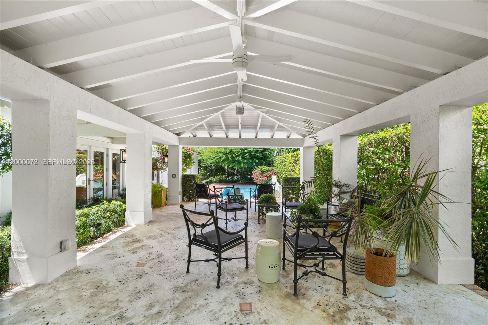 Set on one of the most desirable streets in Coral Gables’ Platinum Triangle, 731 Calatrava Avenue offers timeless architecture, privacy, and exceptional livability. Arched doorways and marble floors define the interiors, complemented by a new metal roof in 2025 and high-impact windows and doors throughout. Outdoors, a large covered patio overlooks a tropical saltwater pool, surrounded by mature landscaping and fruit trees on a 10,000 SF lot. The residence features 3 bedrooms, 3 full baths, and maid’s quarters currently serving as a laundry room off the 2-car garage. A rare offering in an incomparable neighborhood setting.