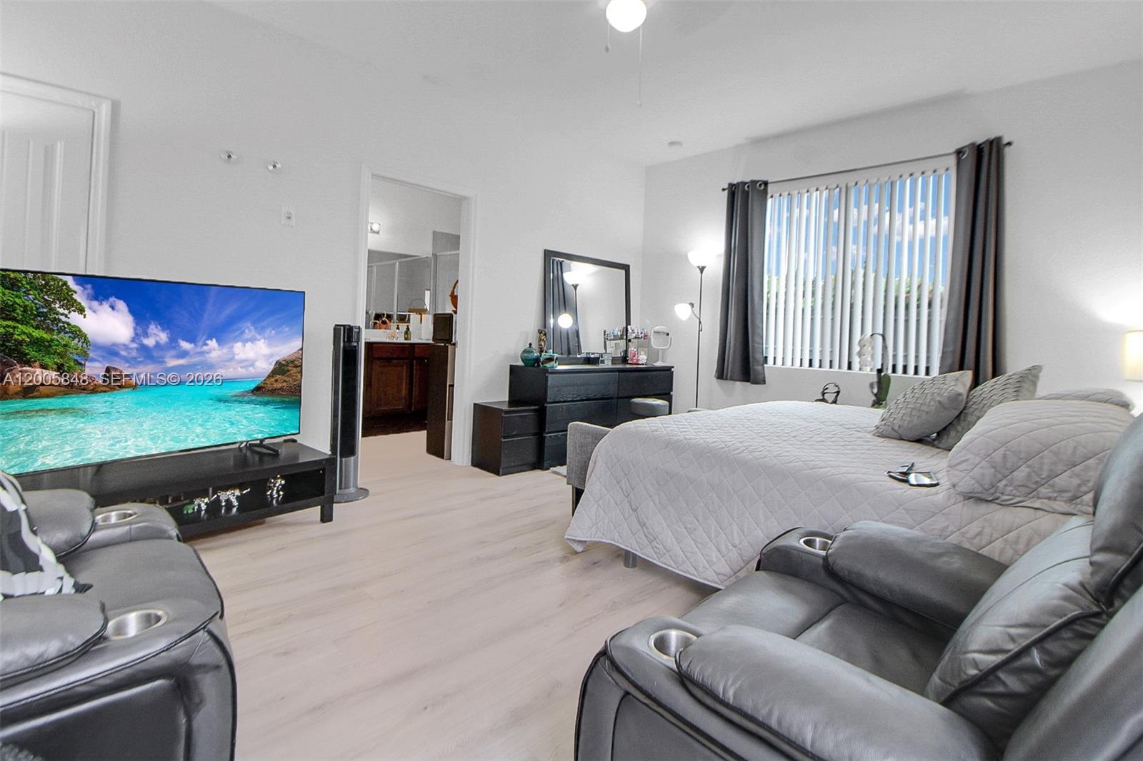 Beautifully updated home with commercial-grade hurricane impact windows and doors for maximum protection and efficiency. The primary bedroom has been converted into a private efficiency, offering excellent flexibility for rental income, guests, or extended family, while still maintaining interior access to the main home. A den/office adds valuable extra space for work or everyday living. The new kitchen features updated appliances and a quartz waterfall island, creating a modern and functional centerpiece. Step outside to a sleek, low-maintenance concrete patio, perfect for entertaining. Additional highlights include a two-car garage and a new A/C system (interior and exterior) under warranty. No HOA and not located in a flood zone, providing added savings and peace of mind. A great opportunity for homeowners or investors looking for flexibility and value in today’s market.