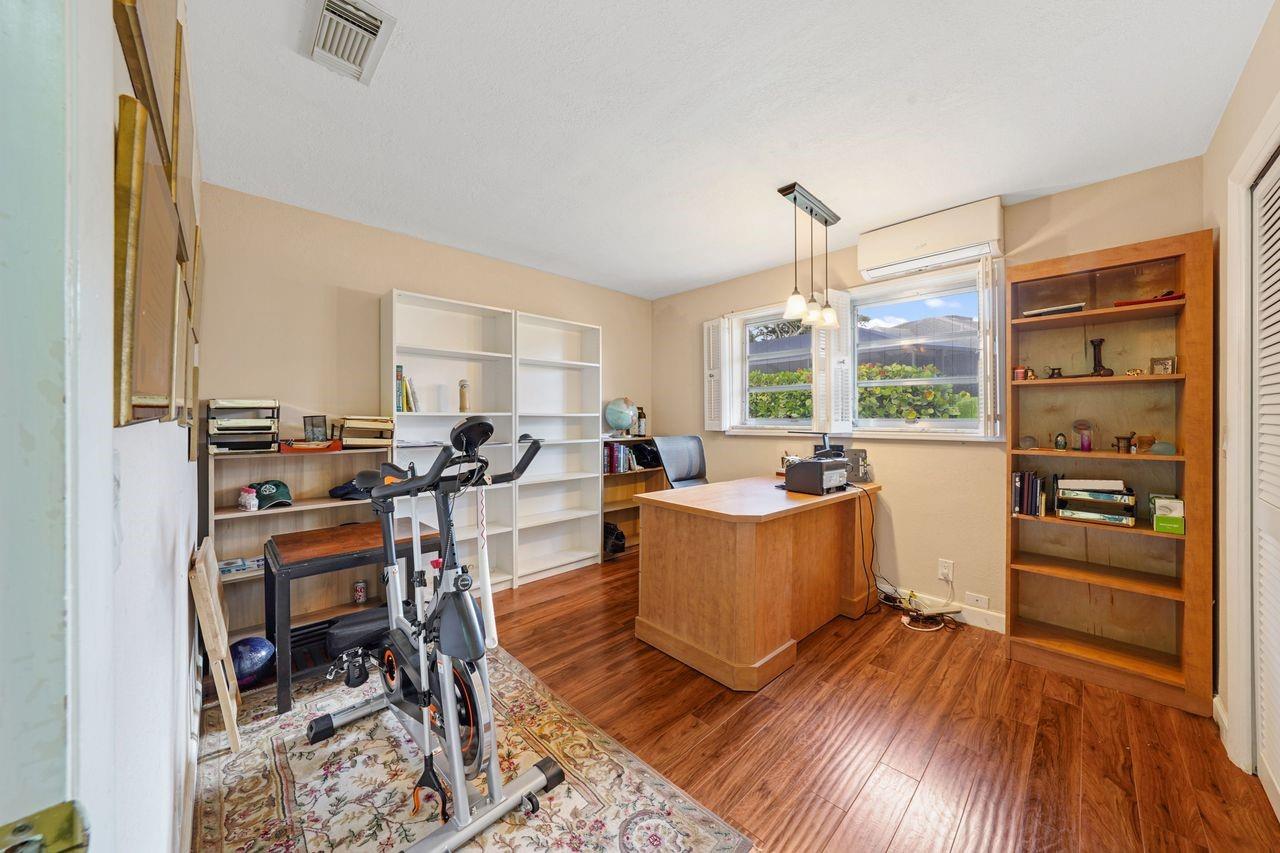 Beautifully maintained 3-bedroom, 3-bath home featuring an open floor plan and impact sliding doors that open to a screened-in pool patio. Master bath includes a tankless water heater, and the home is equipped with central A/C plus 3 mini-split units in the bedrooms for optimal climate control. Impact sliding doors in both the living room and master bedroom provide easy access to the pool area. The thoughtfully designed kitchen opens to the living room that is filled with natural light from 3 solar tubes. The property also includes mature fruit trees mango, avocado, banana, lemon & soursop. Centrally located near shopping, major highways, and additional community amenities, this home sits in a family-friendly neighborhood and offers both comfort and convenience. On a closed golf course.