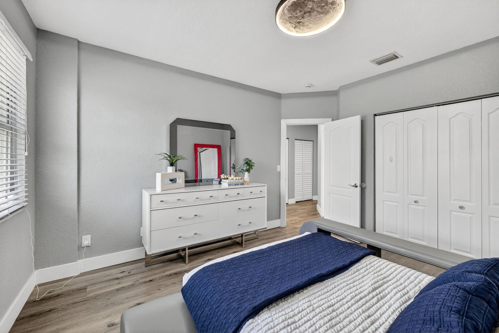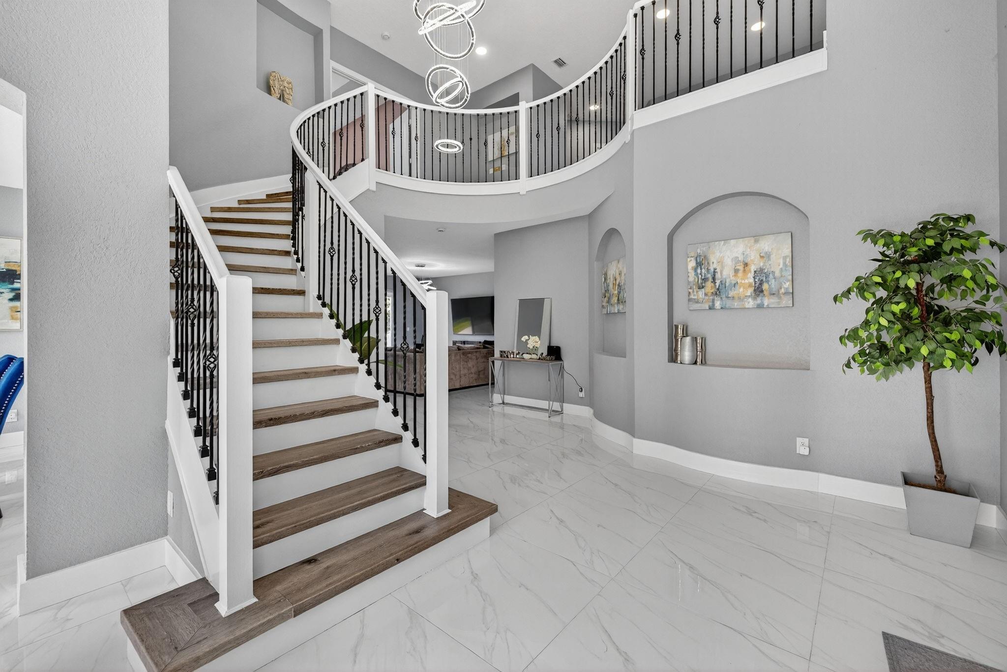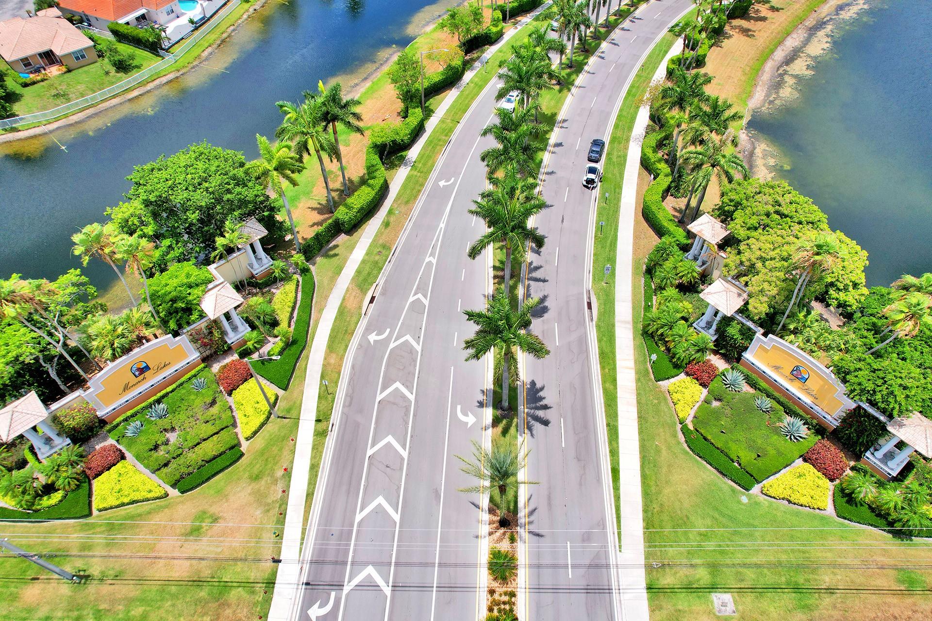 Beautifully updated 5 BD, 3 BA lakefront home with a spacious layout and a convenient bedroom & bathroom on the 1st floor. Gorgeous remodeled kitchen has quartz counters, SS appliances, shaker cabinets & a big island that flows into a huge family room perfect for entertaining. Spacious primary suite offers a sitting area, closet cabinetry, a spa-inspired bathroom with a freestanding tub, frameless shower, dual vanities & modern finishes. Upstairs, you'll find a versatile loft that works beautifully as a den, office, playroom, or study area. Upgrades include renovated bathrooms, new tile & LVP flooring, modern lighting, 2 newer AC's & accordion shutters. Low HOA fees $166 incl: community pool, gym, tennis, basketball, playground & park. Monarch Lakes provides access to top tier schools.