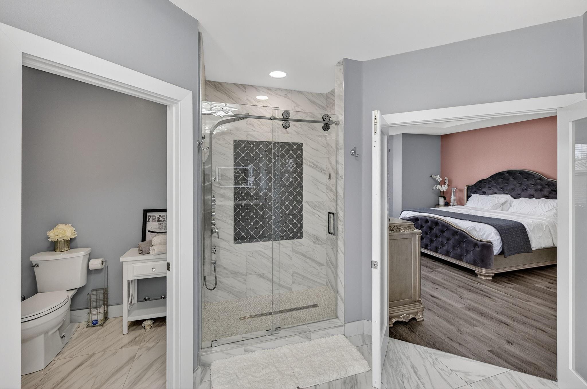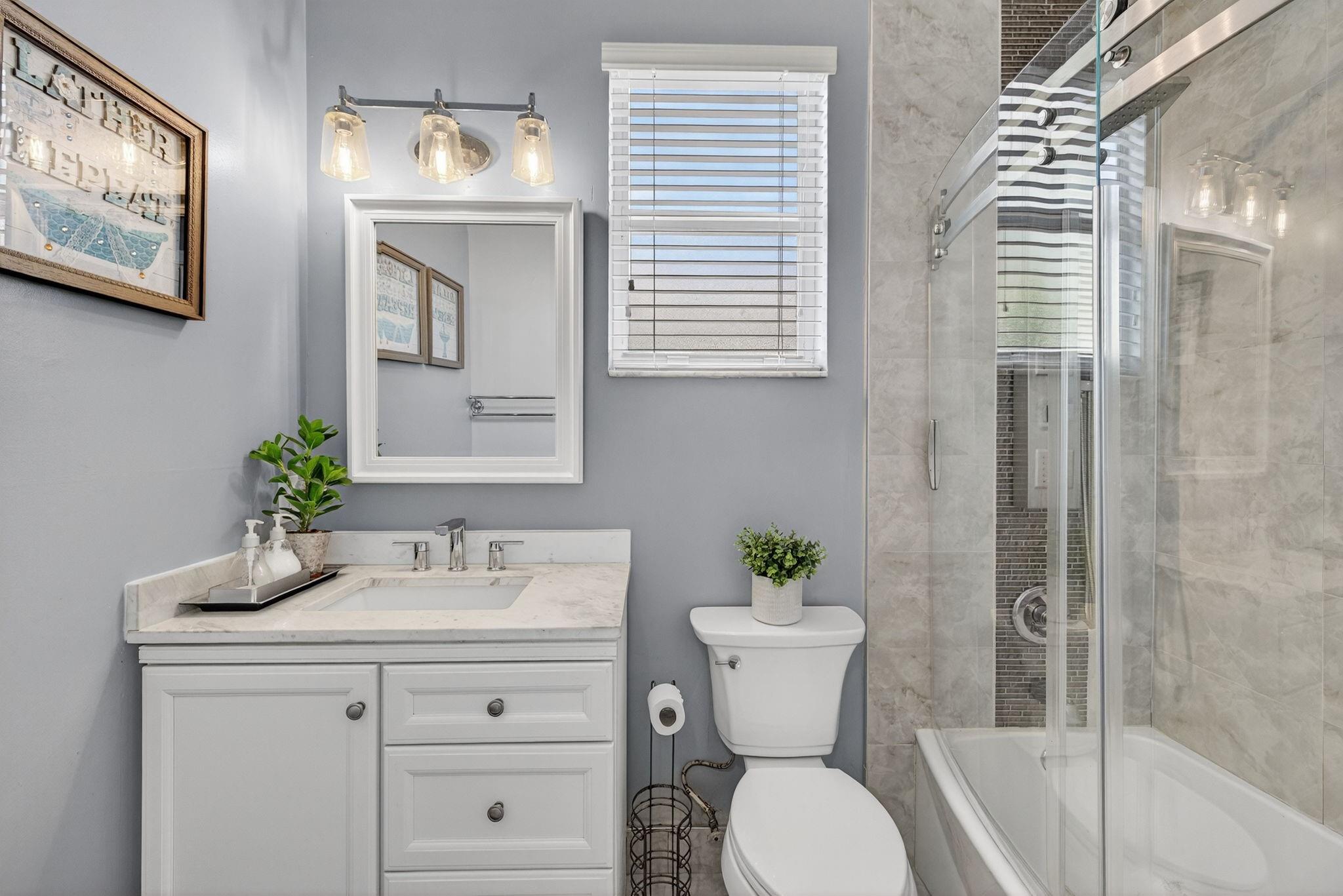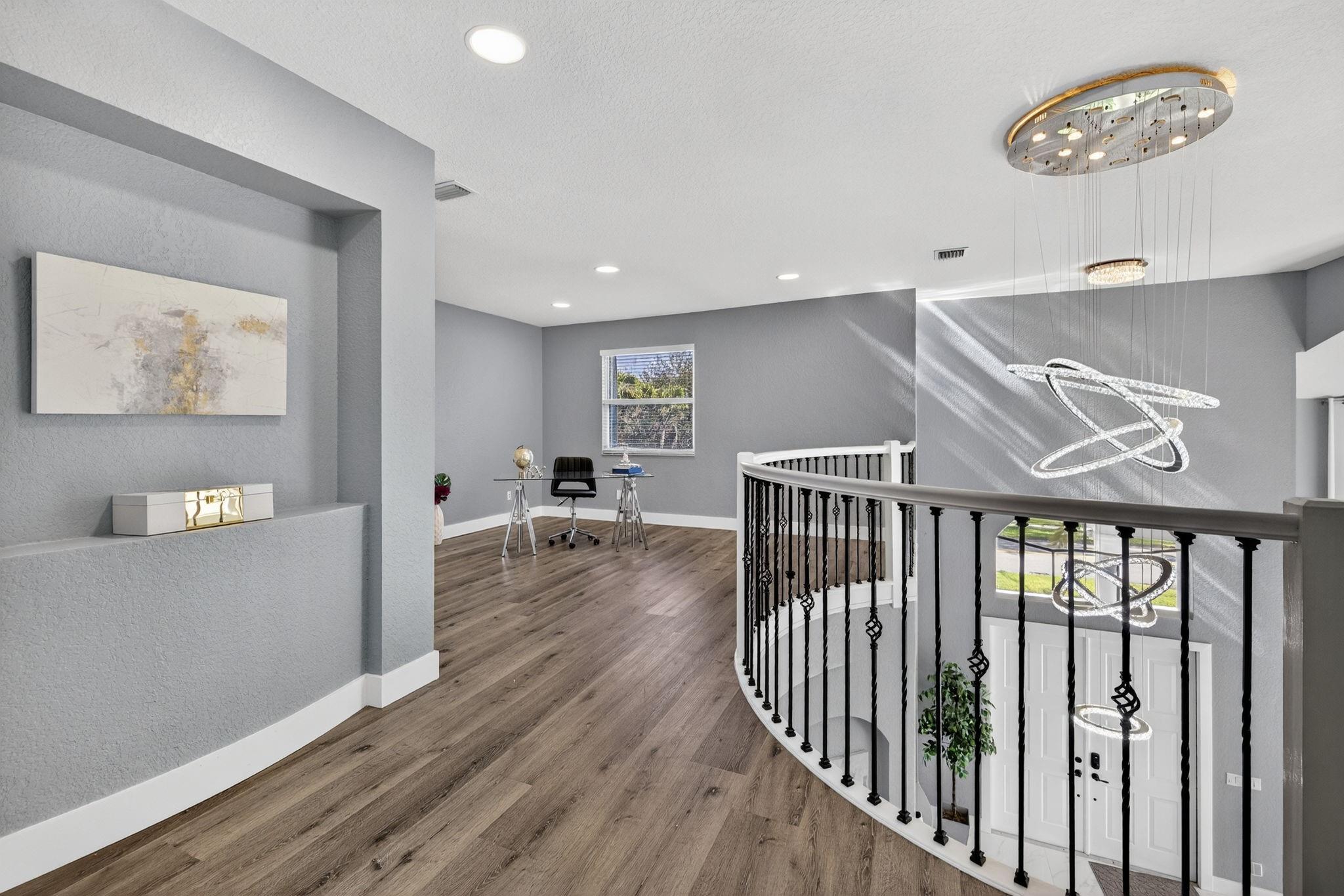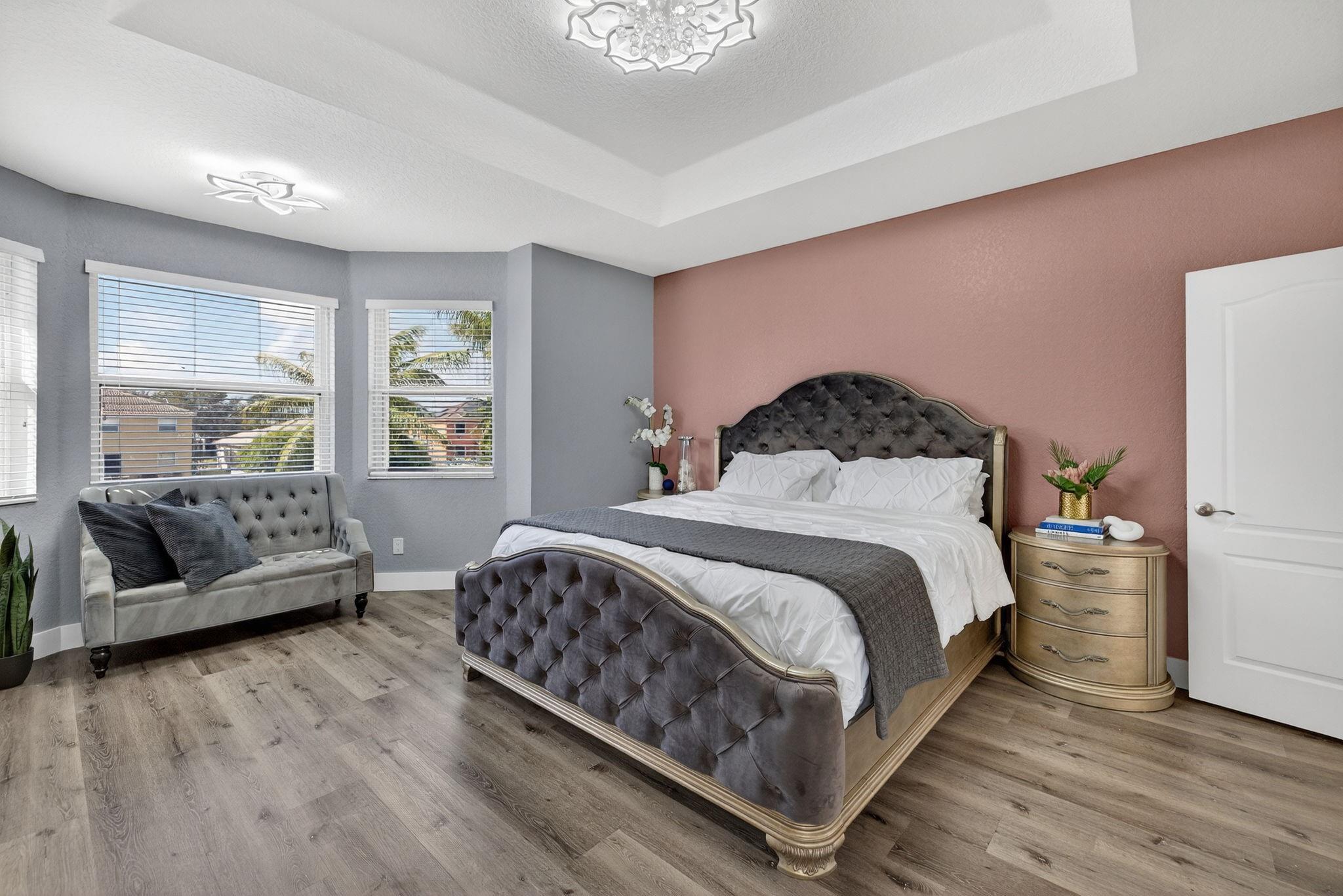 Beautifully updated 5 BD, 3 BA lakefront home with a spacious layout and a convenient bedroom & bathroom on the 1st floor. Gorgeous remodeled kitchen has quartz counters, SS appliances, shaker cabinets & a big island that flows into a huge family room perfect for entertaining. Spacious primary suite offers a sitting area, closet cabinetry, a spa-inspired bathroom with a freestanding tub, frameless shower, dual vanities & modern finishes. Upstairs, you'll find a versatile loft that works beautifully as a den, office, playroom, or study area. Upgrades include renovated bathrooms, new tile & LVP flooring, modern lighting, 2 newer AC's & accordion shutters. Low HOA fees $166 incl: community pool, gym, tennis, basketball, playground & park. Monarch Lakes provides access to top tier schools.