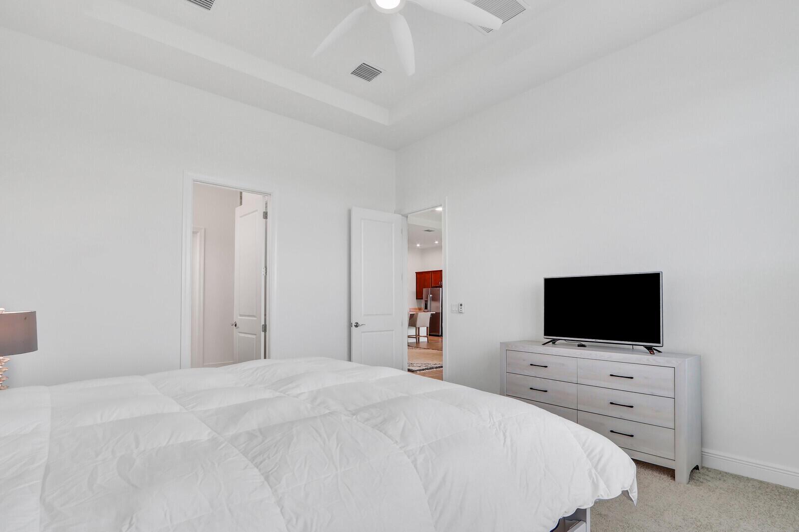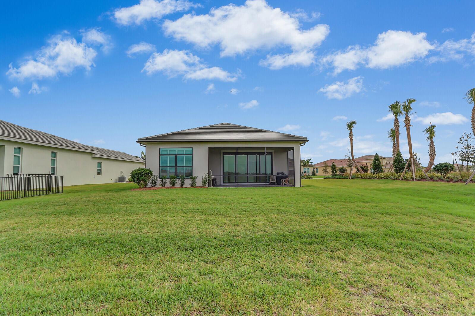 This Julia floor plan great room concept home offers two spacious master suites, 2.5 bathrooms, and a 2-car garage combining comfort and convenience in one of the most desirable communities in the area. The split bedrooms are perfect for multi-generational families or your weekend guests. Enjoy impact-resistant windows and doors, elegant plantation shutters, and an open great room concept perfect for entertaining. The chef's kitchen features a large island with quartz countertops, stainless steel appliances, and a walk-in pantry--ideal for modern living. Relax and unwind on your covered, screened lanai while taking in breathtaking sunset views over the lake. Located near the new community gate, this home offers quick access to Tradition area's restaurants, shopping, and I-95. PGA Verano