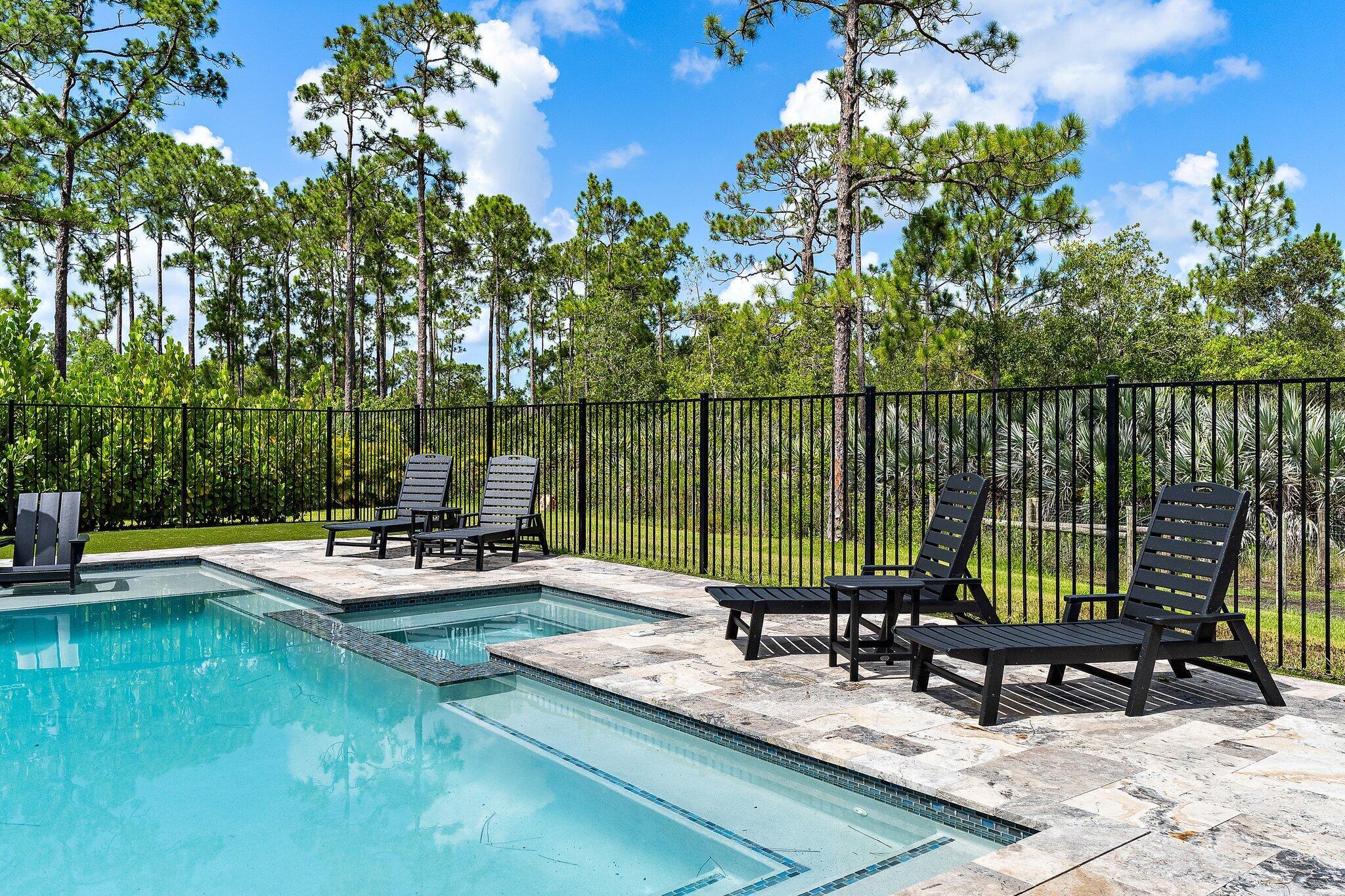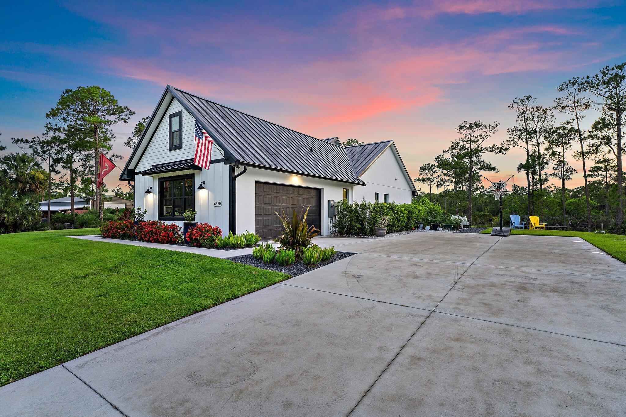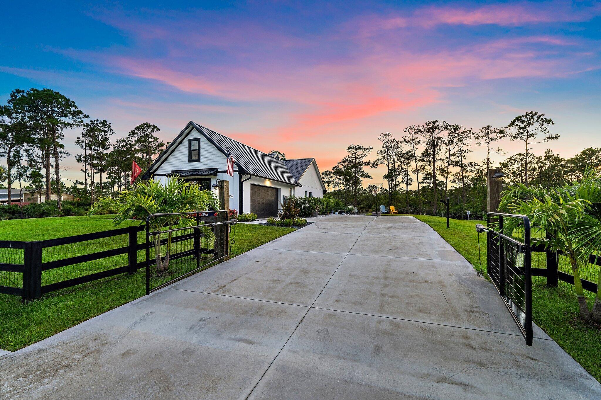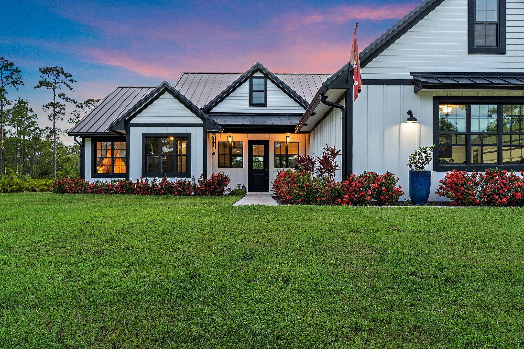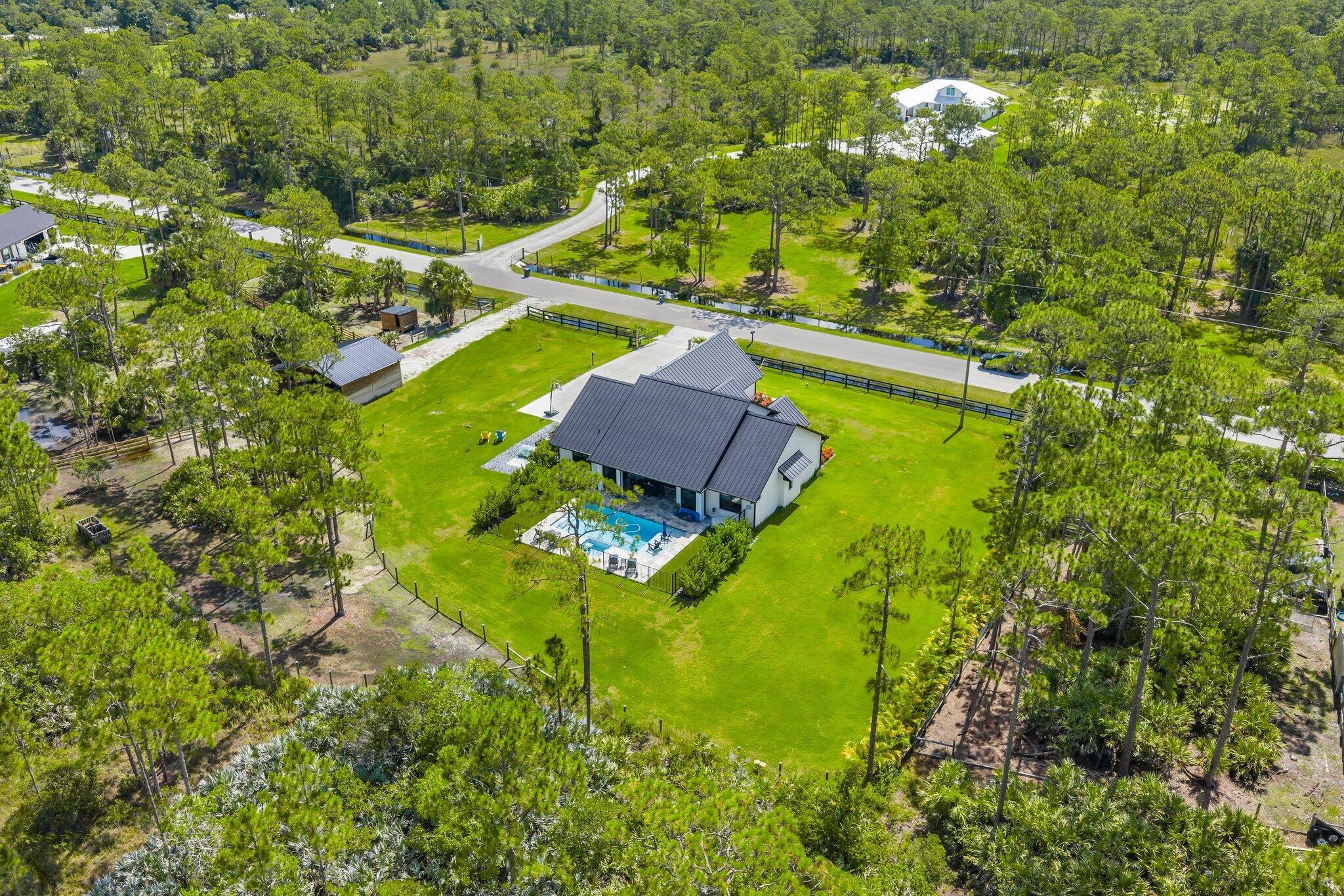 Introducing this absolutely stunning 2023 CBS built home featuring 3 bedrooms, 2 bathrooms, a den & a spacious flex room that could easily serve as a 4th bedroom. This modern farmhouse retreat sits on 5 pristine acres in the heart of Palm City Farms and sits at the end of a private paved road offers the perfect blend of luxury and tranquility. Enjoy a saltwater heated pool and spa, retractable automatic screens to enjoy your covered patio year-round, an oversized two-car garage, and a 30x30 detached building with a single stall... ideal for your hobbies, toys, or livestock. Inside, you'll find custom built-ins throughout, a beautifully designed mudroom, spray foam insulation, and state-of-the-art appliances. Topped with a sleek black standing seam metal roof this property truly stands out
