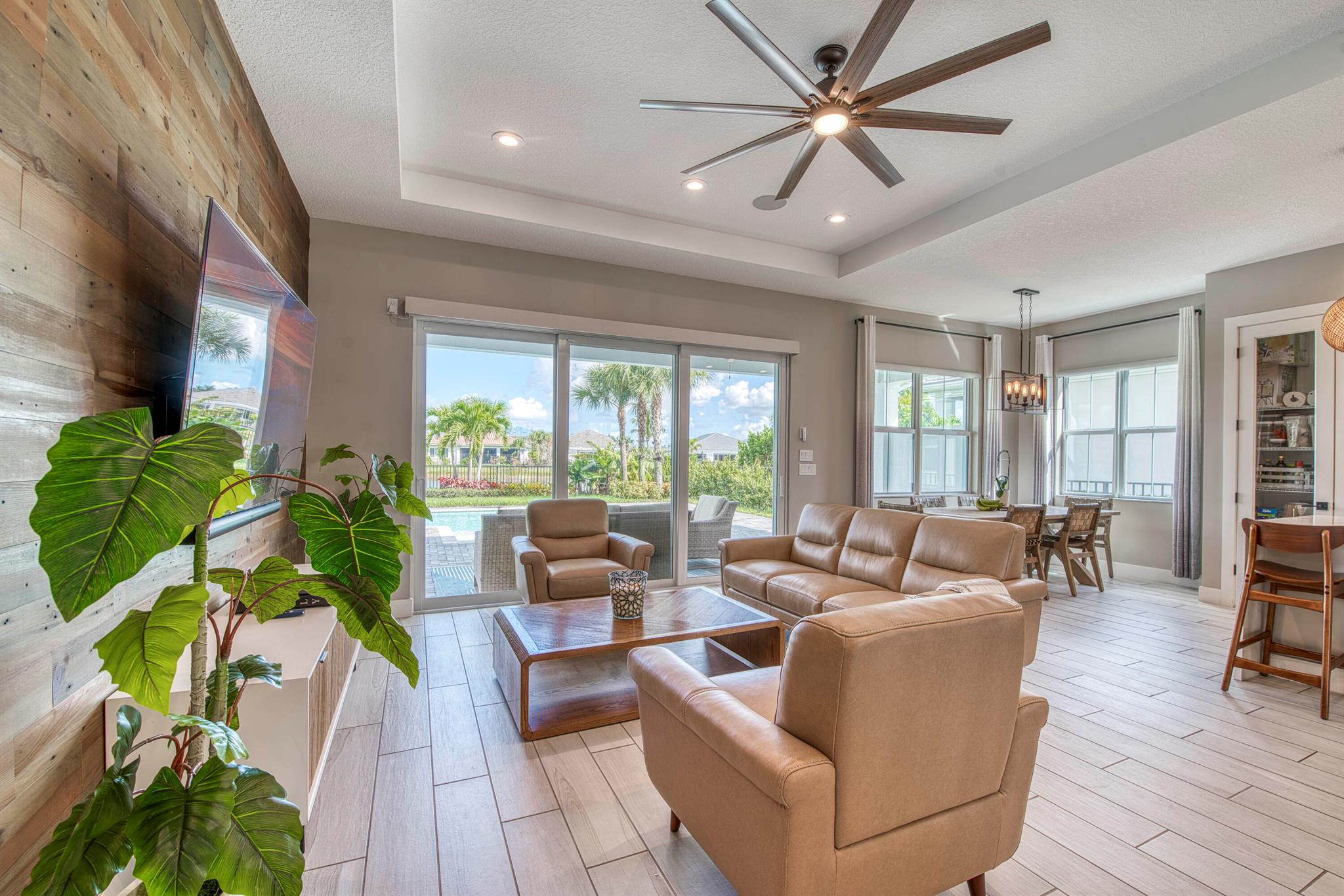 Welcome to this stunning 2021-built Torrance model in Windgate at Avenir, offering 3,222 square feet of thoughtfully designed living space on a 7,000-square-foot lot. This home was customized by Toll Brothers with several architectural modifications at the owner's request, including a mudroom (not typically offered in this community), an expanded primary bathroom with two linen closets, two sets of washer/dryers (upstairs and downstairs), and additional windows to maximize natural light throughout. The open-concept first floor features a sun-filled living room with a wood-clad focal wall and entertainment center, seamlessly connecting to a modern kitchen with a large quartz waterfall island and casual dining area, perfect for everyday living and entertaining. Upstairs, the spacious