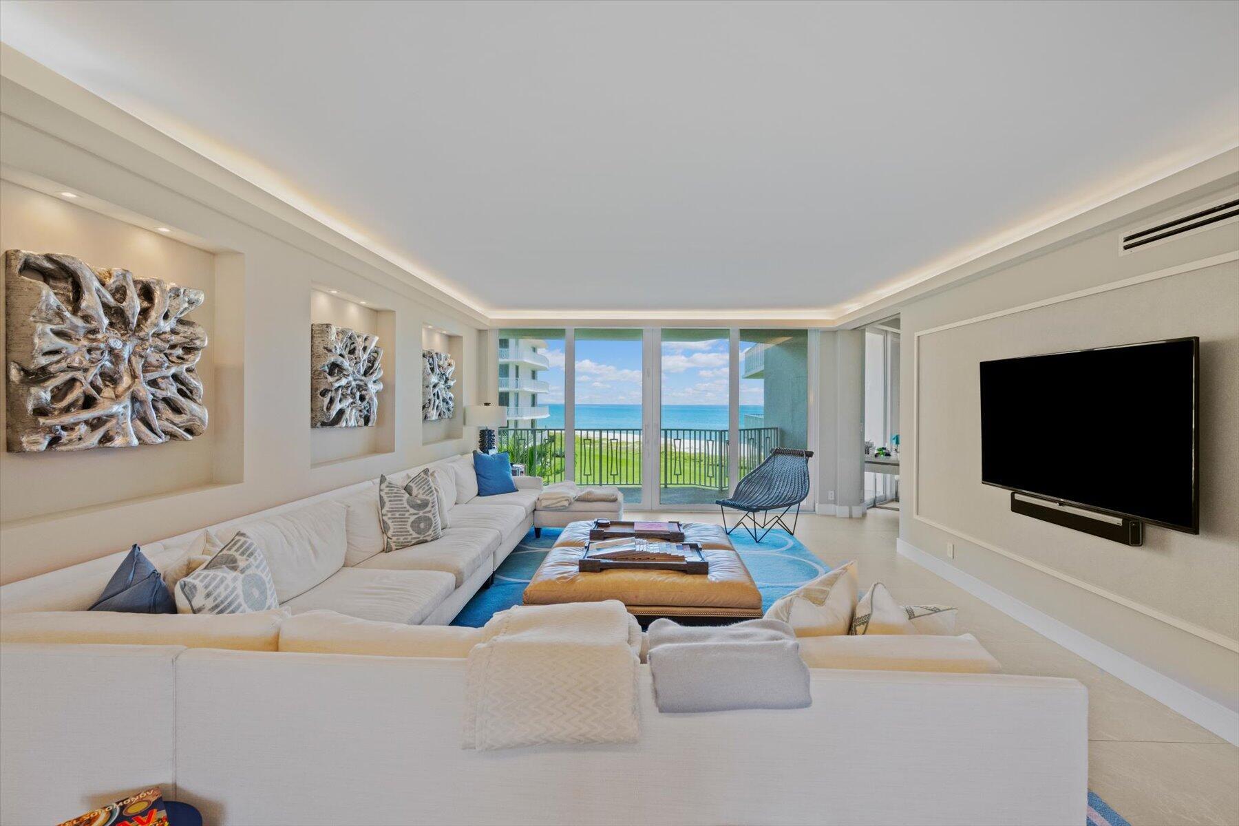 This recently renovated 3-bedroom, 3-bath residence is truly stunning, featuring elegant 48'' porcelain tile flooring throughout, 9' ceilings, custom lighting, and an open chef's kitchen with bespoke cabinetry. The home boasts attractive new bathrooms, a built-in Sonos sound system, flat-screen TVs, a coffered ceiling, and an electronic Murphy Bed in the third bedroom suite and custom closets. Its exceptional floor plan showcases ocean, pool, and Intracoastal views from a 3-sided wraparound balcony. Luxurious furnishings are available separately. The 2500 Building offers first-class amenities, including private beach access with towels and chairs, as well as a updated lobby, hallways, fitness center, spa, resort-style pool area with a pool attendant, community room, and Har-Tru tennis