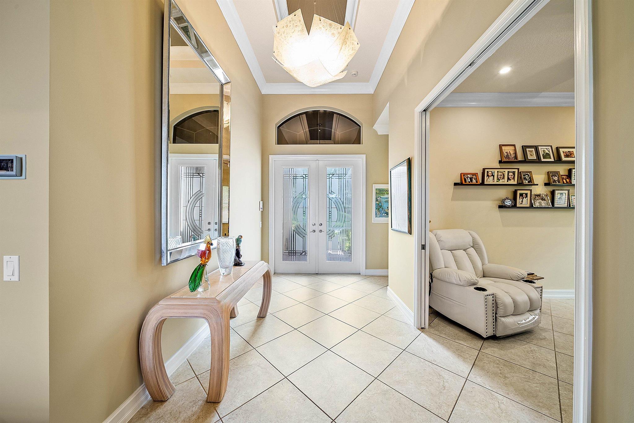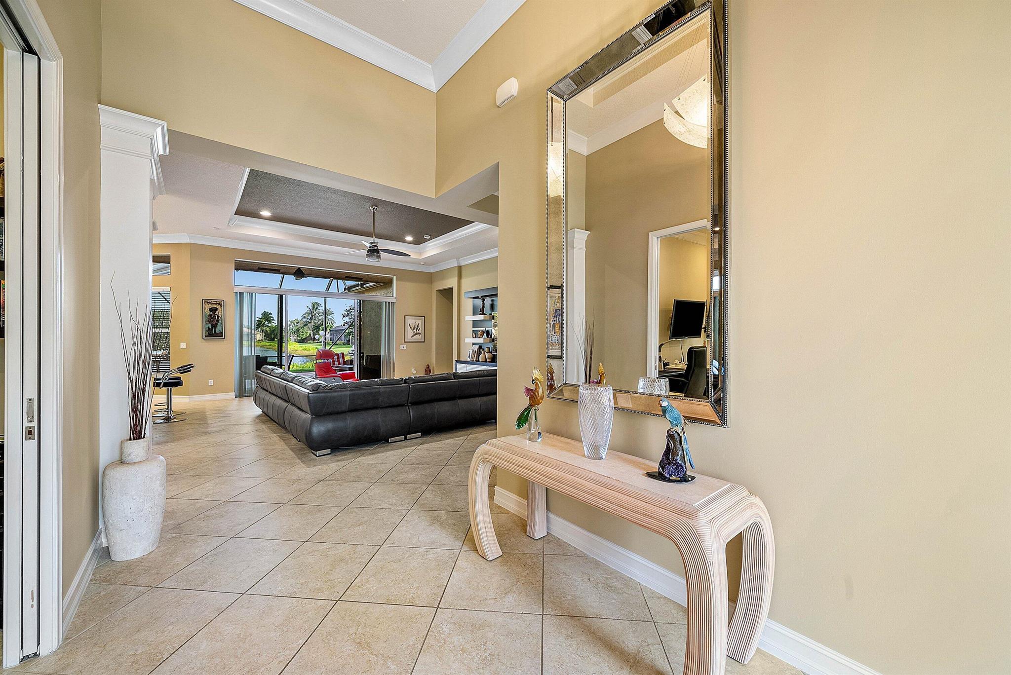 Highly Sought-After Open Concept Julia model with 3-car garage, perfectly designed for comfort and entertaining. This thoughtfully crafted residence features a 3-way split floor plan, with each bedroom offering its own ensuite bathroom, plus a gorgeous powder room for guests. The den/office is generously sized and can easily be converted into a fourth bedroom. Step through double etched-glass doors into soaring ceilings and be immediately captivated by the long lake view with a sparkling fountain. Expansive great room showcases a custom-built contemporary wall unit, creating a dramatic yet inviting focal point. Chef's dream kitchen boasts an abundance of cabinetry, upgraded appliances, custom center island, and convenient pull-out drawers. Savor the view in your lanai. Welcome Home!!!