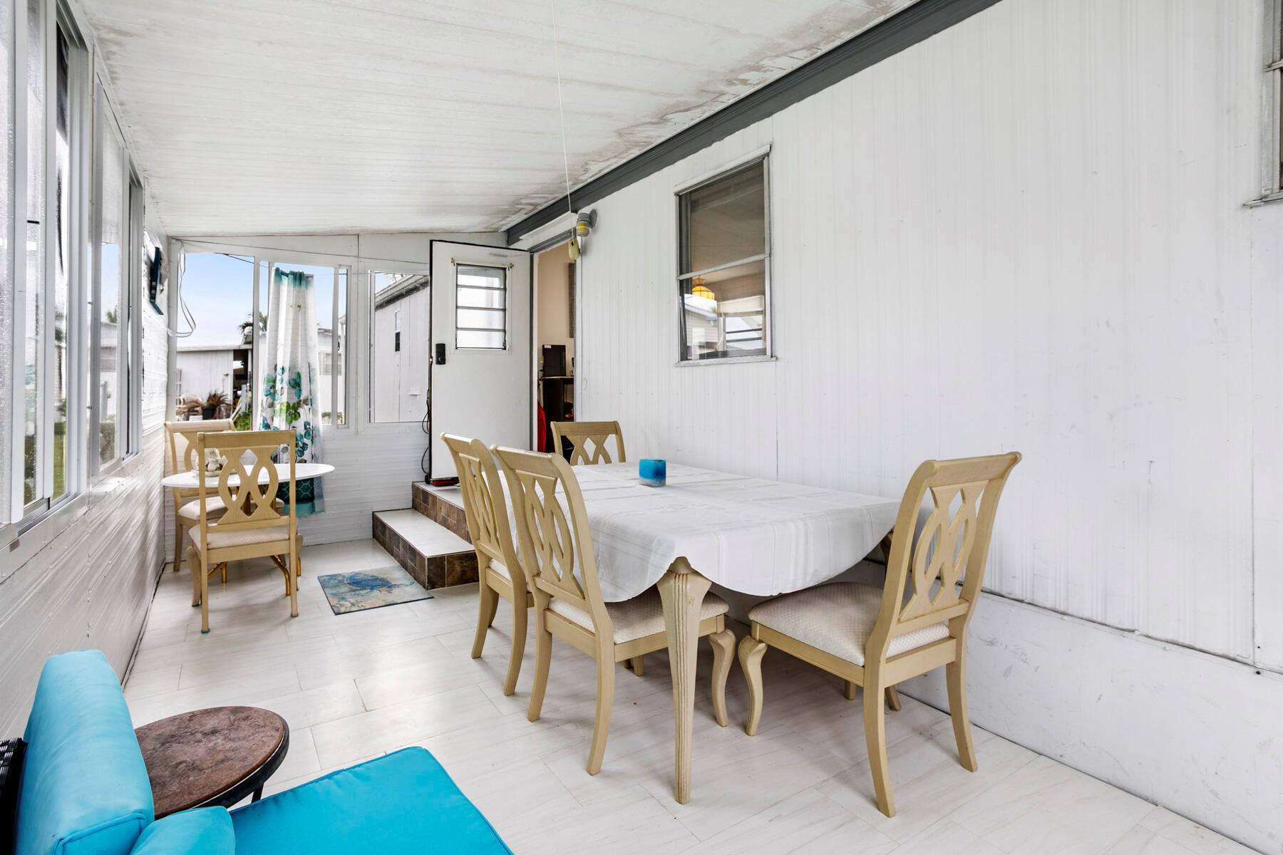 Cozy South Florida Retreat. Welcome to your perfect winter getaway! This beautifully maintained 3-bedroom, 1.5-bath home features an open floor plan, the kitchen seamlessly flows into the bright and airy living room perfect for entertaining or relaxing after a day in the sun. For additional living space, the enclosed patio with tile flooring and acrylic windows provides a cozy spot to enjoy the Florida weather year-round. The split-bedroom layout offers privacy for you and your guests. Outside is a long driveway and storage shed adding convenience and functionality. Located in a 24-hour manned gated community, enjoy access to two heated pools, a clubhouse, pickleball courts, and a full range of activities. Just 15 minutes from the beach, this well-kept home has newer windows, a newer A/C,