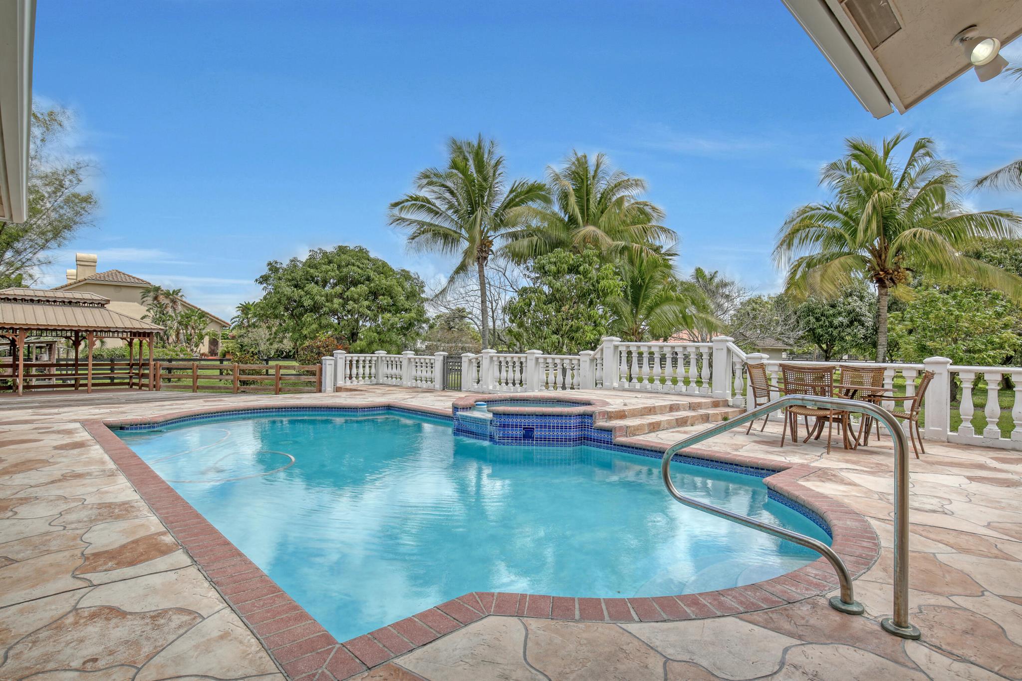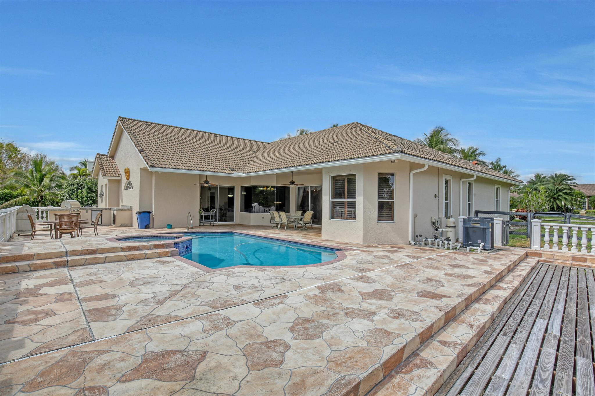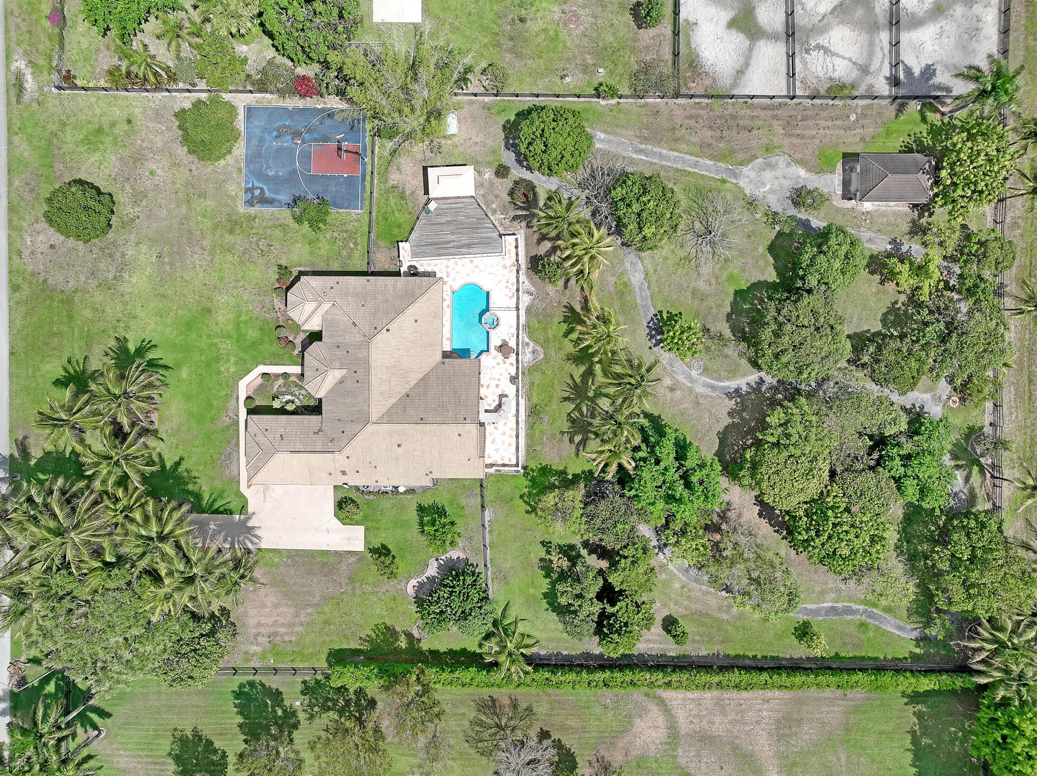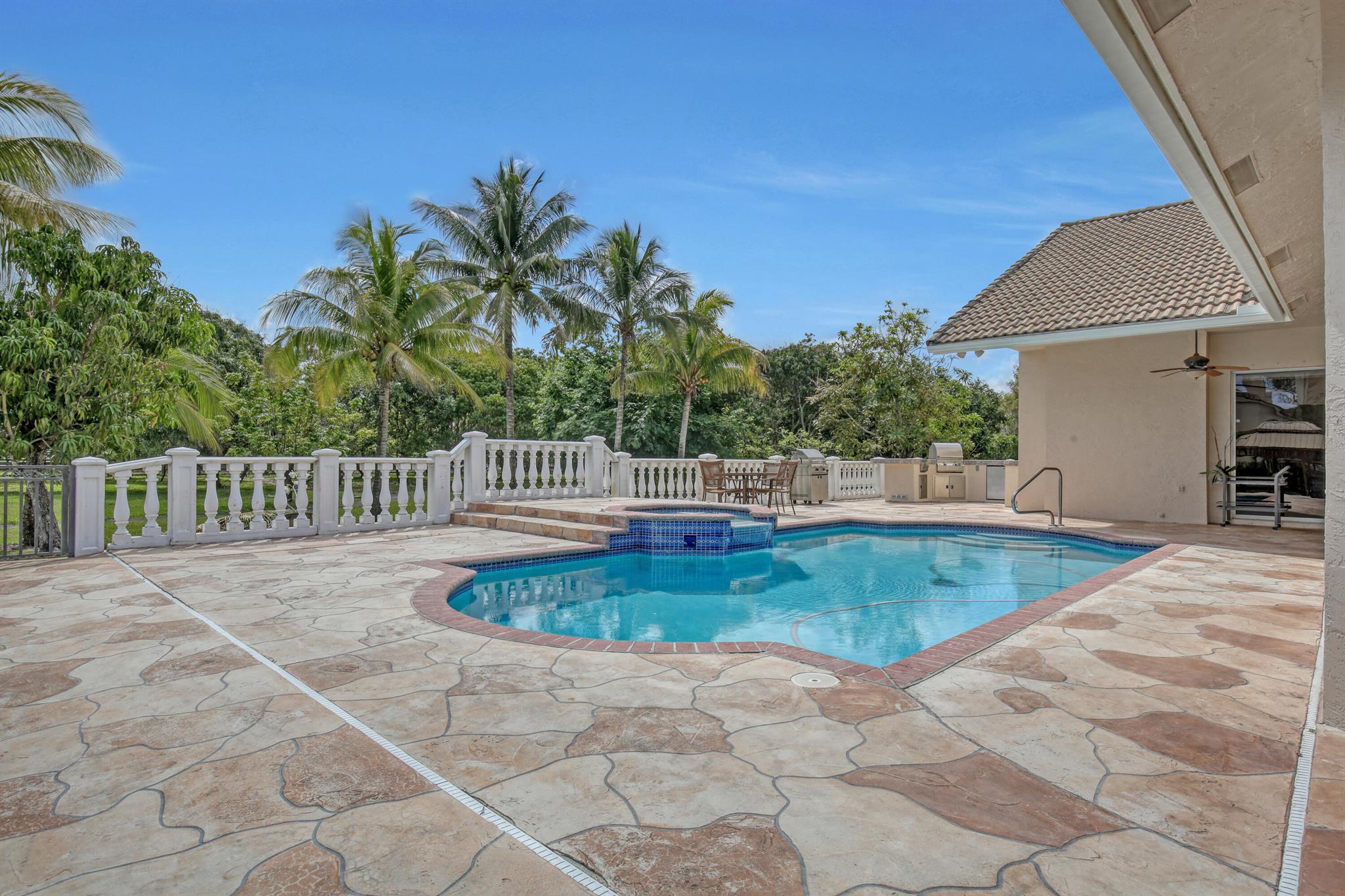 Enjoy all that Wellington has to offer in the beautiful 4 bedroom 3 bath triple split home on 1.91 acres in Paddock Park 2, this property is located on the bridle path and is hacking distance to Wellington International and Global Dressage. This home has soaring ceilings, heated pool with Jacuzzi, summer kitchen, air conditioner and water heater from 2021, washer and dryer from 2022, porcelain tile throughout, attached three-car garage plus additional detached one-car garage.