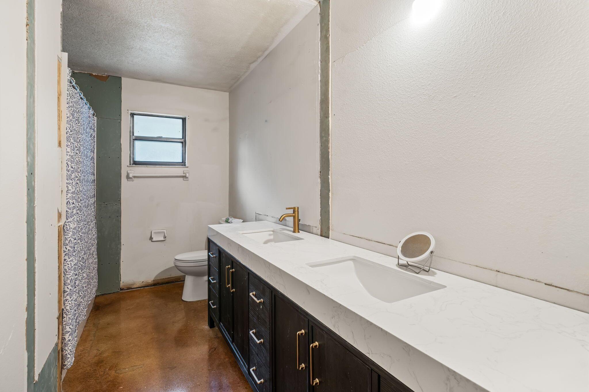 Situated on almost a half-acre lot offering exceptional privacy, this spacious 3BR, 2.5BA home features over 2,000 sq ft under air, with renovations already underway. Interior updates include polished concrete flooring, a fully updated kitchen with new cabinets, quartz countertops, and all-new stainless steel appliances. Bathrooms offer three new toilets, a new pedestal sink in the half bath, and a new double-sink vanity and shower in the guest bath. The interior has been prepped and partially painted during the renovation and is ready for the remaining finish work. The living room features high ceilings and a striking stone fireplace. A brand-new septic system and tank were recently installed. An excellent opportunity to complete your vision.