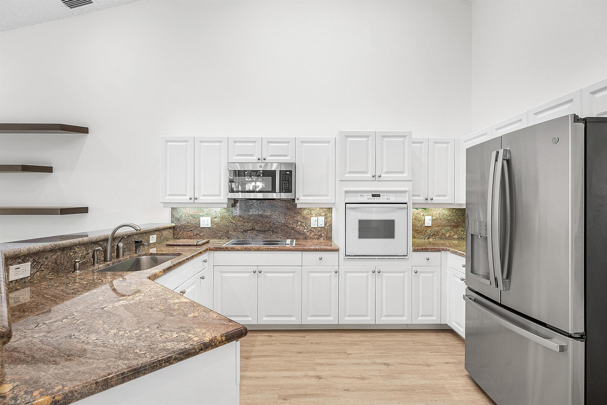 Beautifully maintained 3BR/3BA + Florida room home on a spacious corner lot in the prestigious Aberdeen Golf & Country Club, located in Sterling Lakes, an all ages enclave of only 41 homes. Features include volume/vaulted ceilings, new engineered wood floors (no carpet), fresh interior paint, and abundant natural light. Contemporary kitchen with granite countertops, white shaker cabinets, and new refrigerator/microwave. Primary suite offers walk-in closets, dual vanities, soaking tub, and separate shower. All showers have new flooring. Enjoy lake views from the expansive screened-in patio. Additional highlights: hurricane shutters, impact windows in Florida room, new light fixtures/fans, 2021 tile roof, and newer HVAC systems. Move-in ready and impeccably maintained.