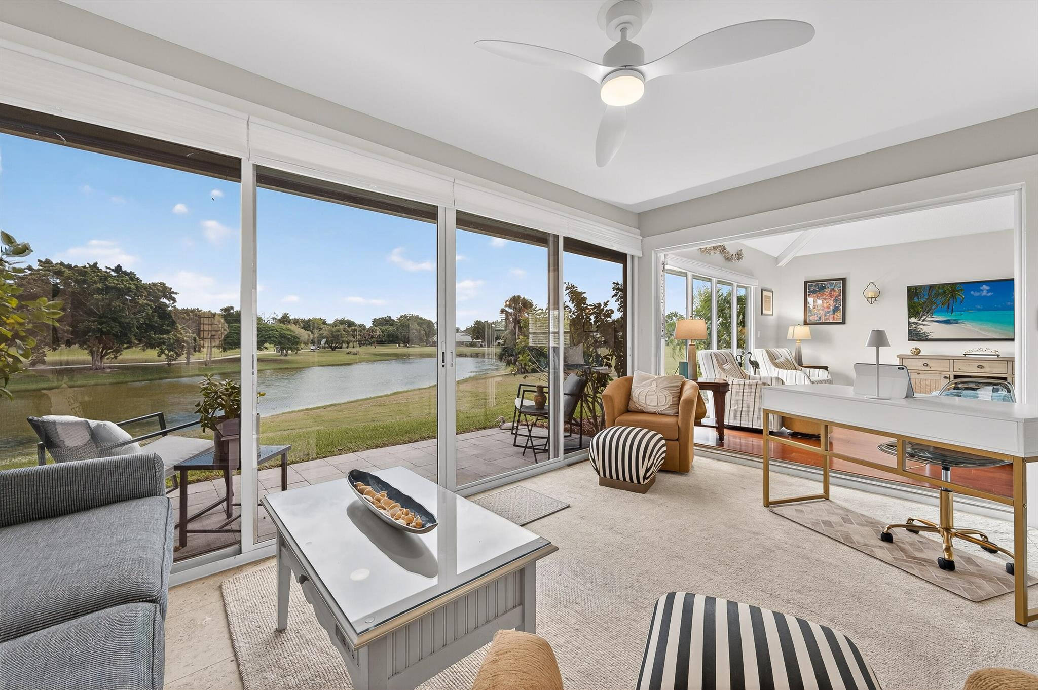 UNMATCHED WATER & GOLF VIEWS -- coastal living at its finest! Step into this beautifully updated, coastal-themed 3bed, 2bath villa & experience one of the very best views in the entire community. Overlooking a sparkling lake with the manicured golf course just beyond, this home delivers the serene, picture-perfect backdrop every day. Featuring a 2021 roof, inside laundry room, vaulted ceilings, & an expansive great room filled with abundant natural light. This villa feels bright, open, & inviting. Enjoy morning coffee or evening sunsets from the sunny enclosed patio, where the sweeping water views truly shine. Located in the sought-after Heritage Ridge community, residents enjoy access to a community pool, tennis courts, golf course & restaurant. Golf memberships are optional.