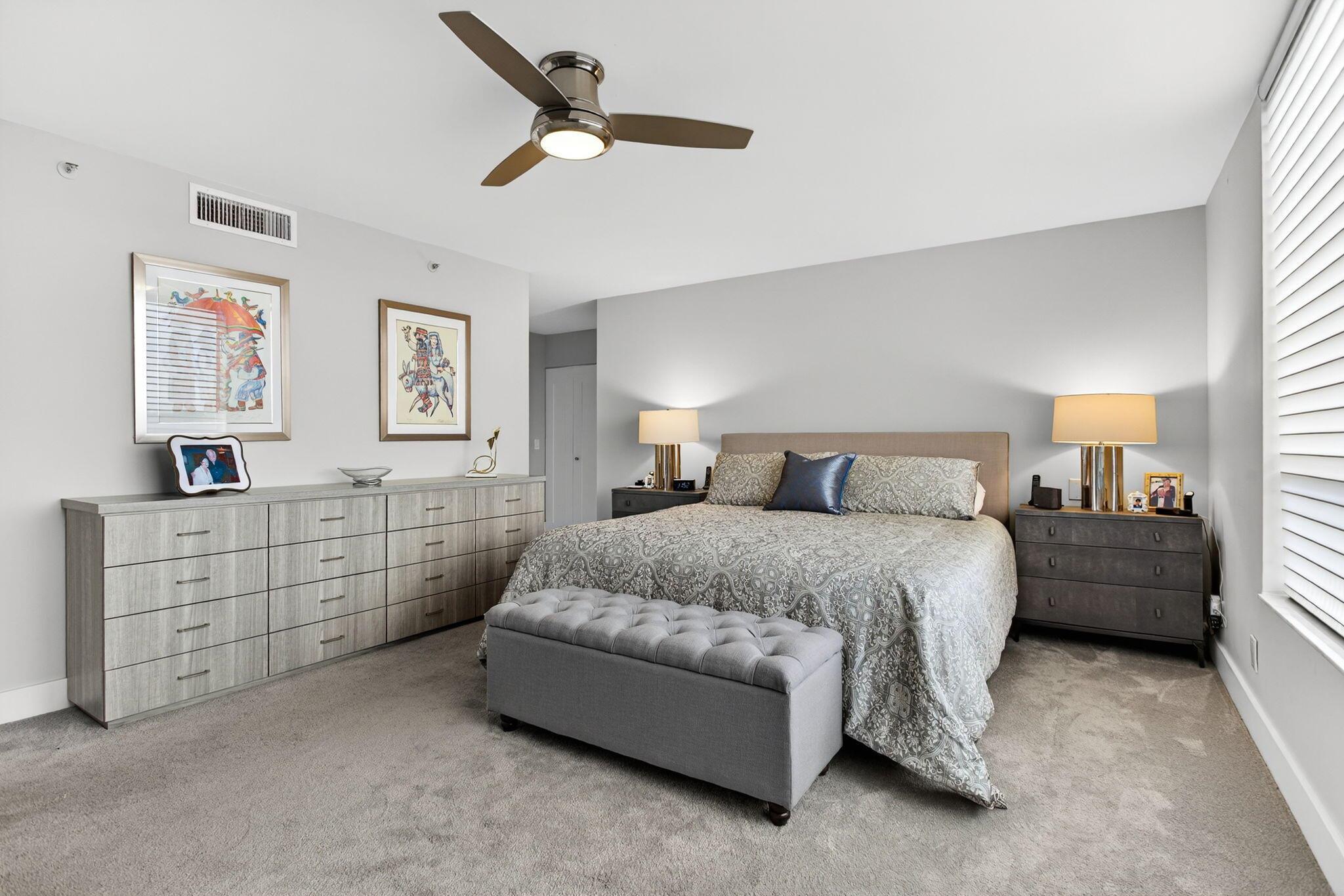 Stunning renovated condo in Promenade. Expanded living space for maximum use. Large modern white and gray tile flooring, electric blinds, upgraded doors and hardware, smooth ceilings, and more. Open kitchen offers white cabinetry, quartzite counters, glass tile backsplash, stainless appliances, added bar seating, and extra storage. 3rd bedroom converted into a spacious office off the primary suite, complete with custom built-in. Primary and 2nd bedrooms feature upgraded carpet and custom closets. Primary bath redone with double sinks, added storage, a large upgraded shower with bench, new toilet, elegant lighting, dual mirrors, and a built-in linen closet. 2nd bath and powder room both fully updated. Extra laundry tub and closet! Southern and eastern views overlooking golf and water.