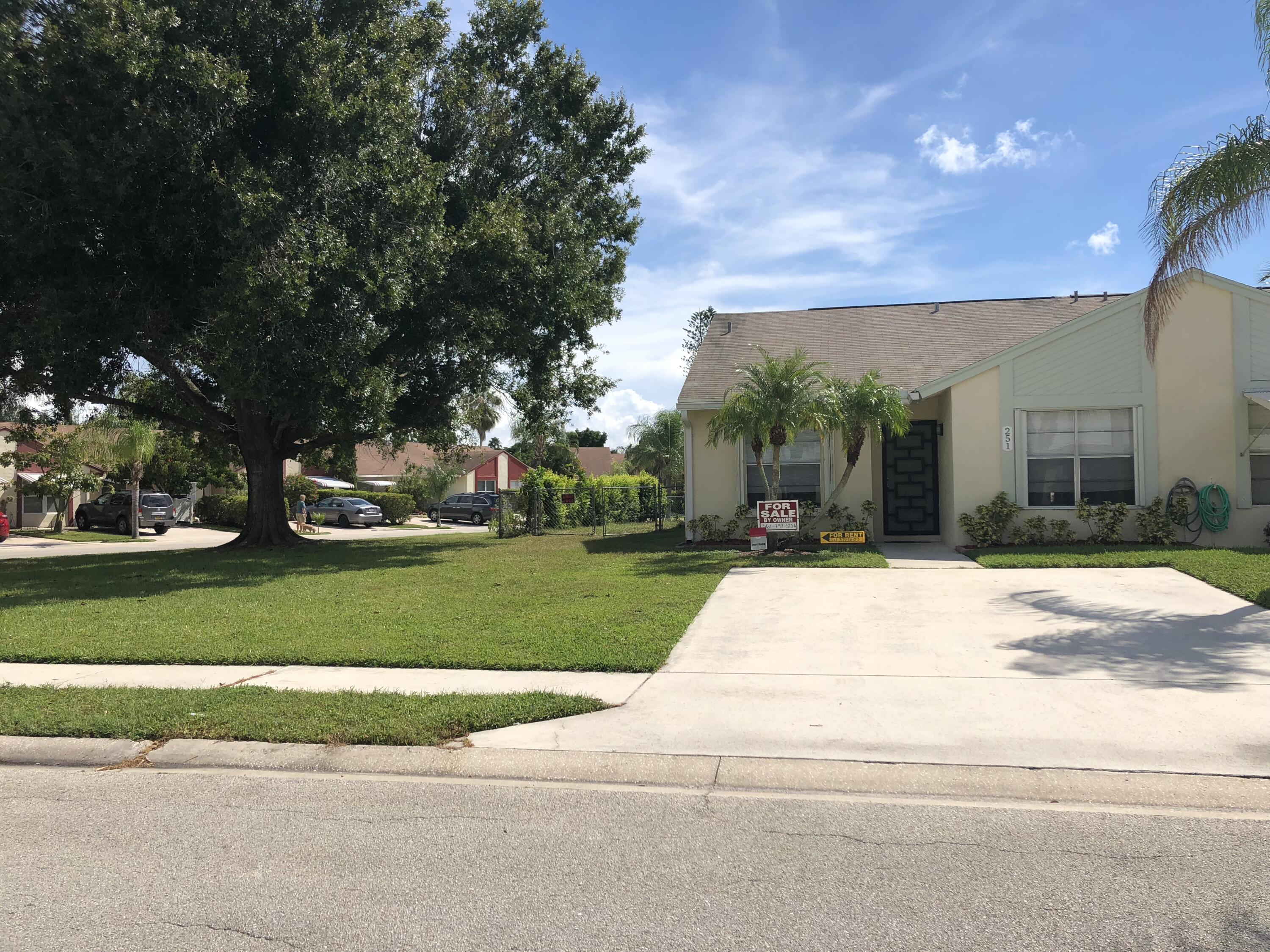 Bring your dogs! This charming 2-bedroom, 1-bath villa sits on a huge fenced corner lot with a spacious screened patio featuring a built-in doggy door that leads right into the fully fenced yard.Enjoy an inexpensive, pet-friendly HOA with no rental restrictions. The home is fully tiled throughout and offers a large living/dining area, a kitchen with a convenient breakfast bar that doubles as a work/computer space, and ceiling fans in every room. Solid CBS construction with full hurricane protection provides peace of mind. Located in the highly sought-after Jupiter school district.This unique end-unit villa is positioned on an oversized piece of land that can serve as a private play area or be fenced in to create an expansive private space ideal for storing. Bring your boat also!