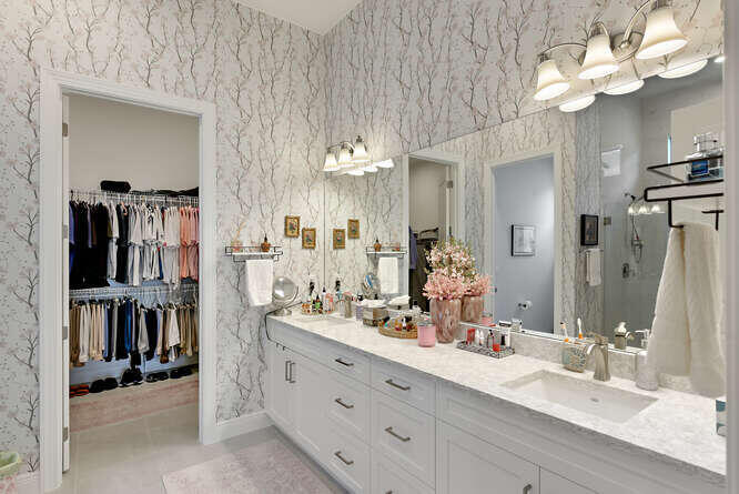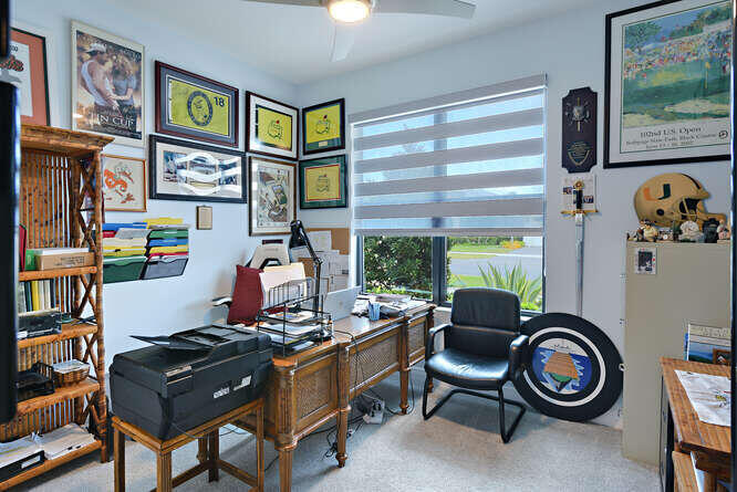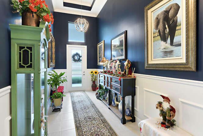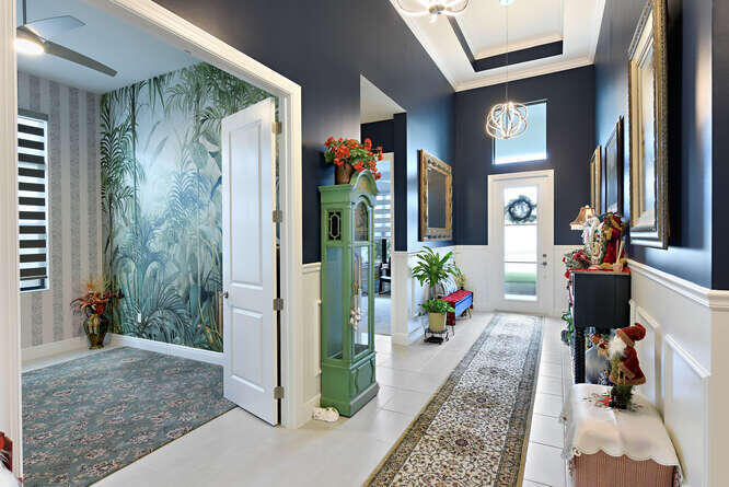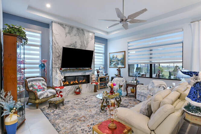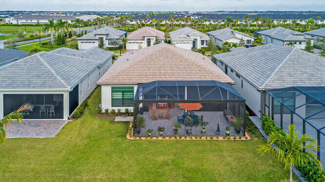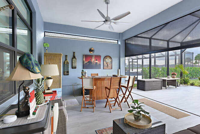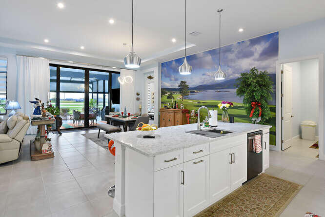 Absolutely stunning and fully upgraded 3BR/3BA + Bonus Room home located on a premium lot overlooking the Par-5 #8 tee box in the luxury community of Astor Creek Golf & Lake Club. Enjoy gorgeous golf views, a lake beyond the tee box, and spectacular nightly sunsets from one of the largest outdoor living spaces in the community. This home features a 1,200 sq ft screened patio with porcelain tile decking, remote lanai shades, custom privacy wall, and an 85'' outdoor TV--perfect for year-round entertaining. Inside, the home offers a dramatic 23' entryway with 12' ceilings, tray ceilings, custom wainscoting, crown molding, multiple designer murals (including two Pebble Beach #18 feature walls), wallpapered baths, frameless shower doors, upgraded lighting and fans, custom roller shades, & a 16'