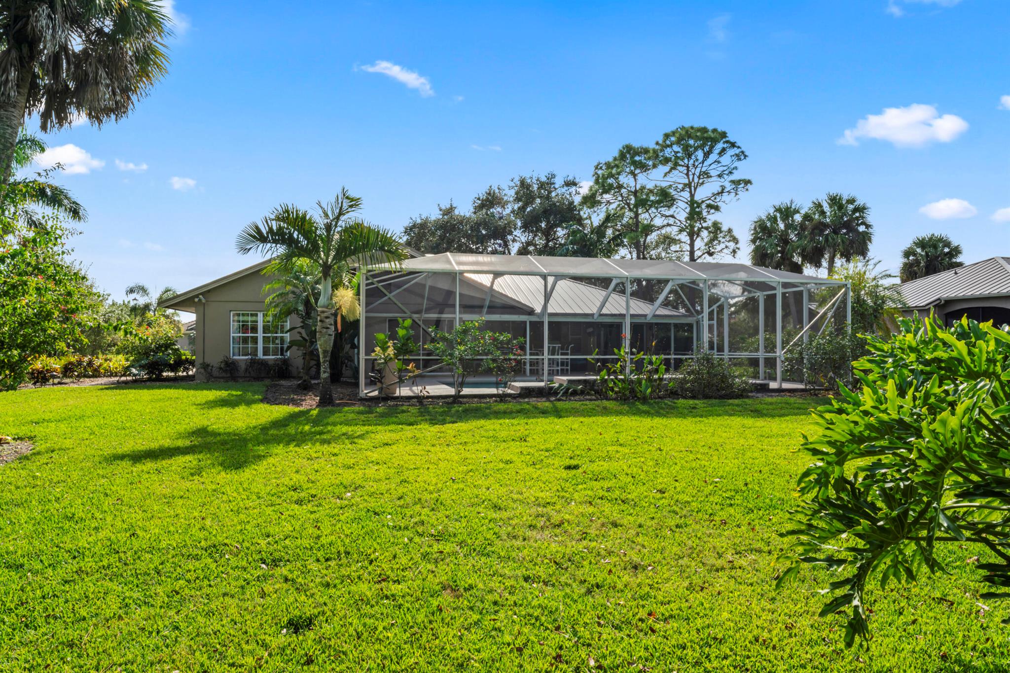 Resort-style family living in this private updated pool home on almost 1/2-acre in gated, guarded Meadowood Golf & Tennis Club. This 3BR/2.5BA, oversized 2-car garage home features a split plan with 4 sliders to a screened lanai and pool, plus living, dining, family room and breakfast nook. Quiet privacy away from the course. No membership required; HOA includes cable and water, with no application fee or deposit. Pet-friendly with Championship 18-hole public-friendly golf, tennis, pros, fitness, library, outdoor bar, pro shop, locker rooms. New 2024 tile, 2023 water heater, all 2025 appliances, 2021 metal roof, plus 3 free months of choice membership. Just south of Vero Beach with quick access to 95 and turnpike for commuters.