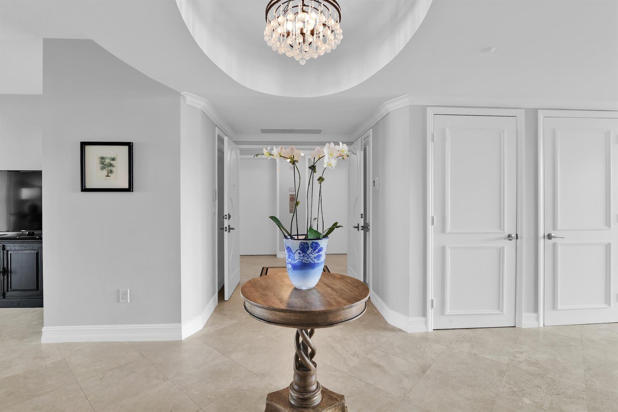 LUXURY condo in a resort-style community with private Ocean Club and beach access. You feel sense of arrival as you step off the modern elevator into your private foyer and enter this 2BR w/Den and 2 and half bath residence featuring multiple large balconies, with striking vistas of Ocean and tropical grounds. This luxury condo offers 9-ft ceilings, marble and porcelain floors, elegant kitchen and floor-to-ceiling impact glass windows for abundant natural light. The primary suite includes his and hers walk-in closets, a spa-style bath, and access to a private balcony. A second balcony, located between the kitchen and dining room, provides a convenient space for outdoor dining or relaxing. Additional features include a versatile den w/built-ins, a spacious laundry room with ample storage