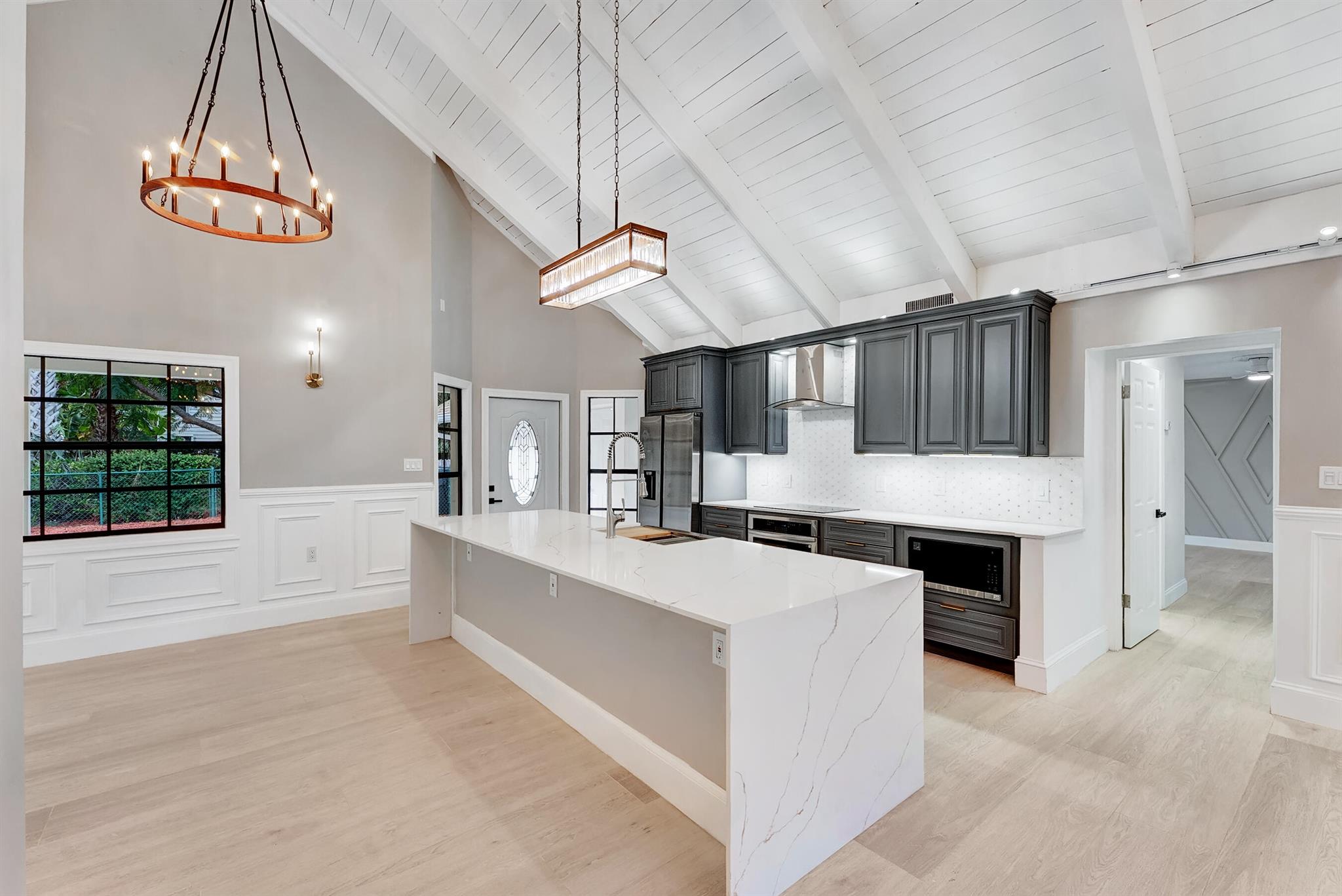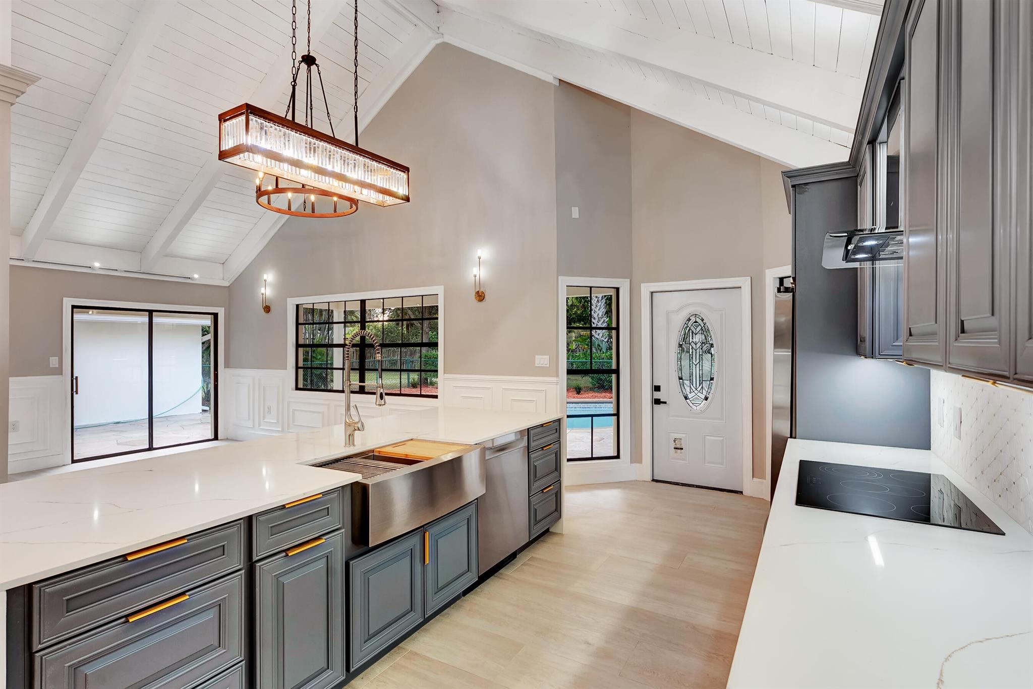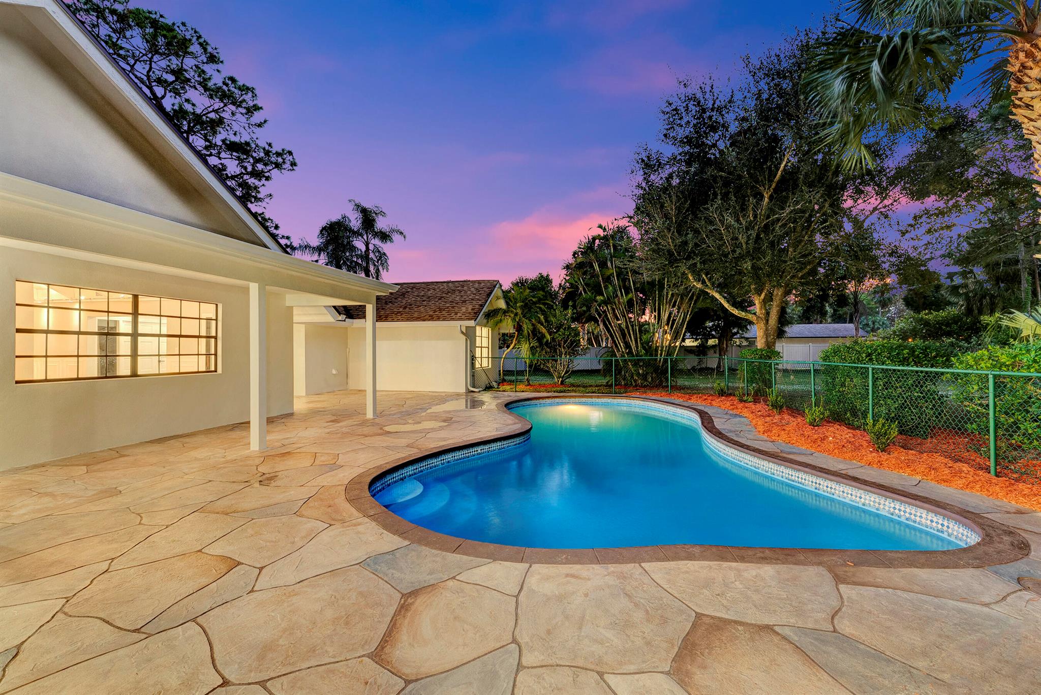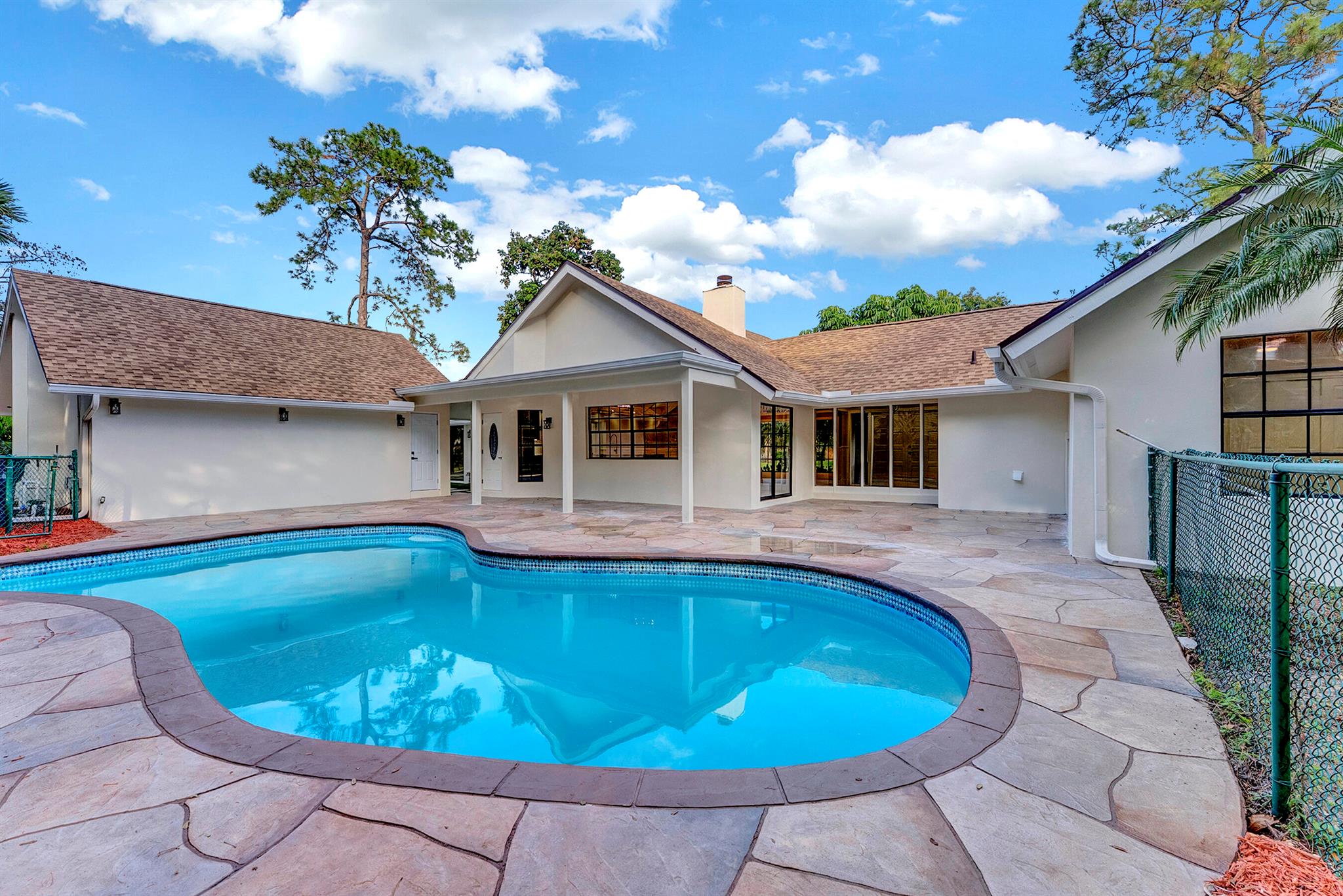 Welcome to this beautifully appointed 3-bedroom, 2-bath home on a spacious corner lot in Pinewood East. Step into a bright, open living area highlighted by architectural picture windows that fill the space with natural light, while the soaring vaulted wood ceiling adds inviting character and a striking focal point. A substantial kitchen island provides an ideal space for seating and gathering, complemented by a split floor plan, large bedrooms, a pool, and a detached garage. The expansive yard offers possibilities for play, pets, gardening, or outdoor entertaining. Located just moments from top-rated schools, equestrian venues, shopping, and dining, this home blends charm, space, and prime Wellington living.