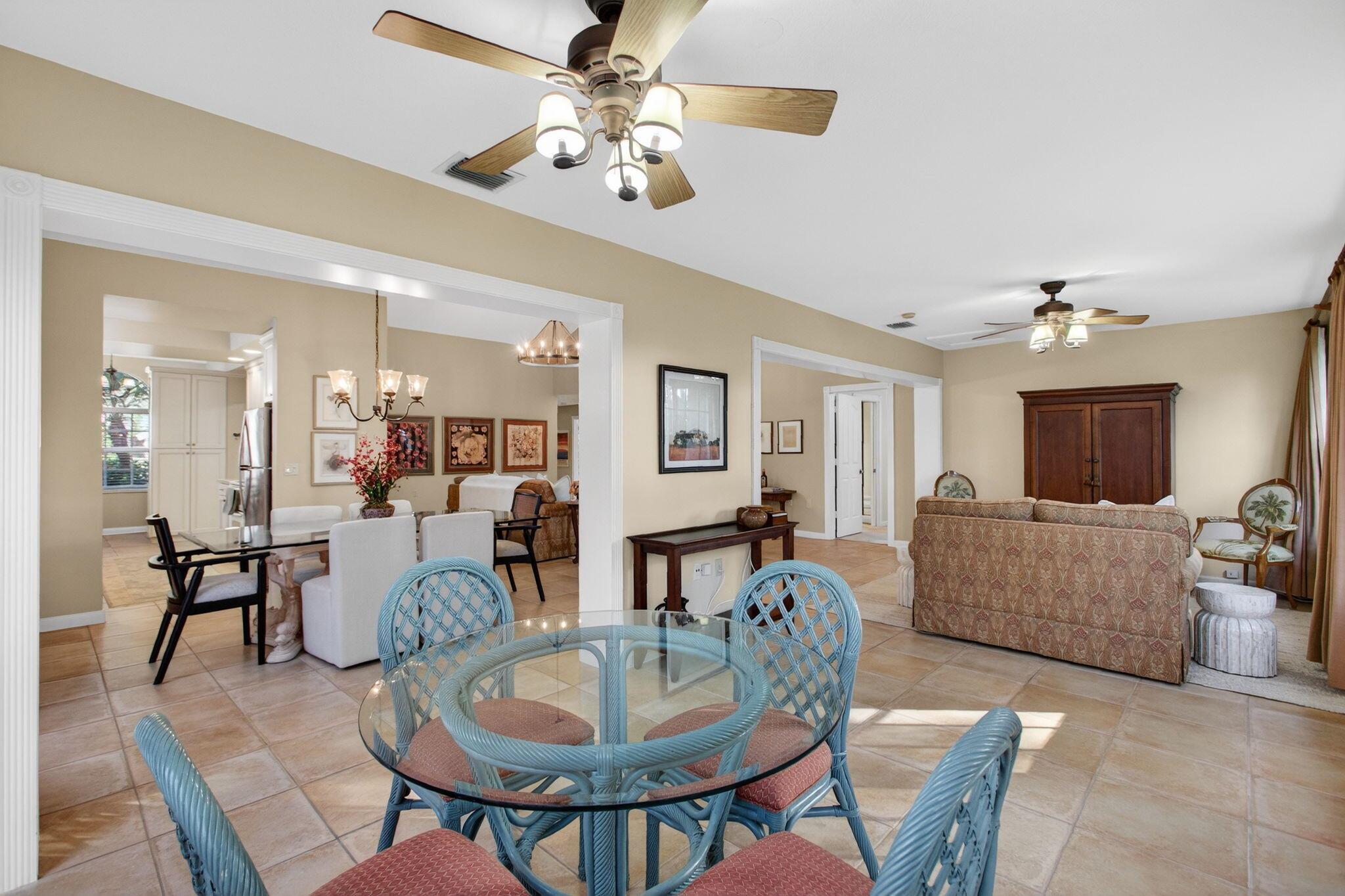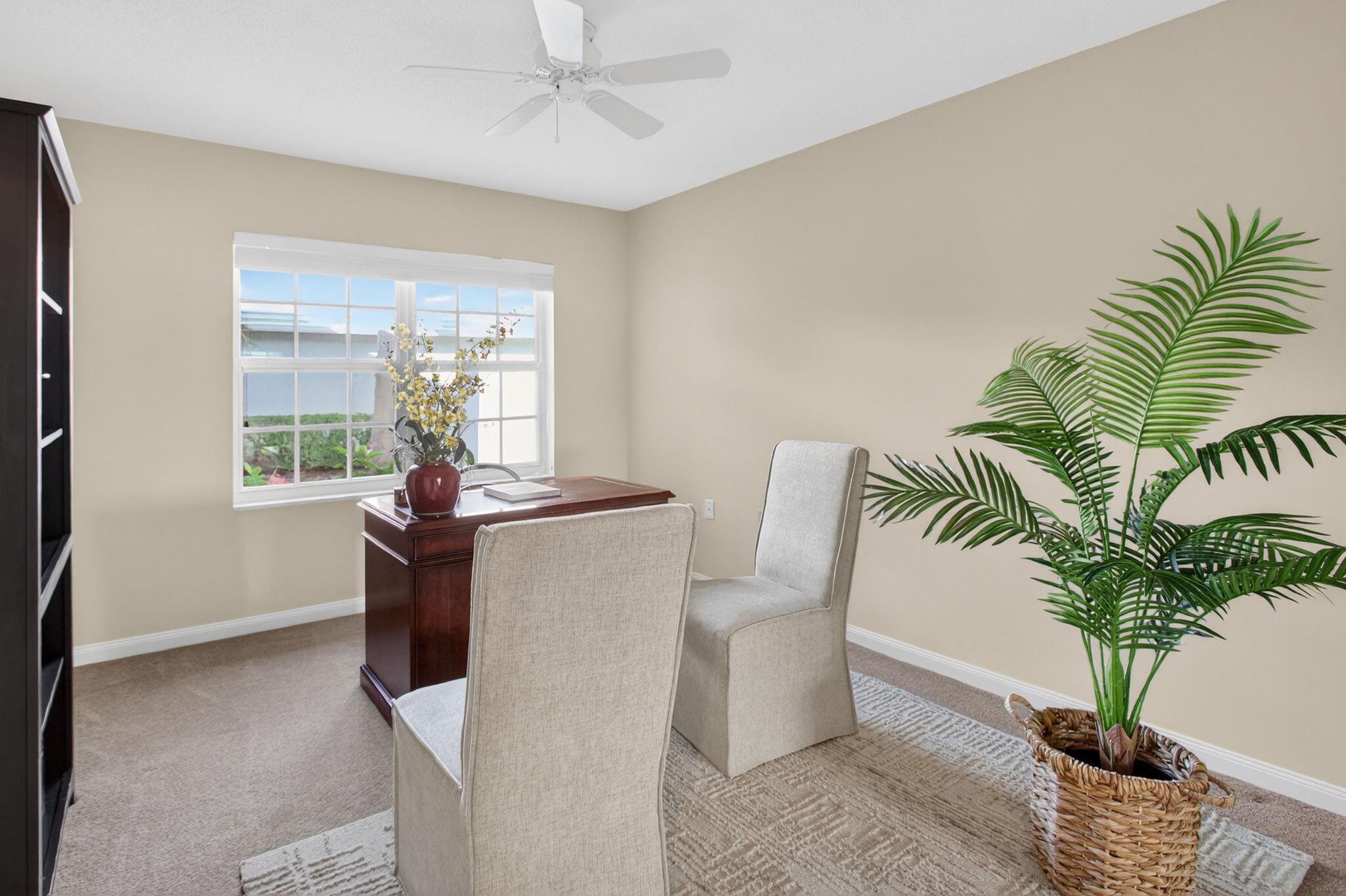 Lovely well maintained home in the heart of West Palm Beach! Enjoy South Florida living from the 24-hour manned golf gated community of Bear Island! This CBS residence features 3 bedrooms, 2 baths, side 2 car garage with large driveway, impact windows, newer A/C and tons of living space. Freshly painted with beautiful neutral tile flooring in main living areas and plush carpet in bedrooms, this home boasts tons of natural light, spacious kitchen with tons of cabinetry, Onyx counter tops and custom pantry and counter top in breakfast area - perfect for small workspace. Generous primary suite leads to master bath with separate tub and shower. Guests will enjoy 2 separate bedrooms and renovated guest bath. HUGE and private backyard is surrounded by lush landscaping -