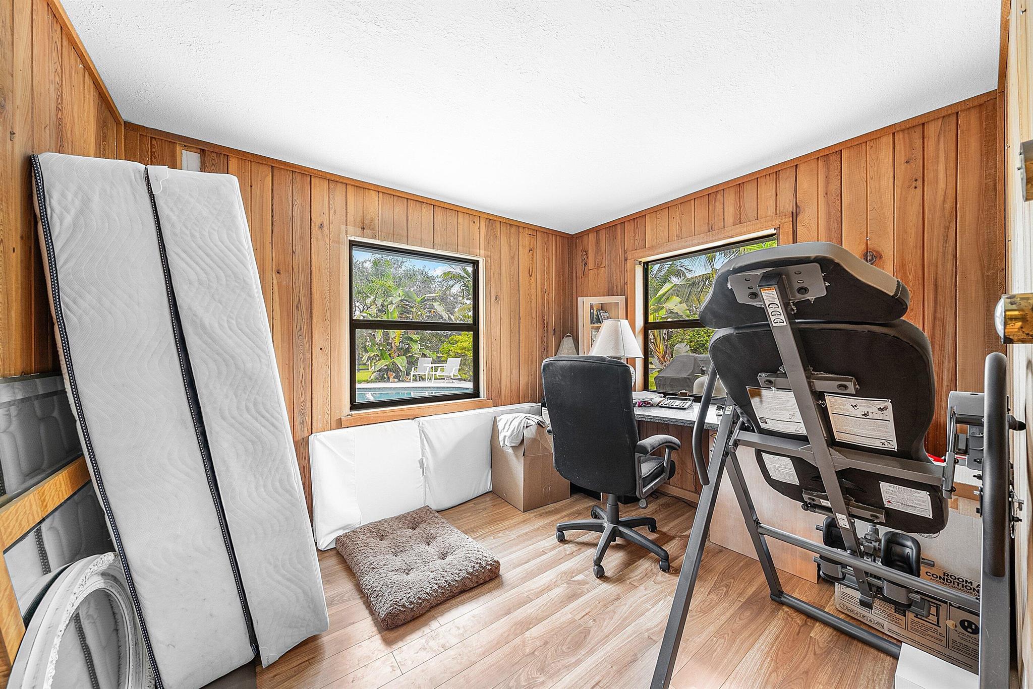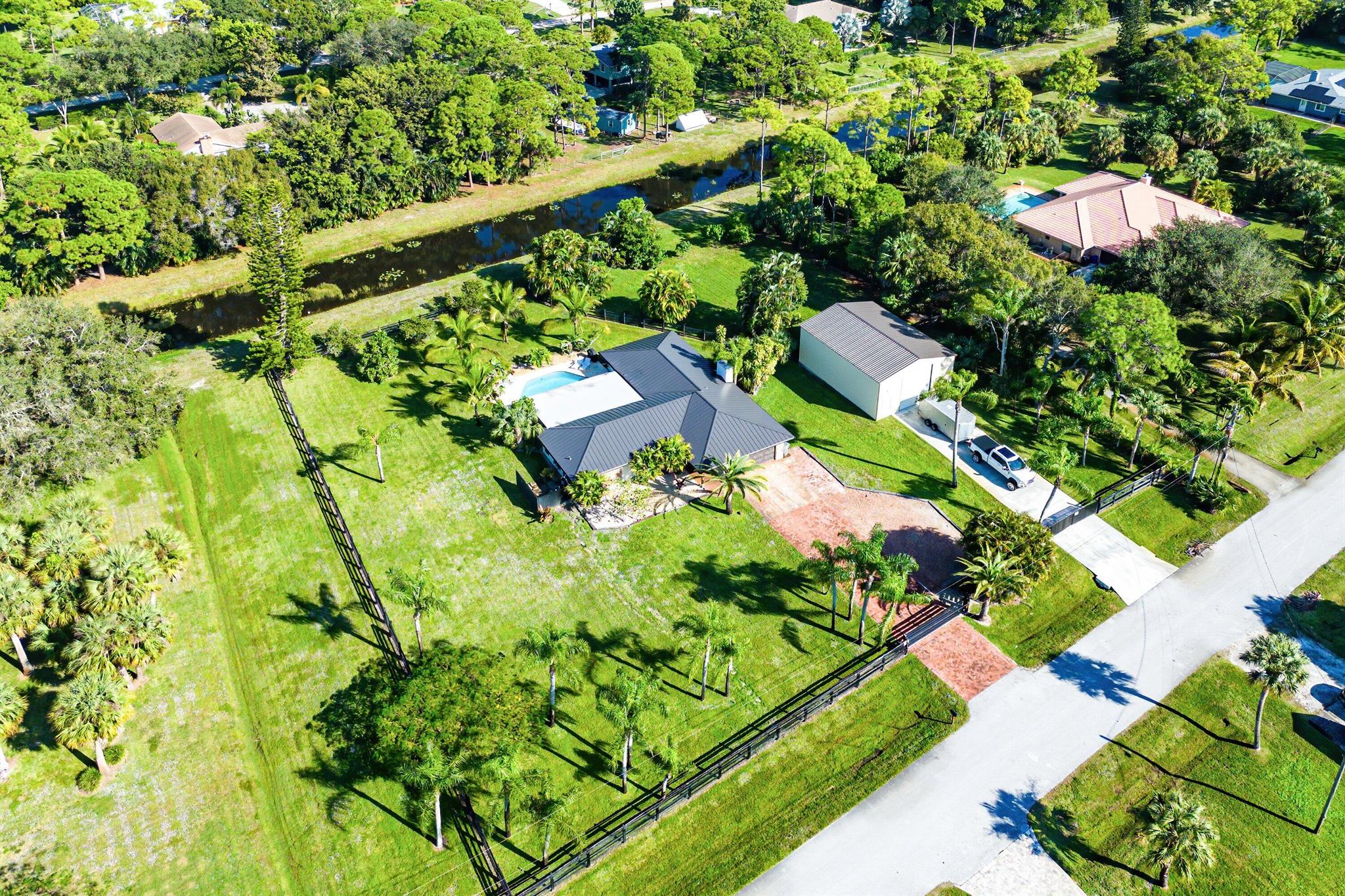 A truly rare front-section gem in one of Palm Beach Gardens' most coveted communities -- where peace, privacy, and prestige all meet. This single-story masterpiece sits on nearly an acre and a half of fully fenced, beautifully landscaped grounds with lush tropical gardens, fruit trees, and hard-wired landscape lighting that transforms the property at night. Highlights: 4 Bedrooms | 2 Baths | Office/Flex Room New 2022 Metal Roof + Full Impact Windows & DoorsCity Water, Paved Roads, Prime Front-Section Location,Spray-Foam Insulation for maximum energy efficiency,2021 Saltwater Pool with new paver deck & custom landscape lighting, 2024 1,200 SQ FT Detached Hangar Garage w/ 14' bay door ideal for RVs, Boats or Car collections along with paved driveway, Custom Kitchen w/ quartz