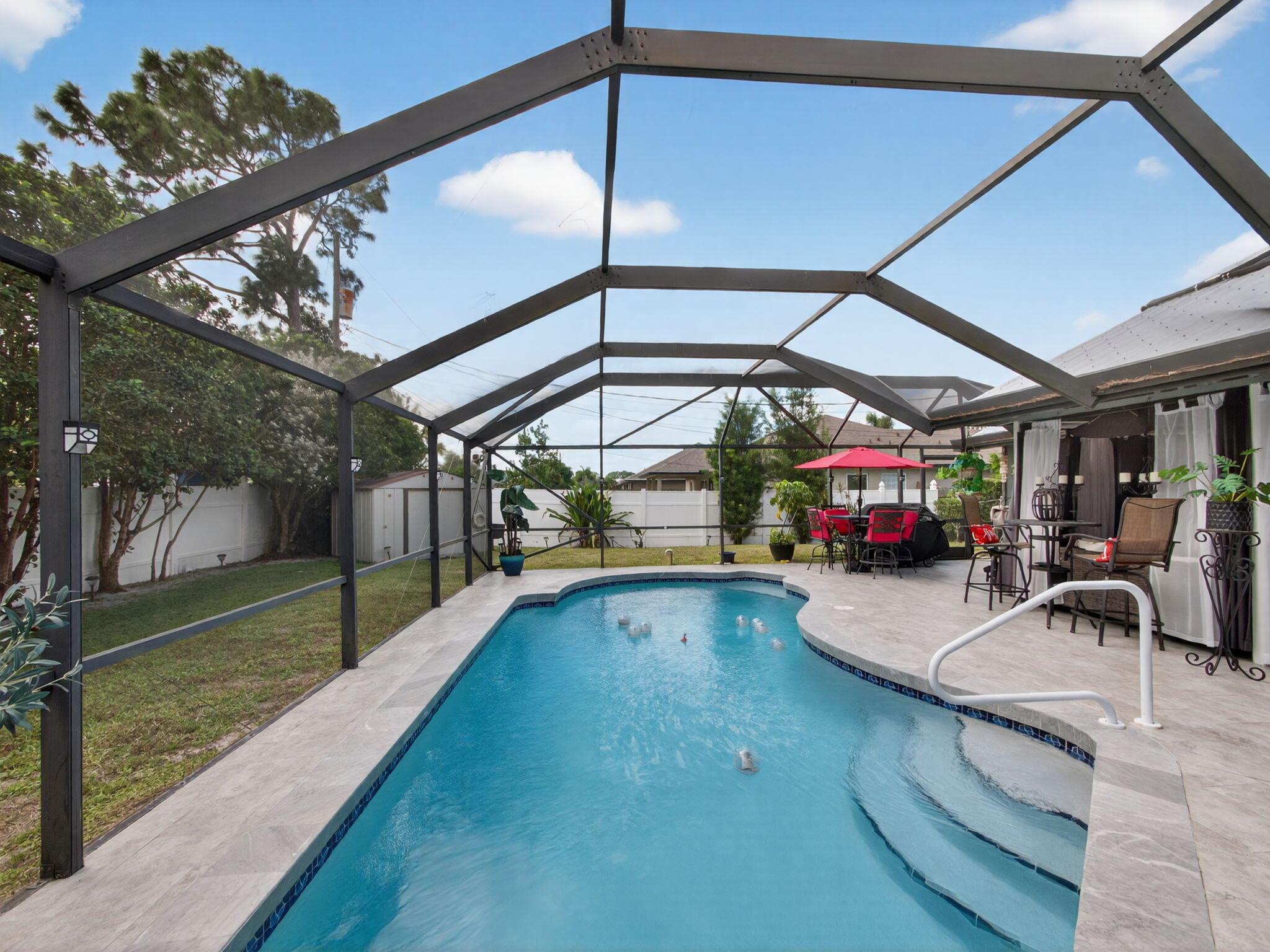 Slice of paradise home. 3 bedroom 2 bathroom Pool corner lot home in Central Port Saint Lucie. Close to shopping and 5 min from Tradition. Home boasts upgrades galore. NEW metal roof, NEW Impact glass windows, Newly refinished pool deck. NEW Interior Paint throughout the home, NEW kitchen countertops, NEW master bedroom shower and much more!!!. This home offers everything you are looking for, just bring your clothes!