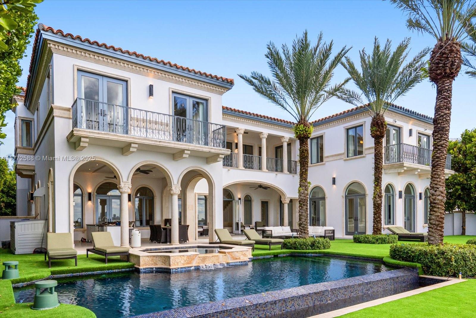 Luxury modern Mediterranean home on prestigious North Bay Road with breathtaking panoramic open bay views. Six bedrooms all with ensuite bathrooms, half bathroom and cabana bath. Featuring grand double height ceiling in entry foyer with stairs either side surrounding intimate sitting area, double master suites, theater/library, den w/fireplace, billiard room, and 12' ceilings throughout. The exterior has large covered patio with chef summer kitchen with commercial Viking appliances, and outdoor entertainment bar. Three car garage with double height ceiling for car lifts. Infinity pool with stunning sunset views to the west. With over 100 feet on water and new dock for you to moor a large yacht, on which you cruise Biscayne Bay to dine at various waterfront restaurants.