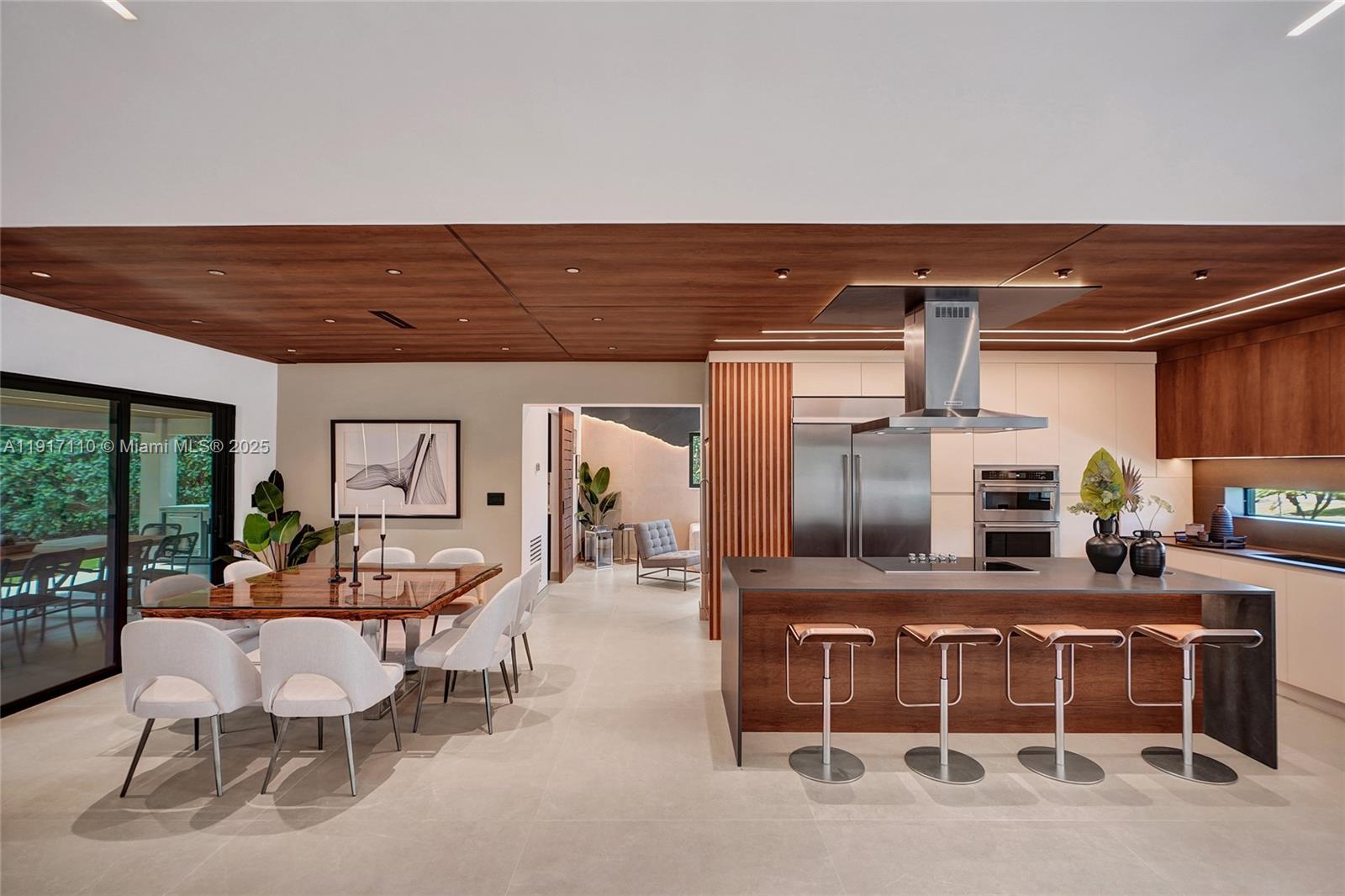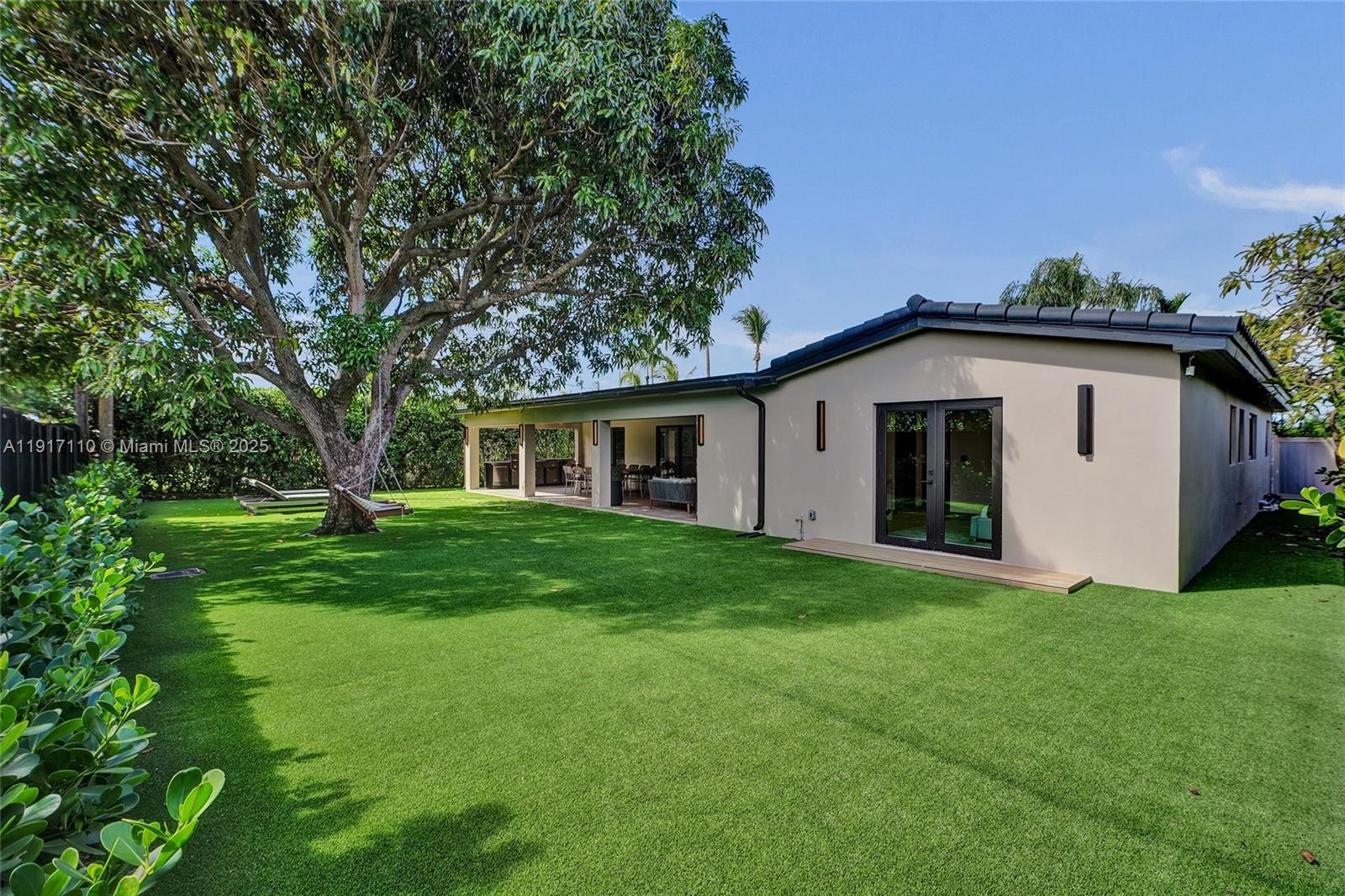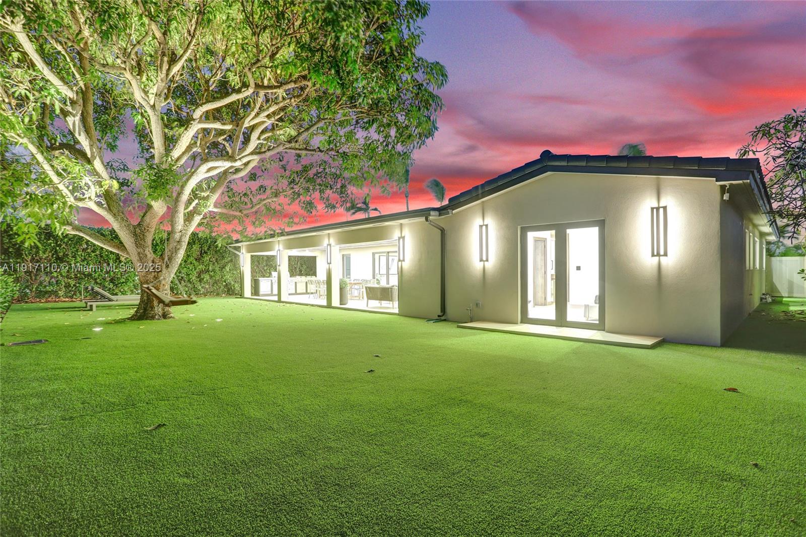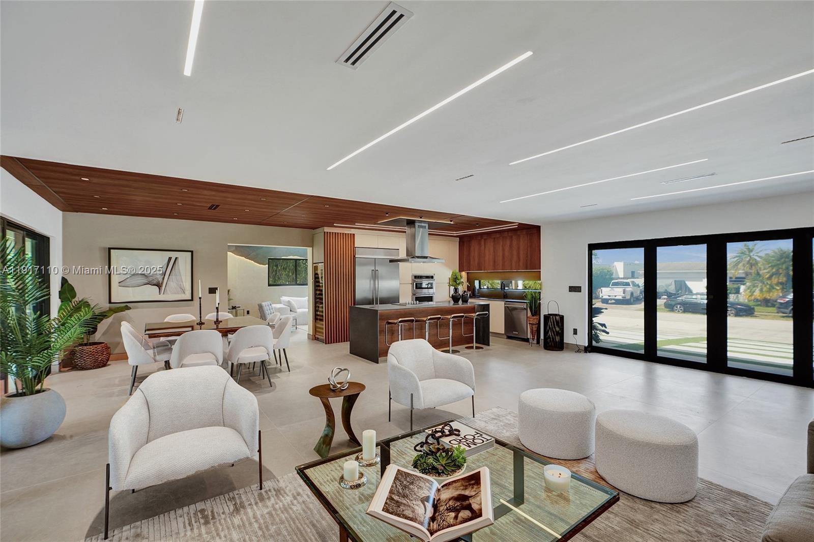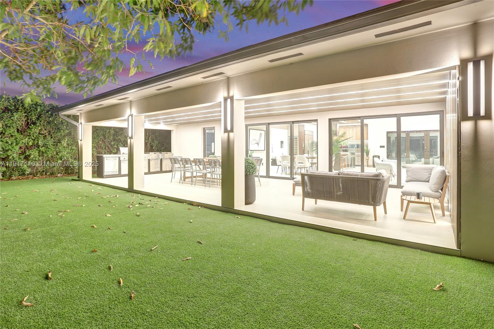Stunning, fully remodeled modern home featuring clean architectural lines, warm natural tones, and top-quality finishes throughout. The open-concept layout highlights a sleek Italian-style kitchen with custom wood cabinetry, quartz countertops, and top-of-the-line appliances, including stainless steel appliances. This elegant residence features impact-resistant windows and doors, Italian-built-in closets, large porcelain floors, high ceilings, and designer LED lighting. The spacious living and dining areas are surrounded by glass sliders that fill the home with natural light and create a perfect indoor-outdoor flow. The outdoor space is designed for entertaining, featuring a built-in BBQ, artificial grass, and beautifully landscaped gardens. Every detail combines luxury and functionality