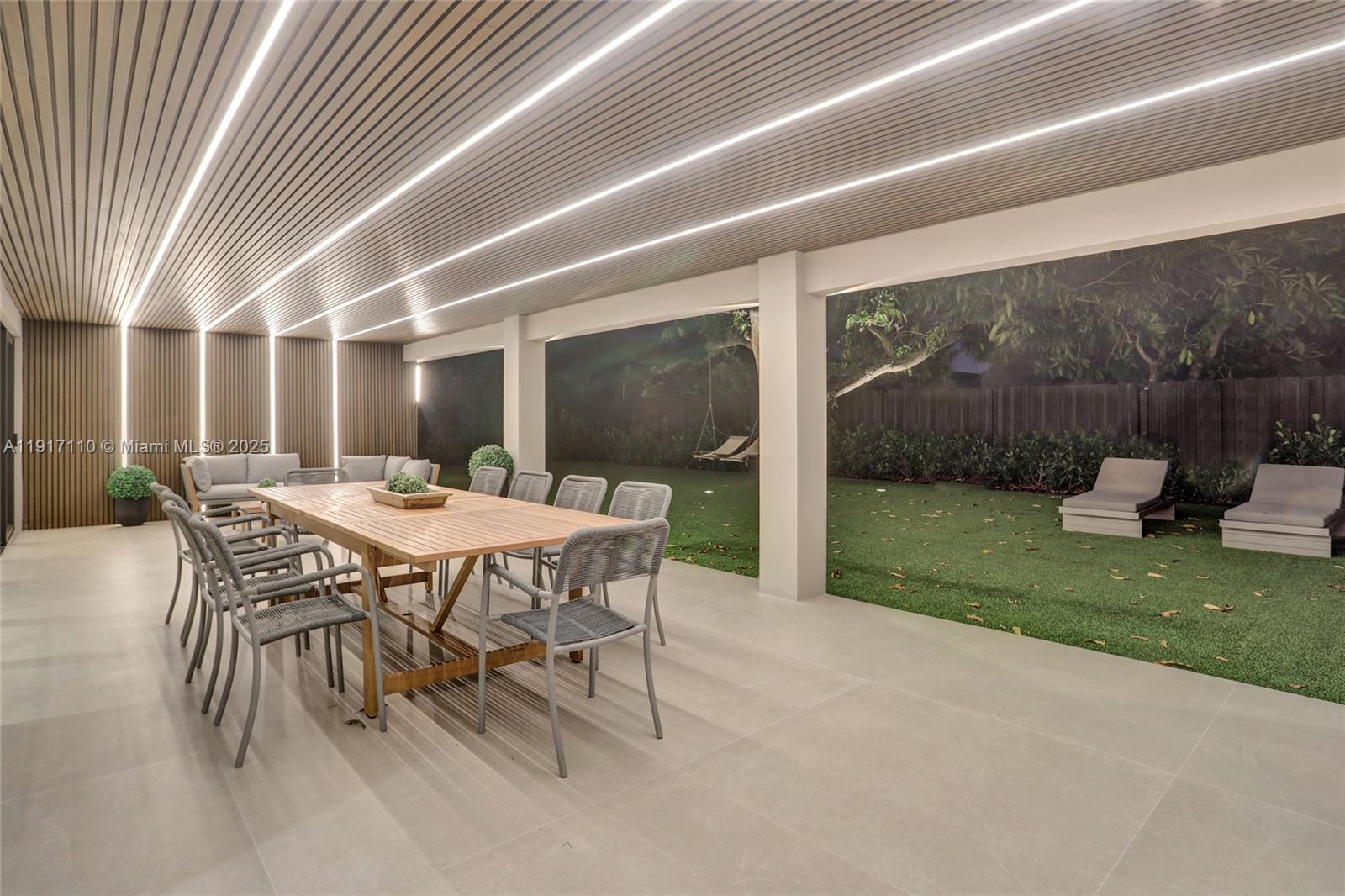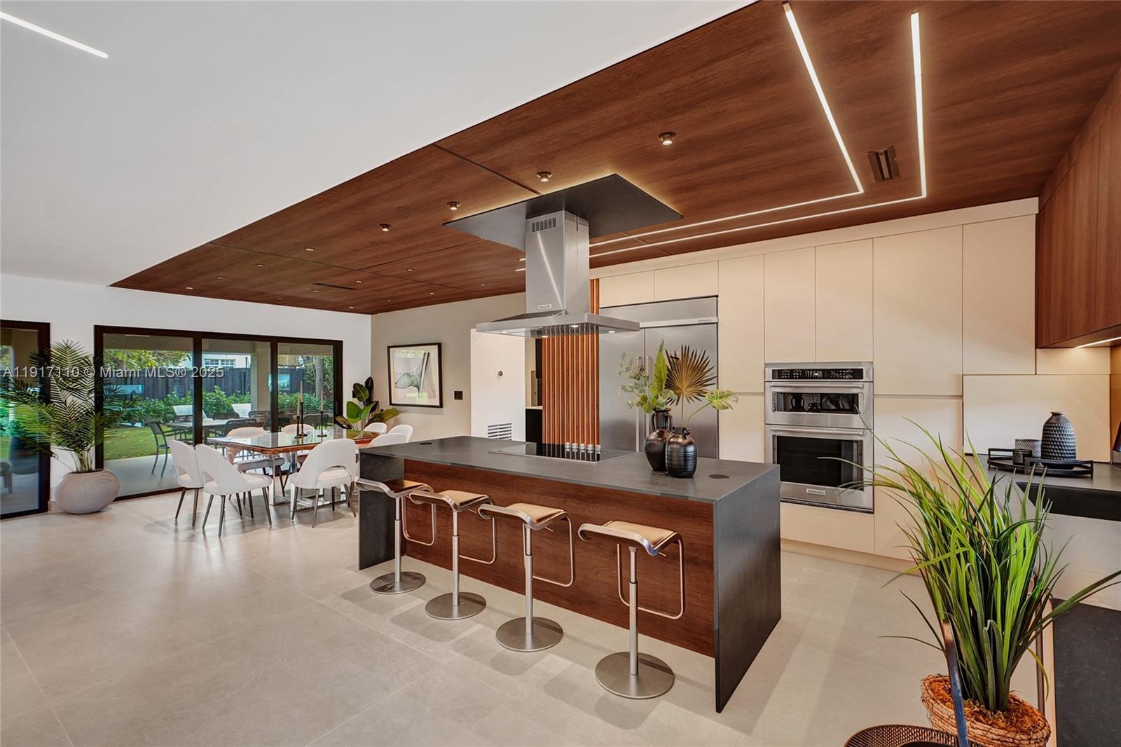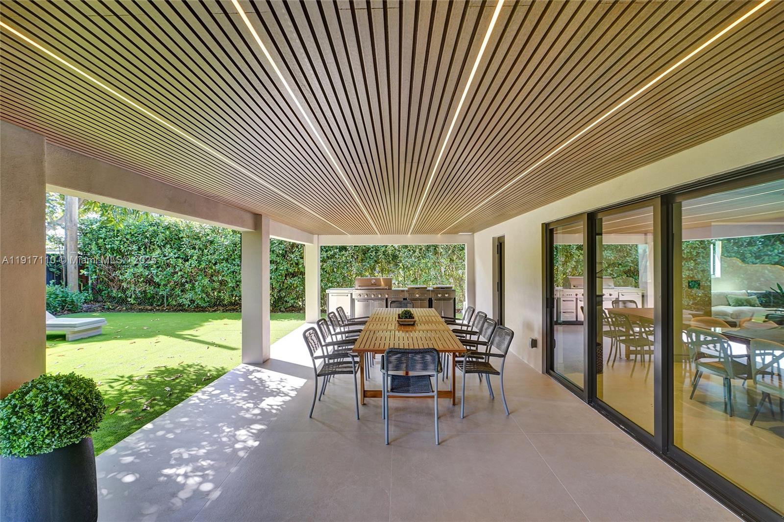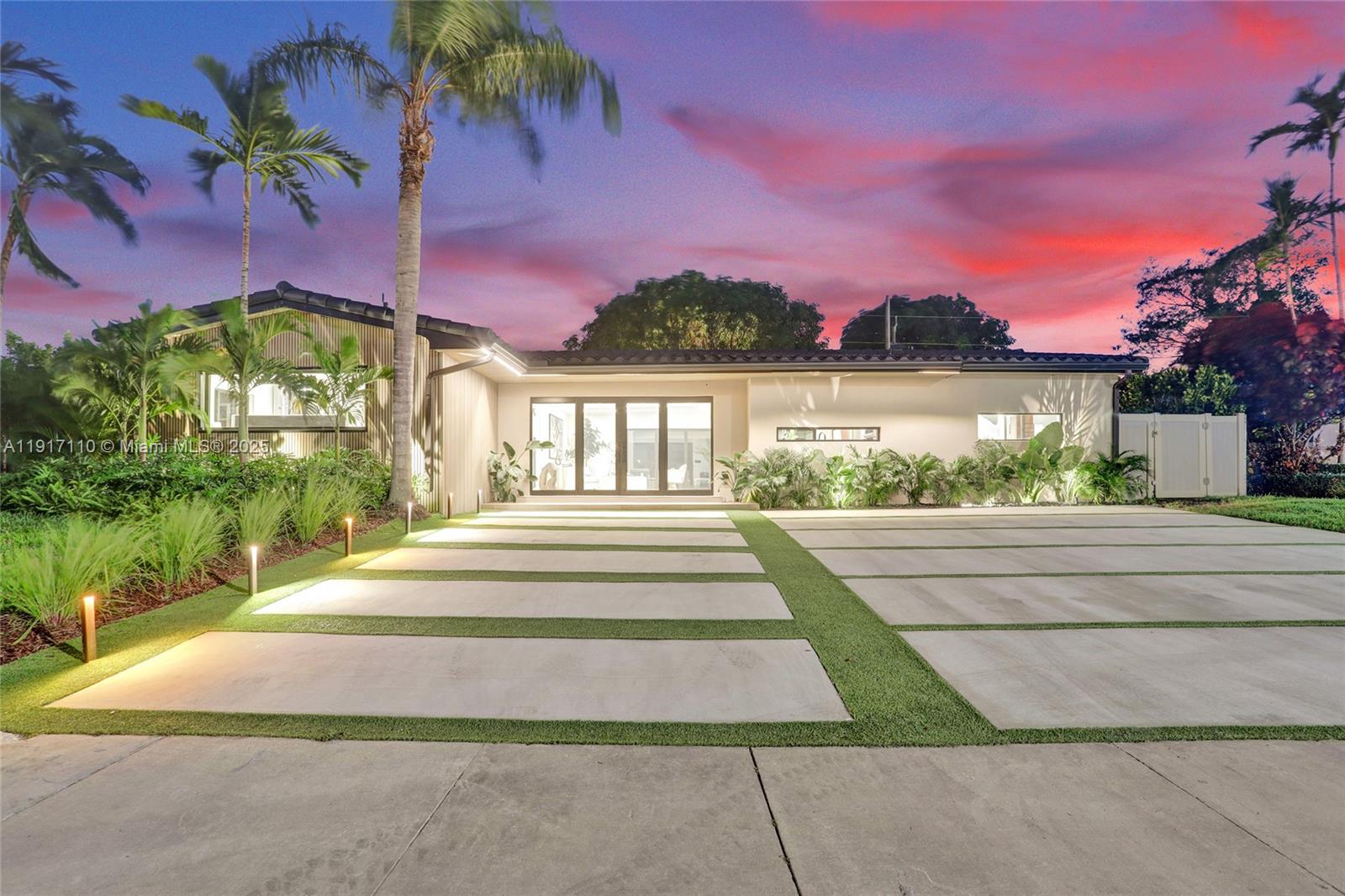 Stunning, fully remodeled modern home featuring clean architectural lines, warm natural tones, and top-quality finishes throughout. The open-concept layout highlights a sleek Italian-style kitchen with custom wood cabinetry, quartz countertops, and top-of-the-line appliances, including stainless steel appliances. This elegant residence features impact-resistant windows and doors, Italian-built-in closets, large porcelain floors, high ceilings, and designer LED lighting. The spacious living and dining areas are surrounded by glass sliders that fill the home with natural light and create a perfect indoor-outdoor flow. The outdoor space is designed for entertaining, featuring a built-in BBQ, artificial grass, and beautifully landscaped gardens. Every detail combines luxury and functionality