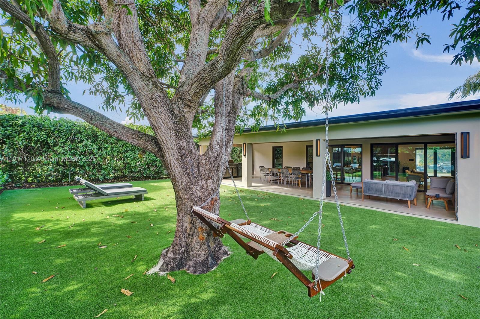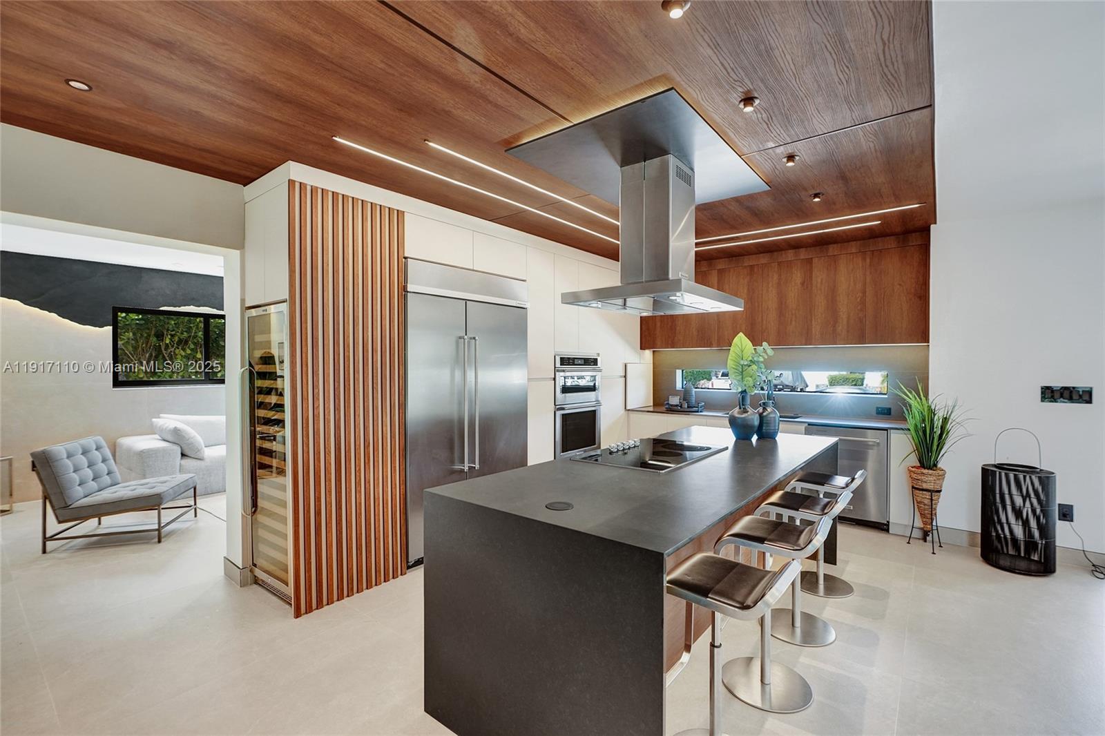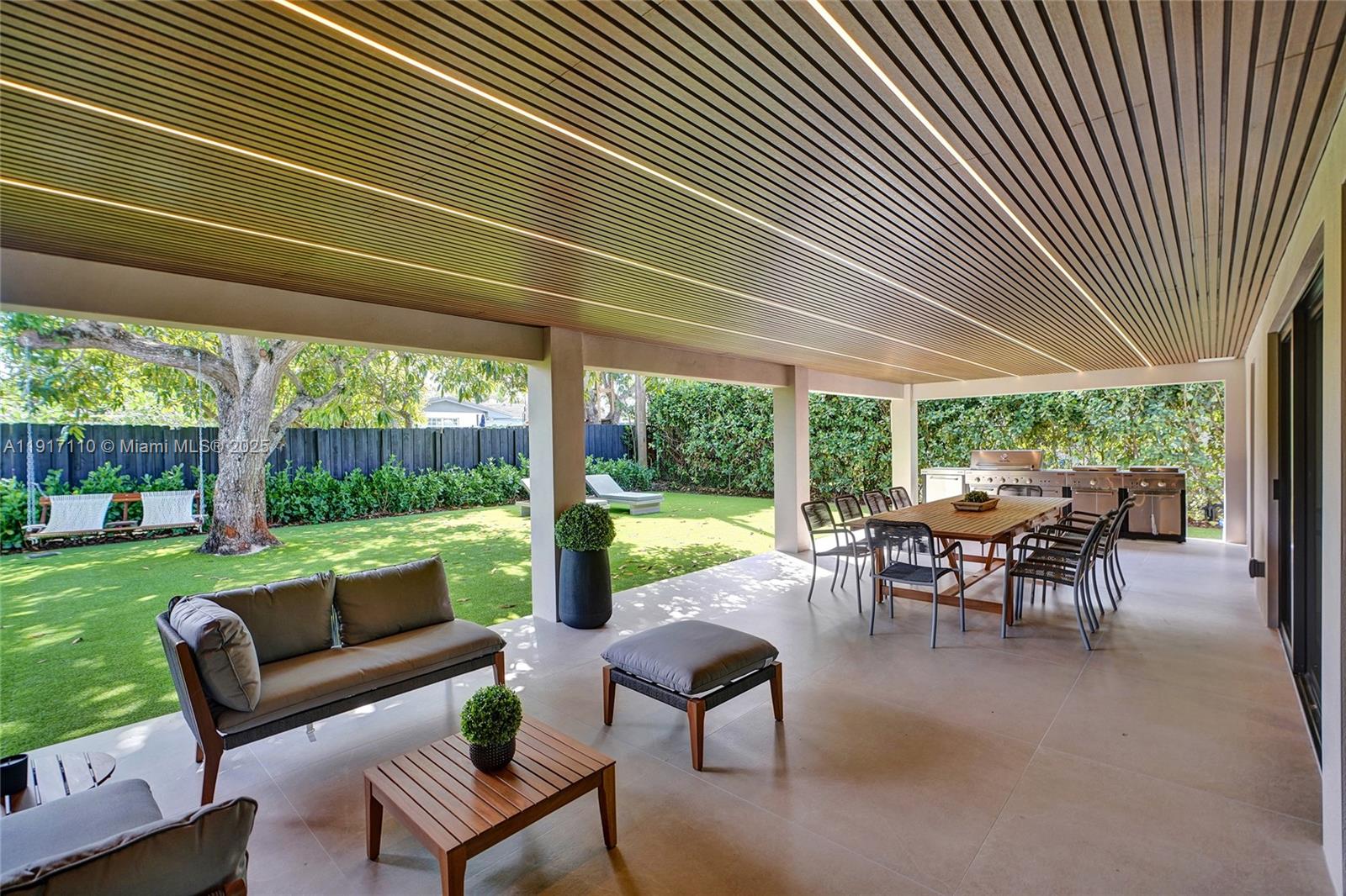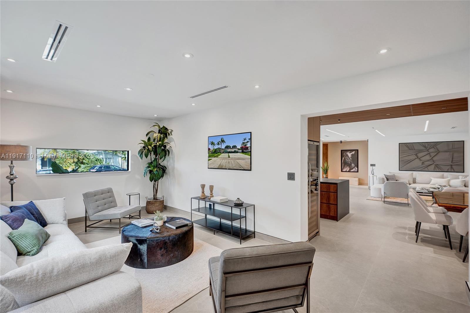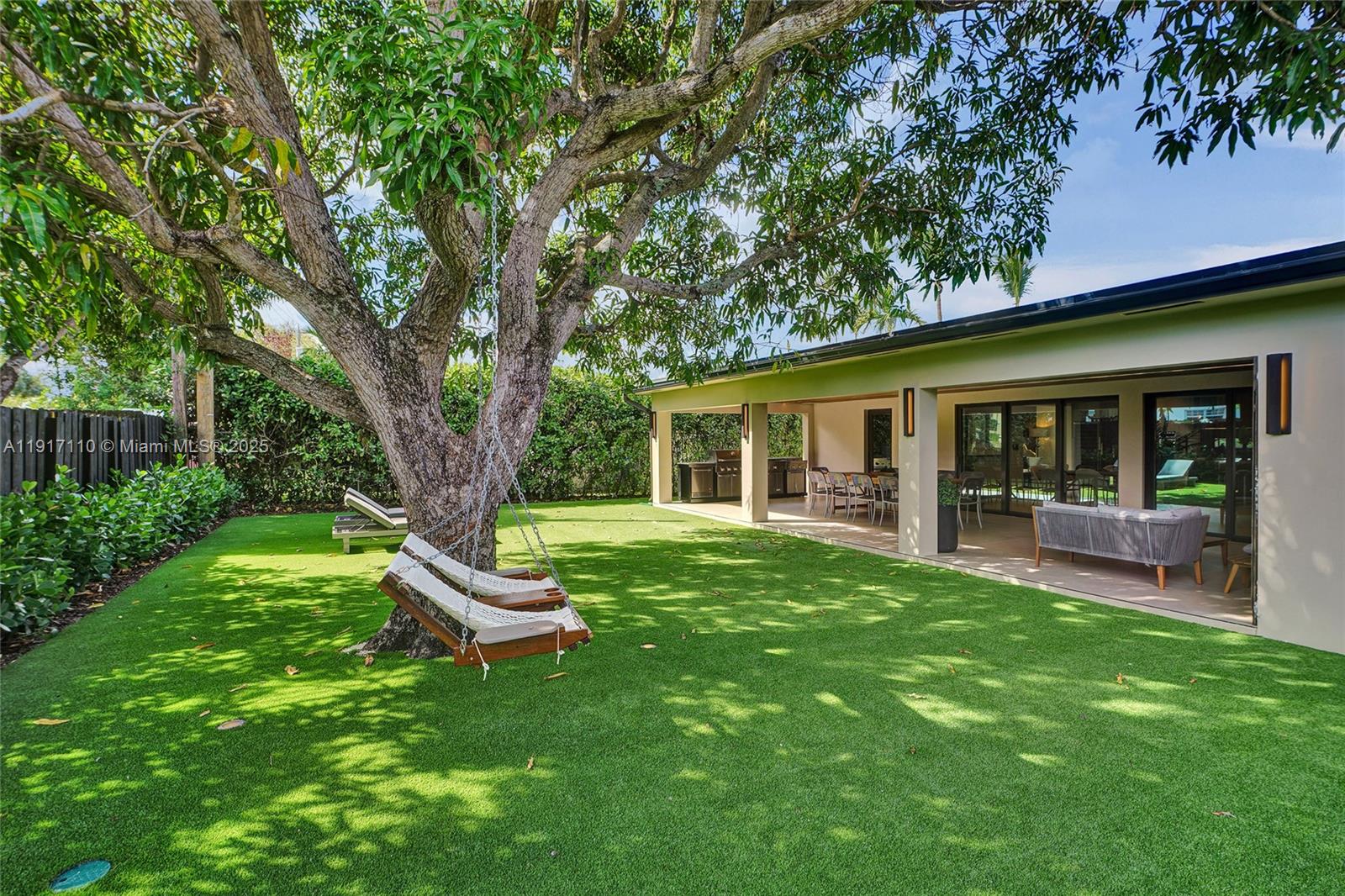 Stunning, fully remodeled modern home featuring clean architectural lines, warm natural tones, and top-quality finishes throughout. The open-concept layout highlights a sleek Italian-style kitchen with custom wood cabinetry, quartz countertops, and top-of-the-line appliances, including stainless steel appliances. This elegant residence features impact-resistant windows and doors, Italian-built-in closets, large porcelain floors, high ceilings, and designer LED lighting. The spacious living and dining areas are surrounded by glass sliders that fill the home with natural light and create a perfect indoor-outdoor flow. The outdoor space is designed for entertaining, featuring a built-in BBQ, artificial grass, and beautifully landscaped gardens. Every detail combines luxury and functionality