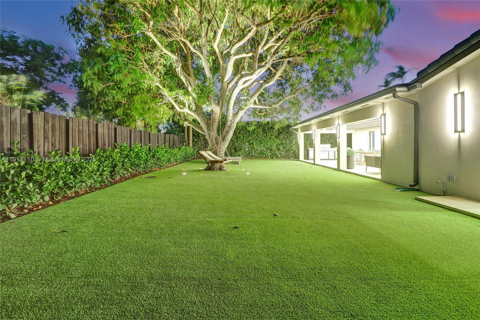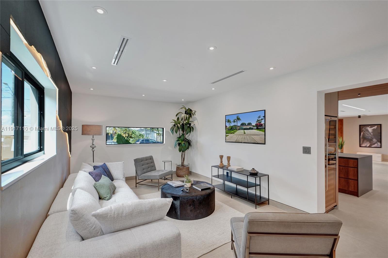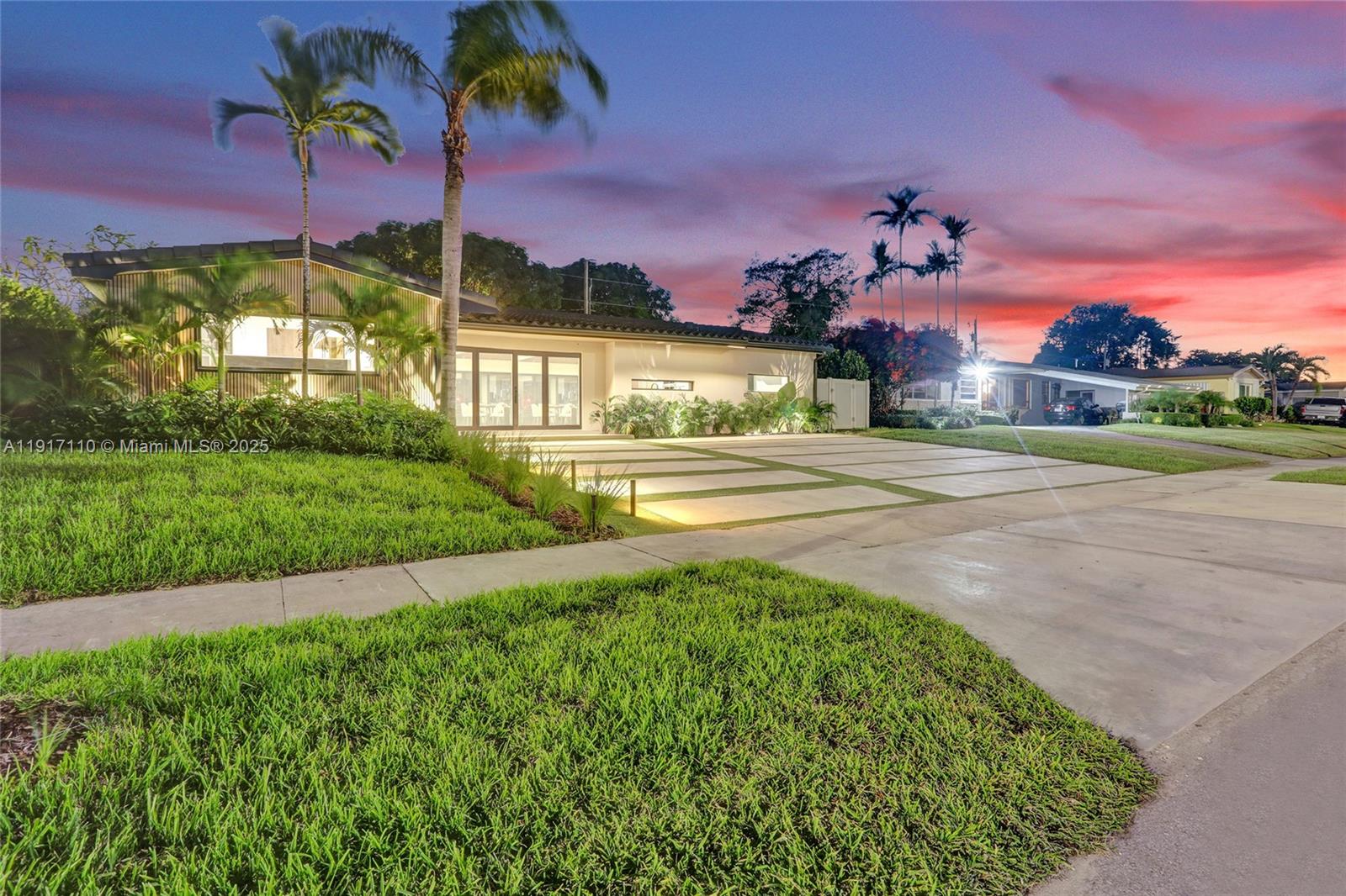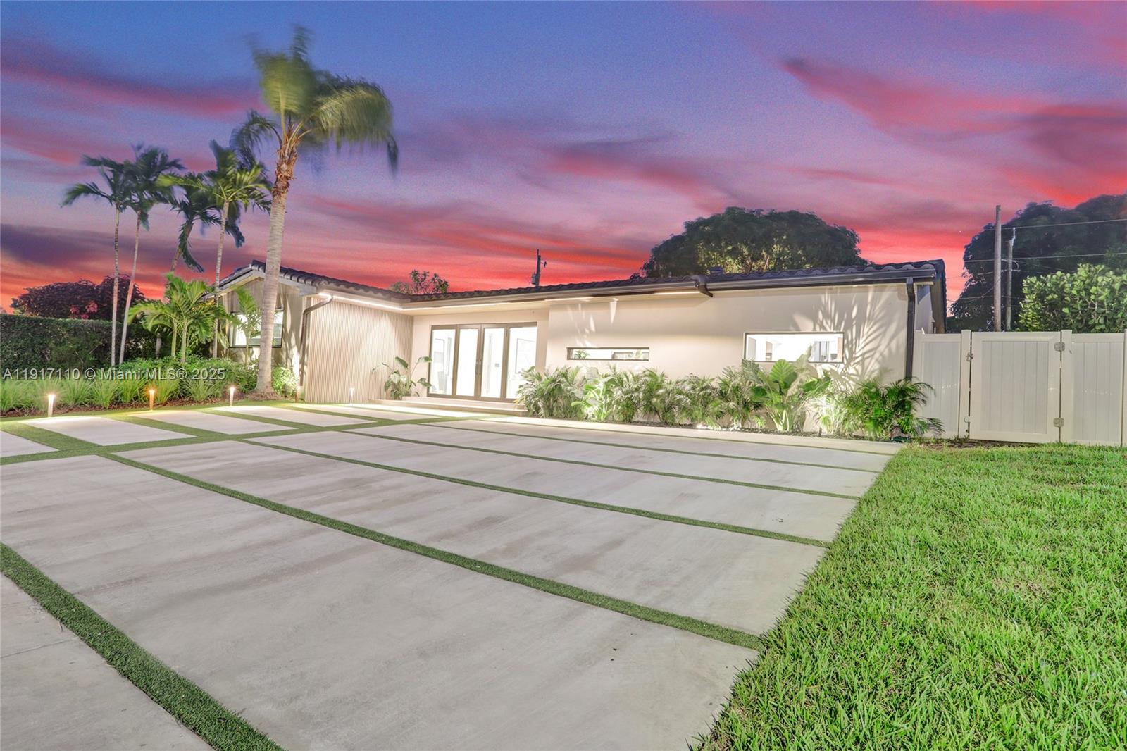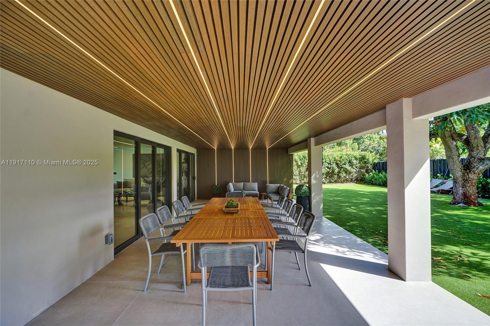 Stunning, fully remodeled modern home featuring clean architectural lines, warm natural tones, and top-quality finishes throughout. The open-concept layout highlights a sleek Italian-style kitchen with custom wood cabinetry, quartz countertops, and top-of-the-line appliances, including stainless steel appliances. This elegant residence features impact-resistant windows and doors, Italian-built-in closets, large porcelain floors, high ceilings, and designer LED lighting. The spacious living and dining areas are surrounded by glass sliders that fill the home with natural light and create a perfect indoor-outdoor flow. The outdoor space is designed for entertaining, featuring a built-in BBQ, artificial grass, and beautifully landscaped gardens. Every detail combines luxury and functionality